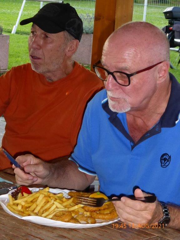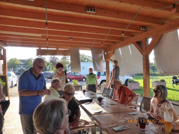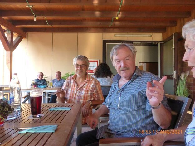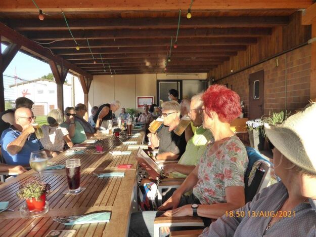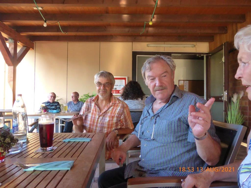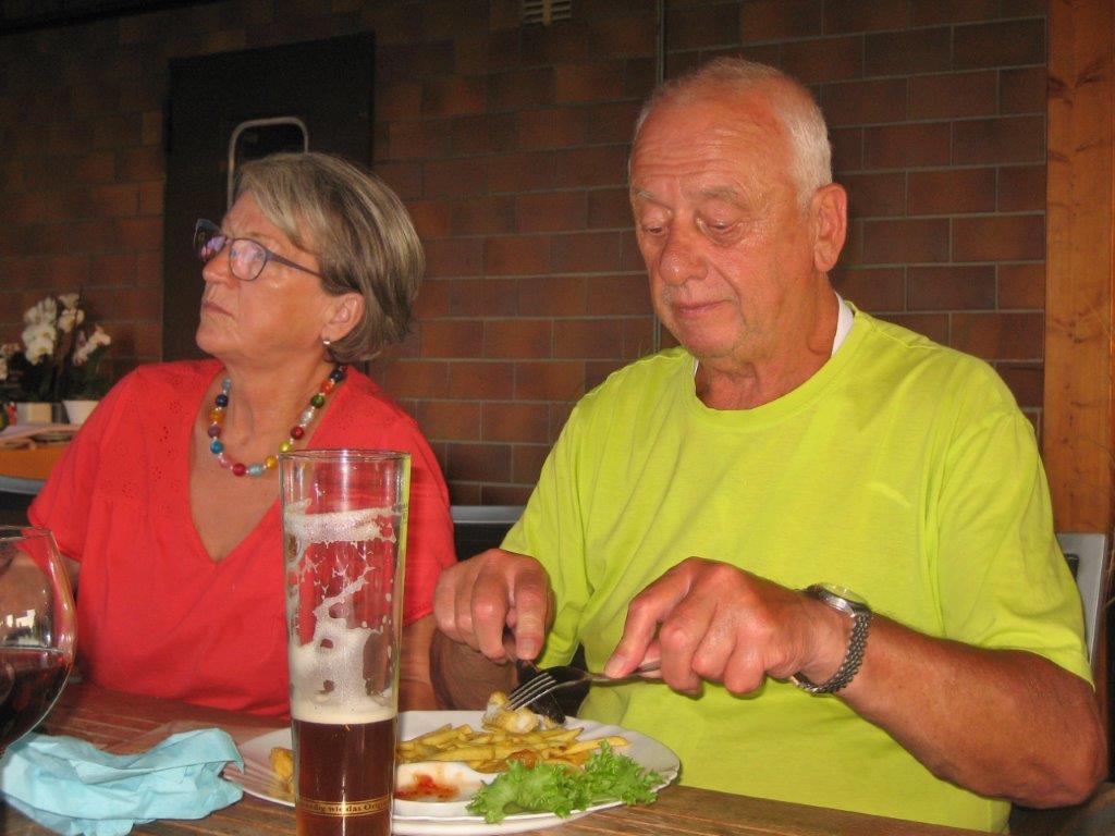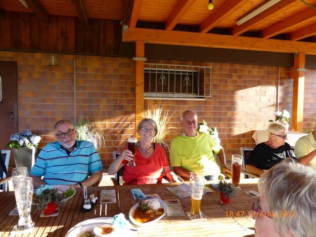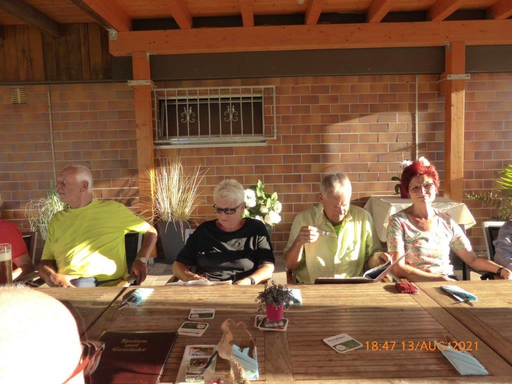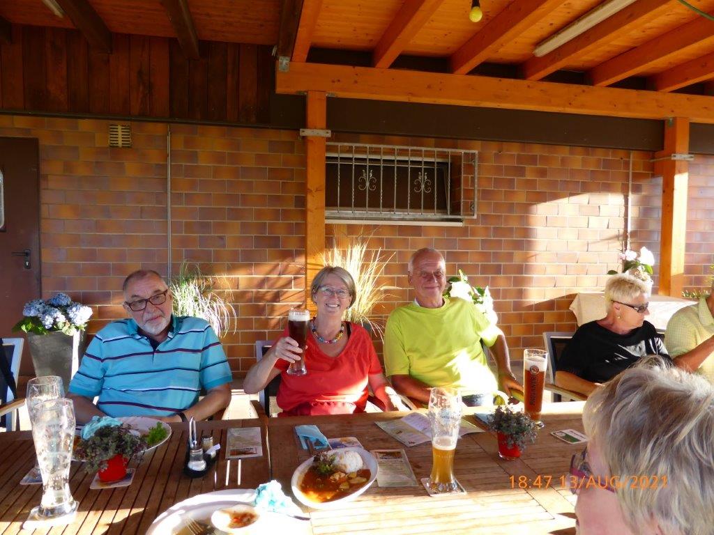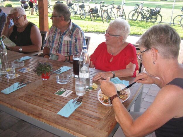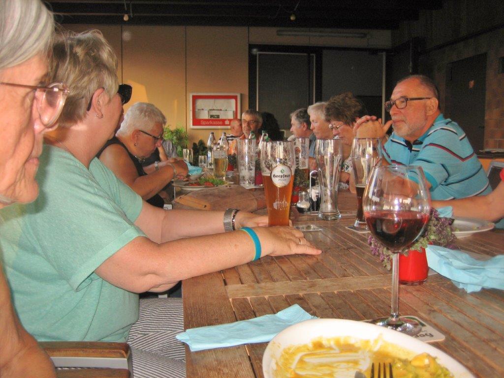 Einige Nichtradler warteten schon auf die Gruppe und schnell wurden die reservierten Plätze eingenommen und die Getränke bei Vanny geordert. Heiß verdient war das kühle Nass und ließ die Strapazen der schweißtreibenden Tour schnell vergessen. Mit leckeren Gerichten wurden dann die Energiespeicher weiter aufgefüllt und bei angeregter Unterhaltung verging schnell die Zeit. Schön war das gesellige Beisammensein, das sich jedoch zu fortgeschrittener Stunde wegen den zahlreich anrückenden Schnaken jäh auflöste.