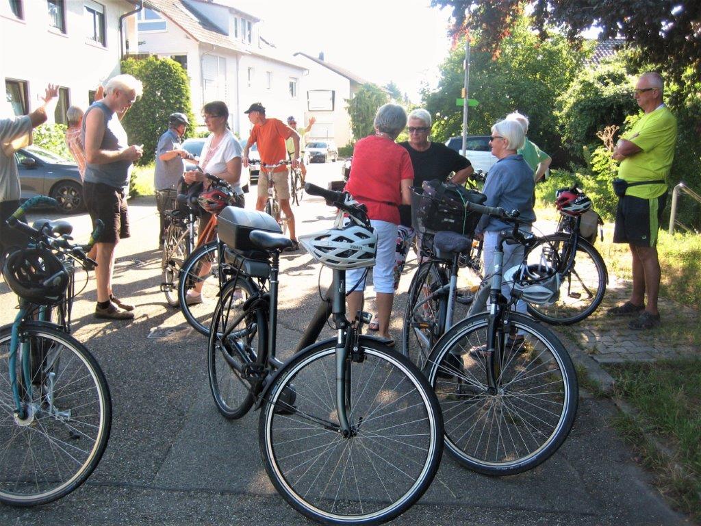 wird immer gerne angenommen. Trotz brutaler Schwüle fanden sich ca. 20 Radlerinnen und Radler am Sammelpunkt über dem Erlich ein. Kurz nach 18.00 Uhr startete unser Radelführer Rainer mit der Gruppe in Richtung Hochstetter Sportplatz hinein in den Wald. Auch dort war die Hitze zu spüren, aber es ging eisern weiter, an der Heglach entlang über Wiesen und Felder nach Graben und dort in Richtung Liedolsheim und dann auf die Zielgerade Richtung Hochstetten. Dort wurde zum Einkehrschwung in den Biergarten beim Turnhallenrestaurant des TV Hochstetten angesetzt.