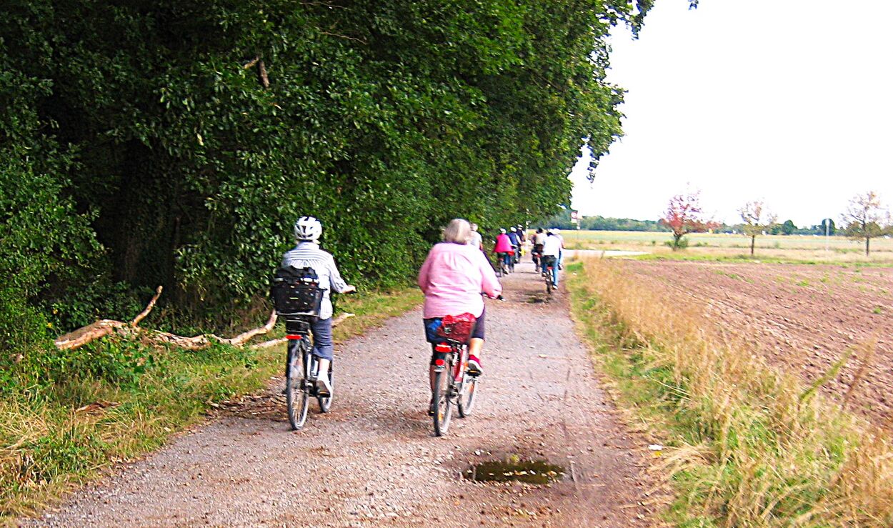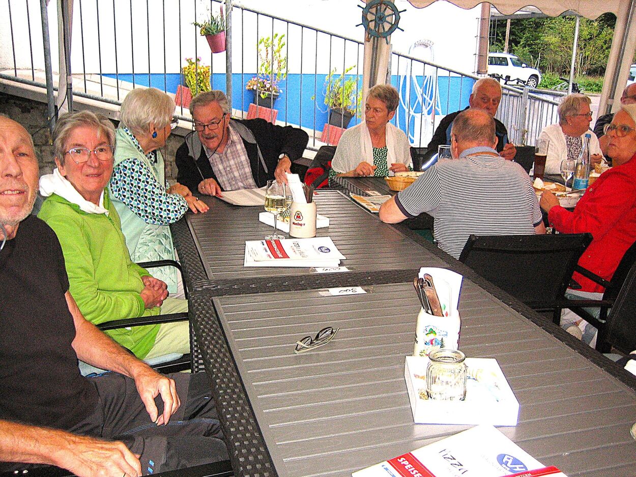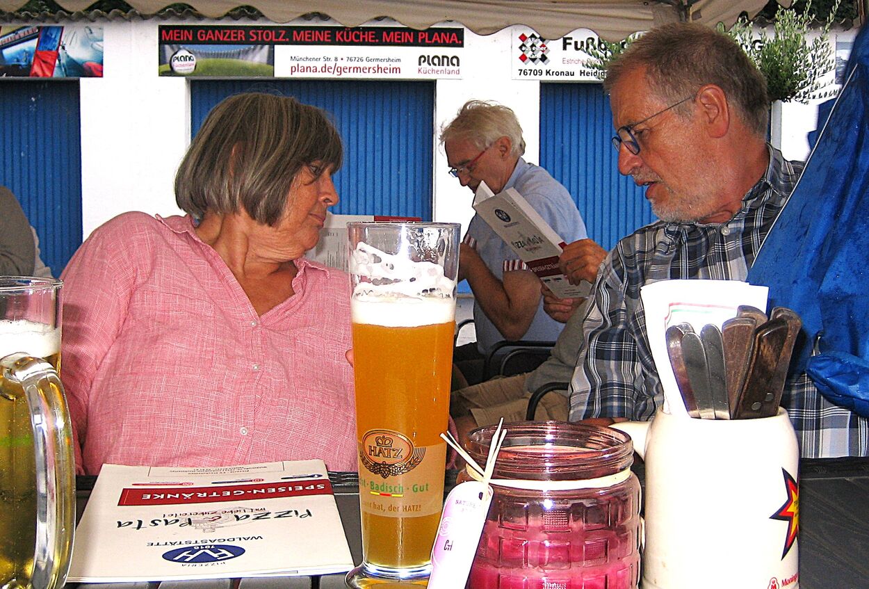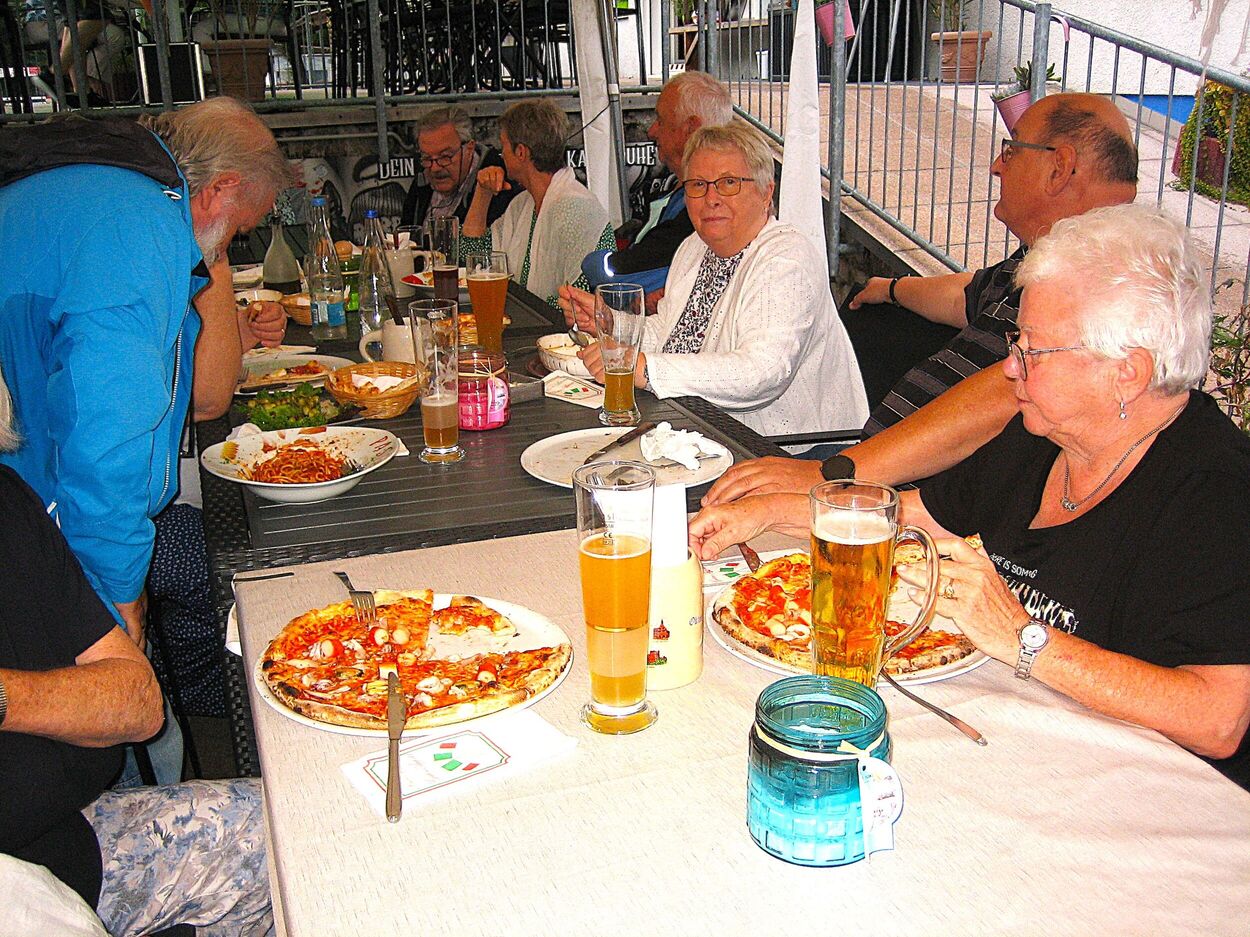 Am letzten Freitag im August startete unsere zweite Ferienradtour. Sie führte uns bei gemütlichem Tempo durch den Hardtwald. Zunächst Richtung Fußballplatz Linkenheim, vorbei am KIT-Campus Nord nach Friedrichstal/Schöneichenjagen. Dann ein Stück die Friedrichstaler Allee nordwärts, an der Bahnlinie entlang um dann über den Reiterplatz via „Altlielser Weg“ unserem Ziel dem FVH Clubhaus zu Gürsel entgegen. Bei unserer 12-köpfigen Radelgruppe befanden sich auch zwei „Heimatforscher“, die plötzlich abhanden kamen. Sie gingen, obwohl am Ende der Gruppe fahrend, ihrem Hobby nach und begutachteten den alten Römerweg, die zugehörige Infotafel und dokumentierten diese mit Fotos. Dadurch verloren sie den Anschluss. Aber Heimatforscher wären keine Heimatforscher, wären sie nicht auch mit den heimatlichen Waldwegen vertraut. Die Gruppe indes wartete auf die Beiden, die jedoch eine andere Route nahmen. Durch diese ungewollte Pause von etwa zehn Minuten bekam das „Hauptfeld“ noch eine kleine Dusche ab, denn es begann zu regnen.