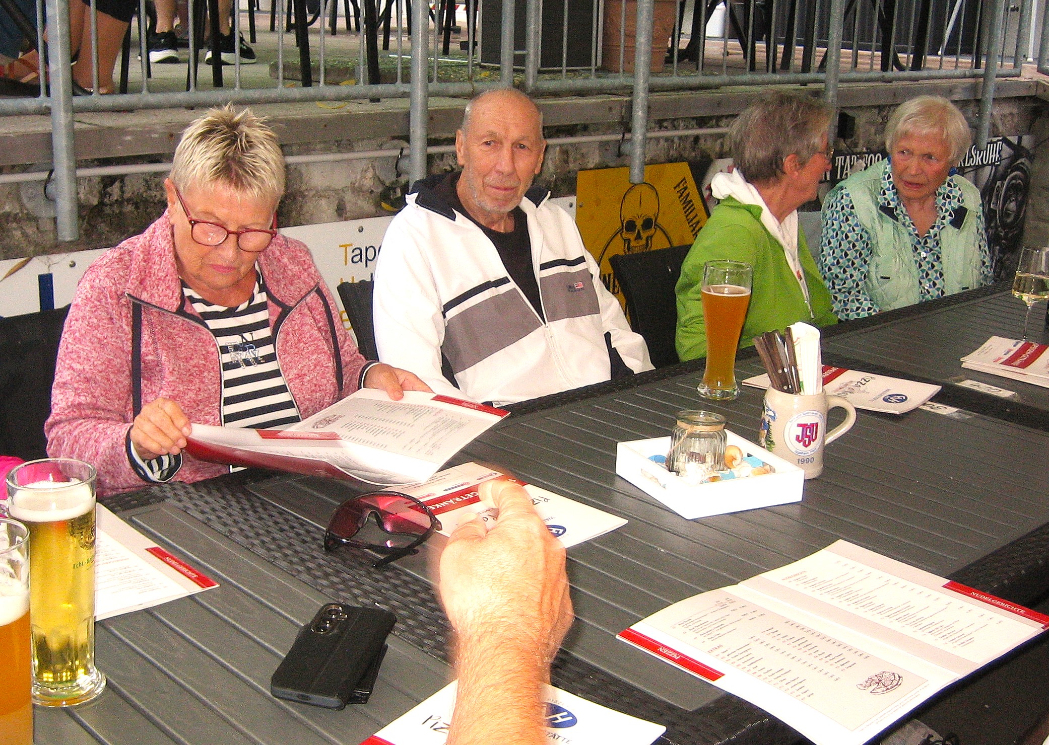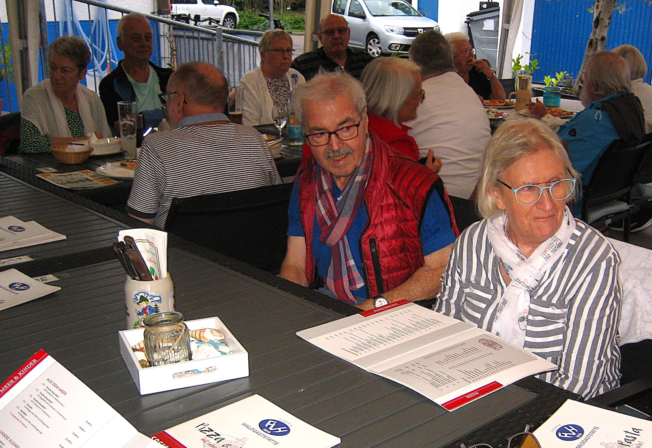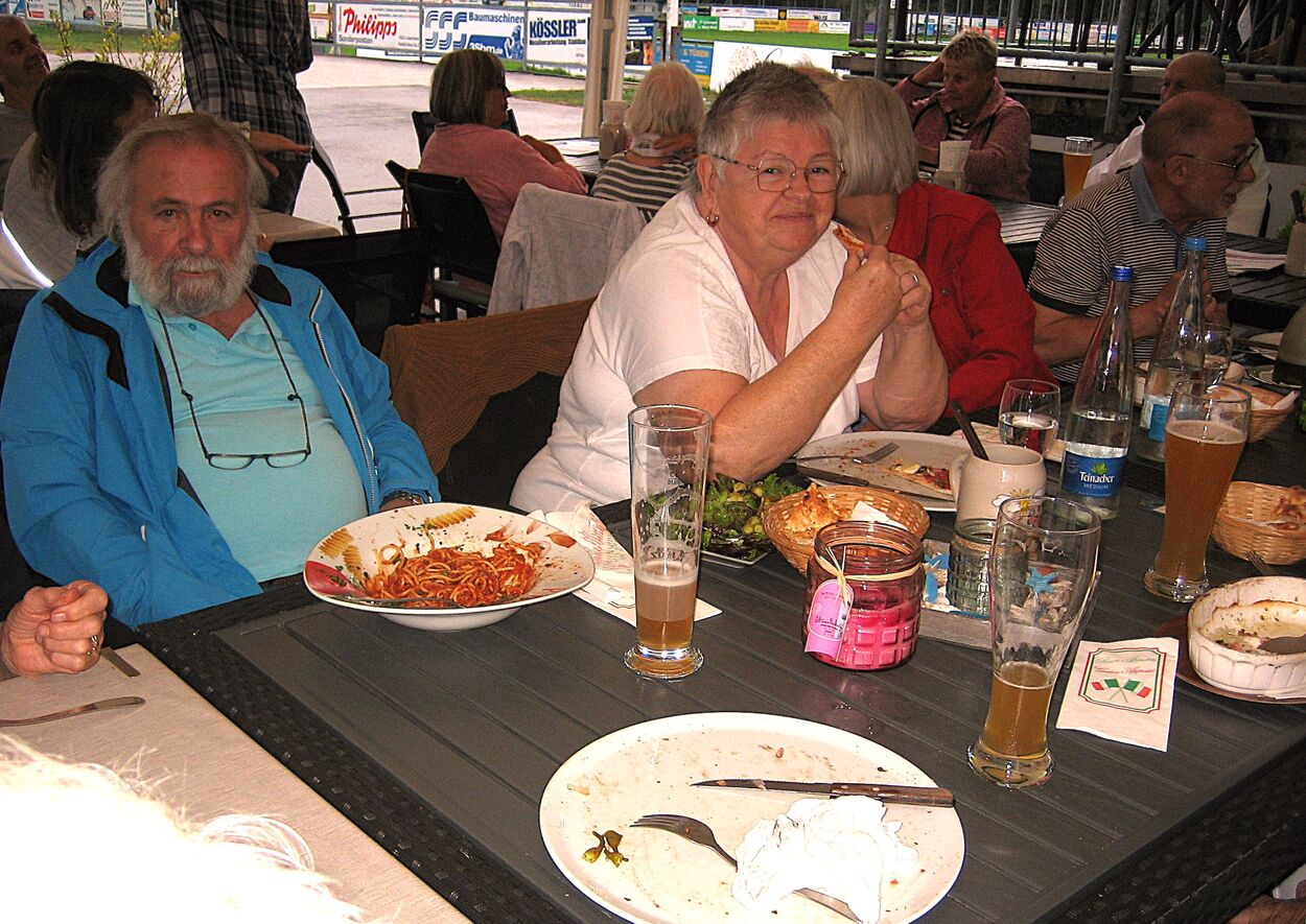 Am letzten Freitag im August startete unsere zweite Ferienradtour. Sie führte uns bei gemütlichem Tempo durch den Hardtwald. Zunächst Richtung Fußballplatz Linkenheim, vorbei am KIT-Campus Nord nach Friedrichstal/Schöneichenjagen. Dann ein Stück die Friedrichstaler Allee nordwärts, an der Bahnlinie entlang um dann über den Reiterplatz via „Altlielser Weg“ unserem Ziel dem FVH Clubhaus zu Gürsel entgegen. Bei unserer 12-köpfigen Radelgruppe befanden sich auch zwei „Heimatforscher“, die plötzlich abhanden kamen. Sie gingen, obwohl am Ende der Gruppe fahrend, ihrem Hobby nach und begutachteten den alten Römerweg, die zugehörige Infotafel und dokumentierten diese mit Fotos. Dadurch verloren sie den Anschluss. Aber Heimatforscher wären keine Heimatforscher, wären sie nicht auch mit den heimatlichen Waldwegen vertraut. Die Gruppe indes wartete auf die Beiden, die jedoch eine andere Route nahmen. Durch diese ungewollte Pause von etwa zehn Minuten bekam das „Hauptfeld“ noch eine kleine Dusche ab, denn es begann zu regnen.