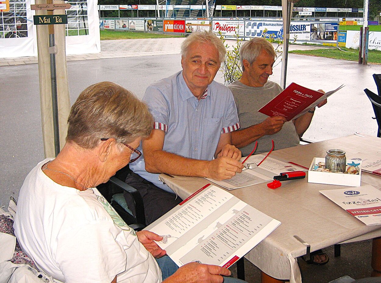 Wir fanden Platz unter einem kleinen Zelt, wo uns schon 14 weitere Sängerinnen und Sänger erwarteten. Es wurde ein schöner gemütlicher Abend mit angenehmen Gesprächen, gutem Essen und der Vorfreude auf die erste Singstunde nach den Ferien.