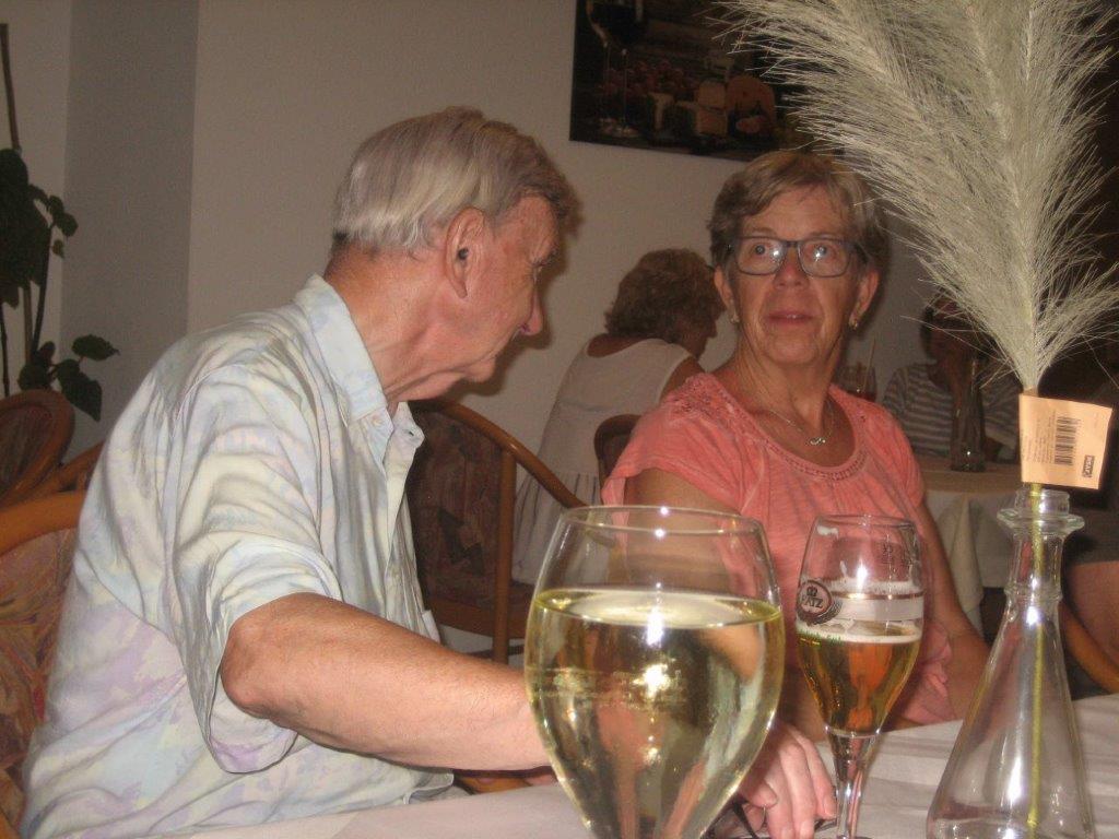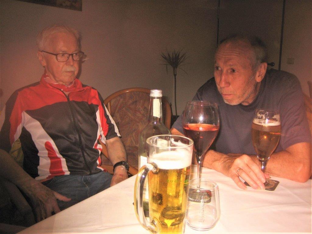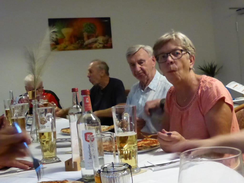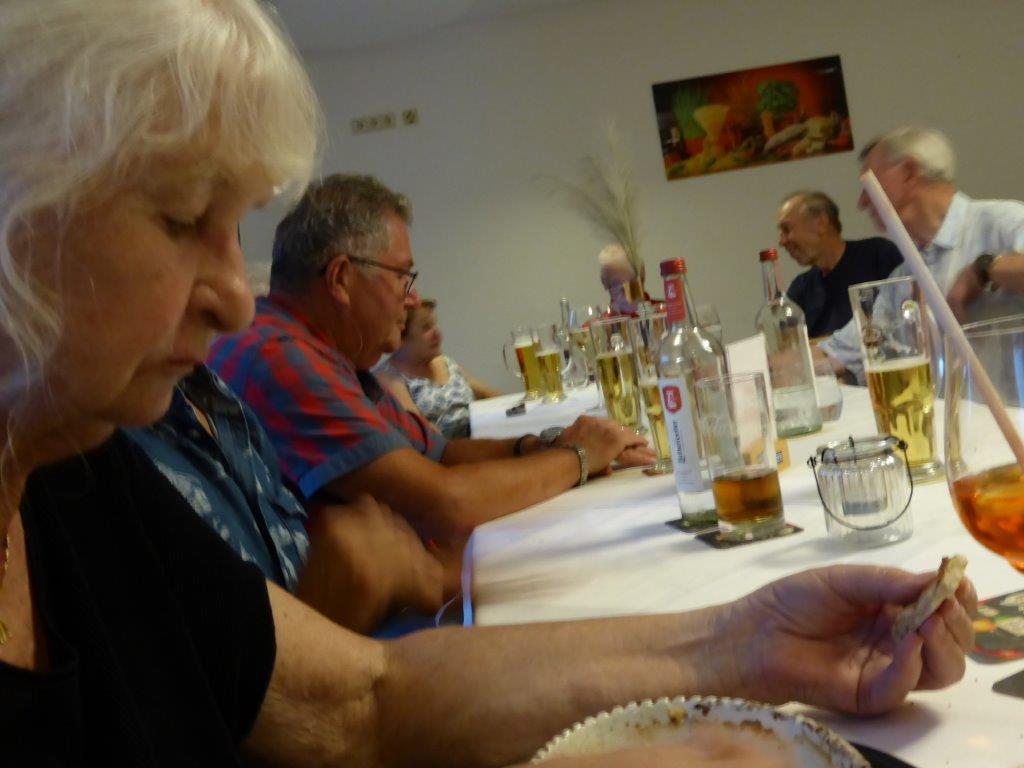 wurde wieder gut angenommen. Obwohl die Wetter-Apps dieses Mal sehr unterschiedliche Prognosen stellten, regnet es um 18.00 Uhr, oder nicht, trauten sich letztendlich neun Radler*innen an den Start. Und die Gruppe hatte Glück, eine schöne Tour durch Feld und Flur und durch den Hardtwald, mit dem Restaurant beim FVH als Ziel, war optimal getimet! Als die Radelgruppe zum Einkehrschwung ansetzte, donnerte es gewaltig und sie konnten gerade noch vor dem heftigen Regen die Räder parken und das Lokal erreichen. Mit einem Platz auf der Terrasse war es leider nichts, aber für den heiß ersehnten Regen, nahmen wir auch gerne im Innenraum des Lokals Platz. Dort warteten schon die Nichtradler*innen und die Gruppe wuchs auf 18 Personen an. Bei leckeren Speisen und Getränken war es wieder ein unterhaltsamer Abend und hier erneut ein herzliches Danke an Rainer, der diese schönen Touren führt.