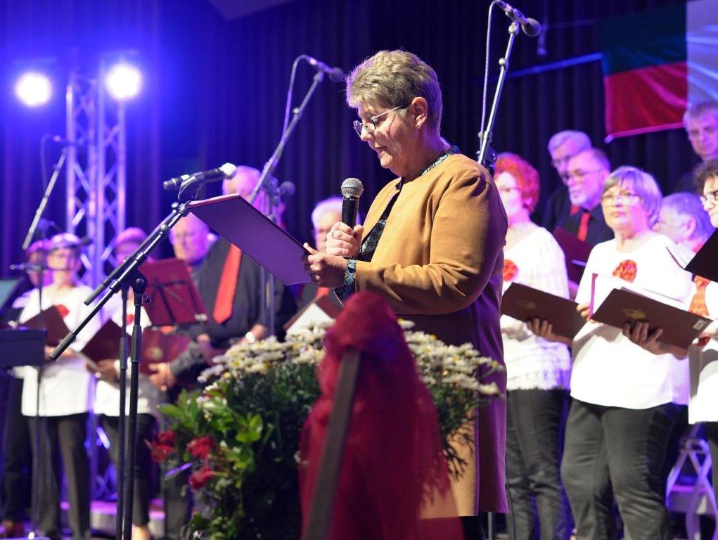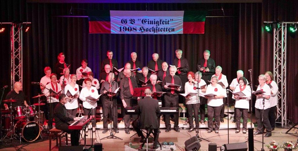Pünktlich traten wir auf die Bühne und es konnte losgehn. Unsere frühere Sängerin Biggi Brüstle führte wieder gekonnt durchs Programm, danke Biggi. Sie begrüßte das Publikum, darunter zu unserer Freude, auch einige Ehrengäste und dann eröffneten wir das Konzert mit dem Titel „Lieder sind die besten Freunde“. Unter diesem Motto fand auch der Abend statt, bei dem die Einigkeit mit drei Liedern begann, die bei den Anwesenden gut ankamen. Die Harmonika-Freunde, unter der Leitung von Denise Weindel, folgten mit bekannten Auszügen aus dem Starlight-Express und SwissSka, einem flotten Stück von H.-G. Kölz, bevor der GV-Einigkeit wieder die Bühne betrat mit den nächsten drei „Stücken: Killing me softly“, „Gabriellas Lied“, bei dem unsere junge Kristin als Solistin beeindruckte, dann folgte „Time to say goodbye“. Natürlich noch zu früh, dieses Konzert zu beenden, so folgte gemeinsam mit dem Akkordeonorchester das „Hallelujah“ von Leonard Cohen. Mit viel Beifall bedacht, ging es dann in die Pause, um sich dort mit lecker gerichteten Brötchen, kleinen Brezeln und verschiedenen Getränken zu stärken. Die Konversation und Geselligkeit konnte endlich wieder gepflegt werden, das hat doch in der Pandemiezeit sehr gefehlt.