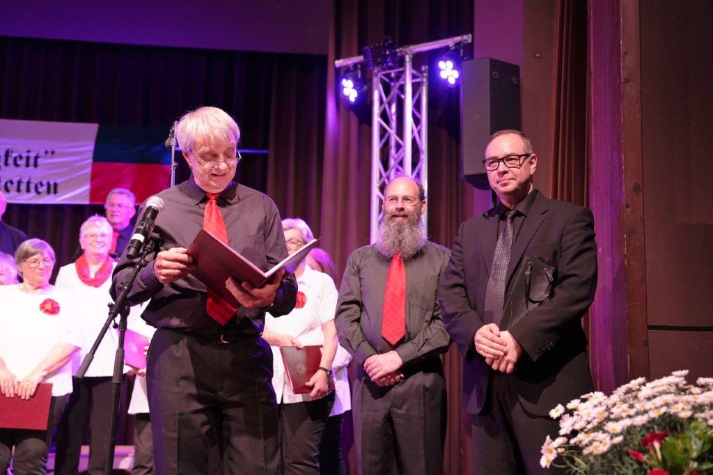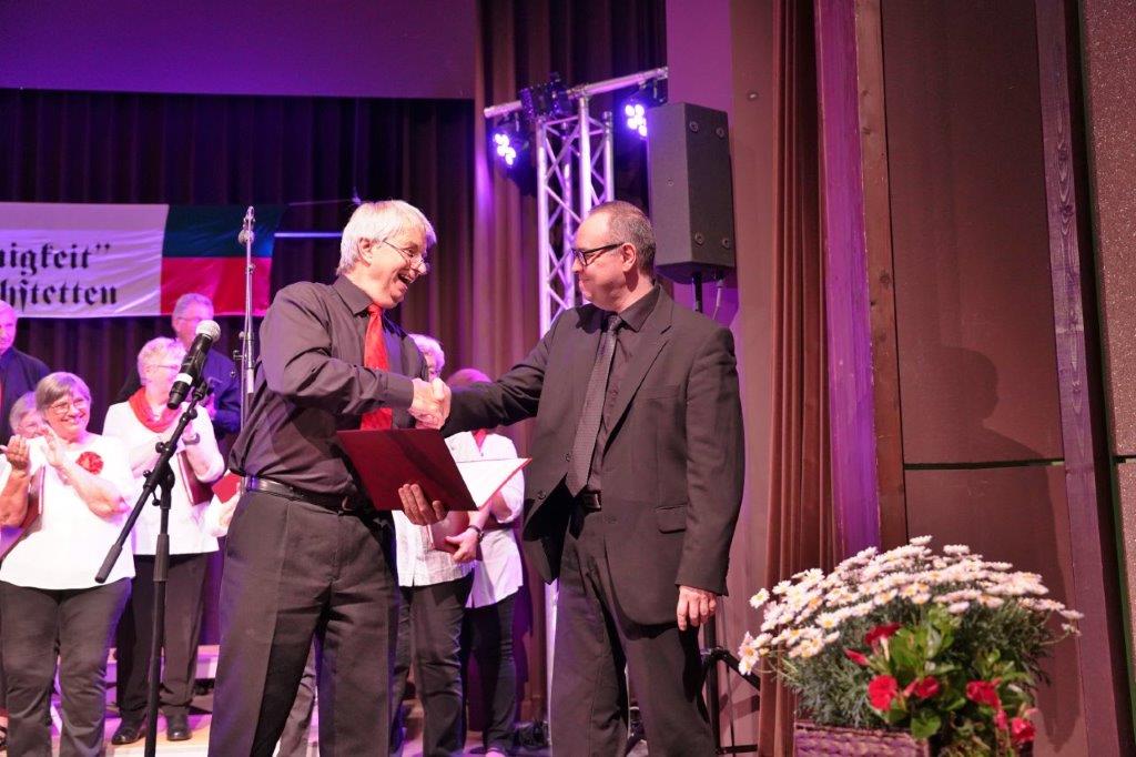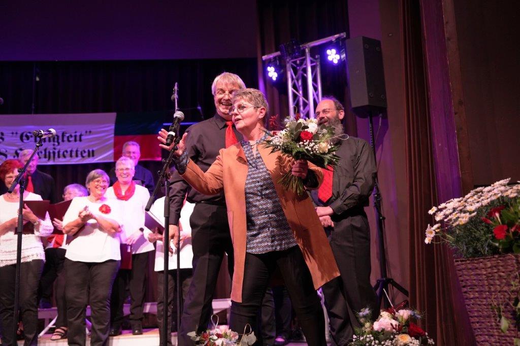 Ein Danke an unsere Harmonika-Freunde unter der Leitung von Denise Weindel, die das Programm wunderbar mitgestalteten, unserem Chorleiter Aldo Martinez für seine Geduld bei den Proben, seinen Musikern, dem Tontechniker und dem Hausmeister vor Ort. Ein Lob an Klaus Eichsteller für die schönen Veranstaltungsflyer, unserem Küchenteam samt Planung und Arbeiten im Vorfeld, unserer Ute für die Deko und Blumenarrangements, denen, die im Foyer im Einsatz waren, unserer großartigen Moderatorin Biggi und unserem Vorstand, der Mann im Hintergrund mit dem Überblick, kurz, allen Beteiligten ein großes Dankeschön für den Einsatz vor, auf und hinter der Bühne. Es war ein wunderbarer Abend, den wir gemeinsam mit den Harmonika-Freunden bei einem kleinen Imbiss und Getränken ausklingen ließen. Die Bestuhlung des Bürgerhauses sollte danach aufgeräumt werden, hier war unser Sänger Rolf Alber schneller, danke Rolf. Montags rückten wieder zahlreiche Helfer an, so konnten die Restarbeiten noch gut bewältigt werden – ein Danke euch allen!