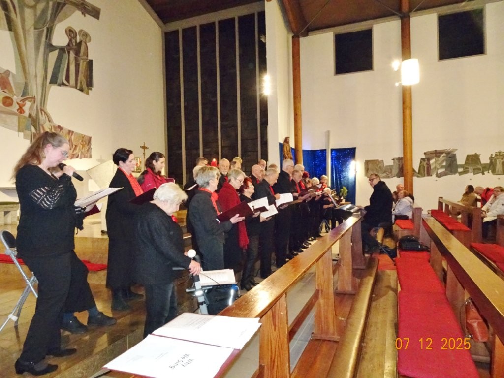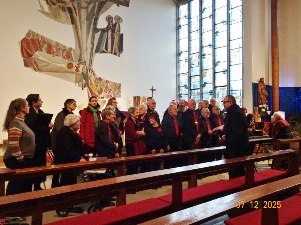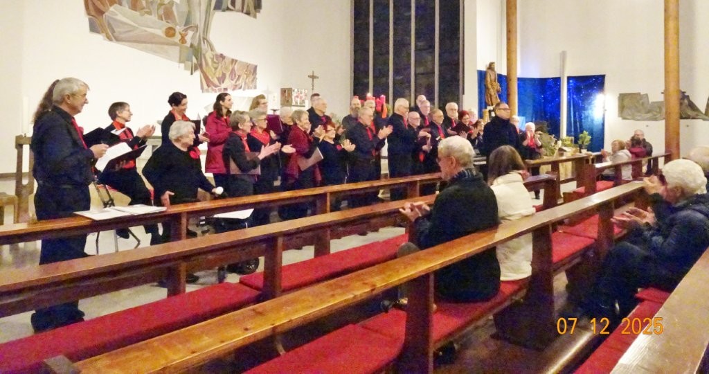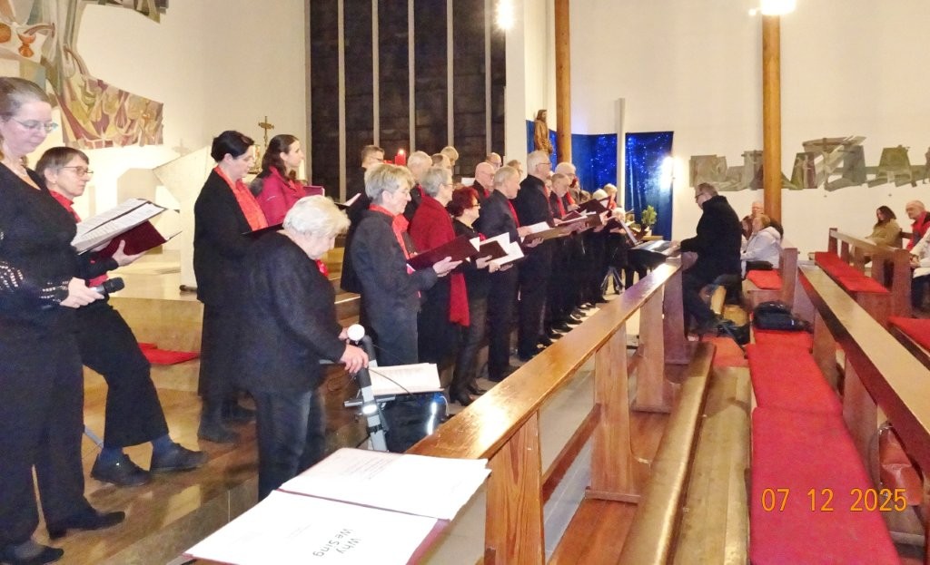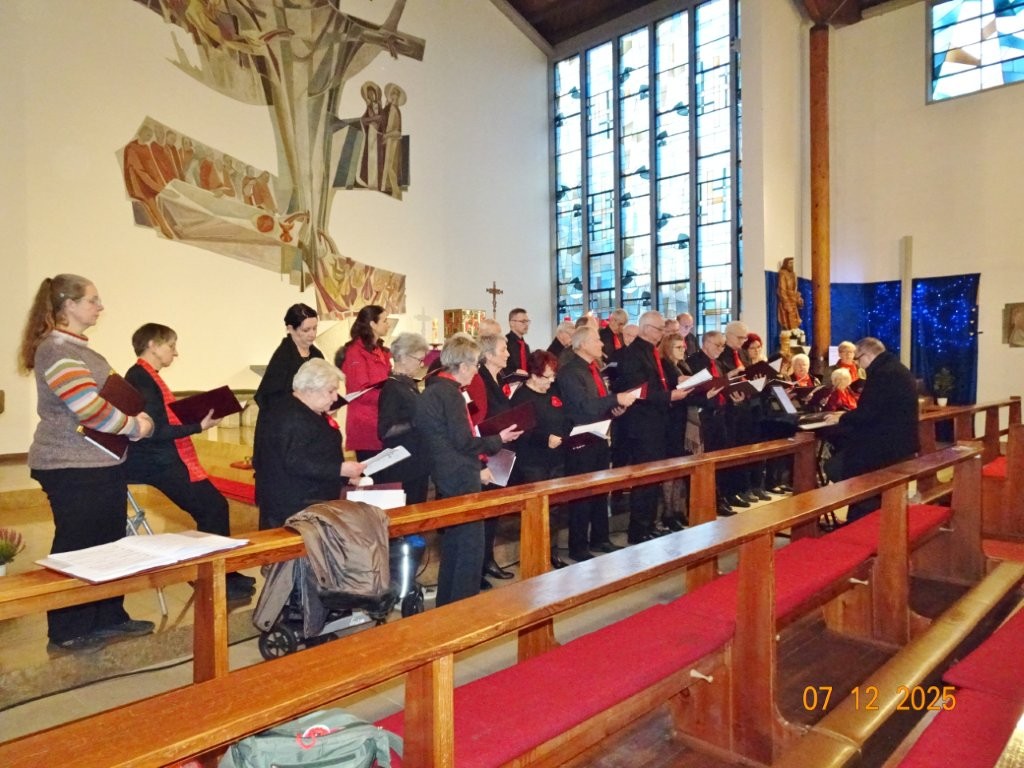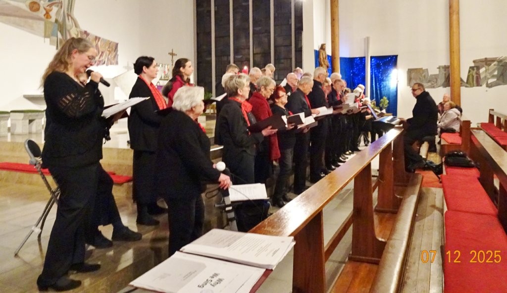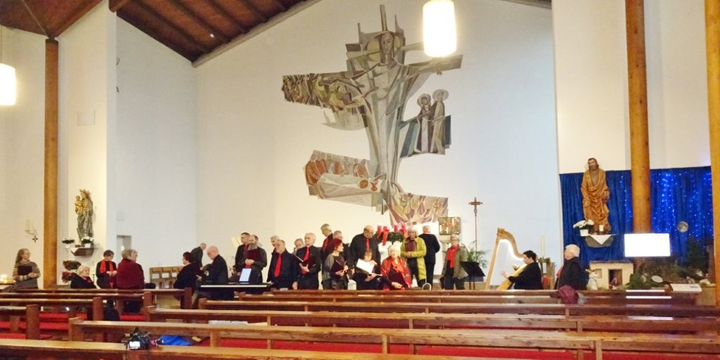 Sonntags am 7. Dezember traf sich unser Chor bereits um 15.15 Uhr in der katholischen Kirche zur Stellprobe und zum Einsingen vor unserem Konzert. Unser Dirigent Aldo war etwas angeschlagen und wir fröstelten alle ein wenig in der kühlen Kirche, vielleicht auch ein wenig vor Aufregung, ob wohl alles klappen würde und ob genügend Besucher kämen. Die Sorge war unbegründet, die Besucher kamen und offensichtlich gefiel auch unsere Liedauswahl. Sie bestand aus internationalen Weihnachtsliedern und stimmungsvollem Harfenspiel unserer Sängerin Silke Stober. Sie hatte zwei Stücke ausgesucht, die gut in die Vorweihnachtszeit passten – ein Klangerlebnis der besonderen Art. Bei unseren Liedern waren auch weltliche Songs dabei wie "Why we sing", bei der unsere junge Solistin Kristin, unser Tenor Harald und unser Bass Hartmut brillierten und auch "Cantar" von Jay Althouse, das die Freude am Singen bestätigte. Hanne Hallers "Vater unser" und Bernd Stallmanns "Vom Flügel eines Engels berührt" fügten sich gut in die vorweihnachtliche Stimmung ein.