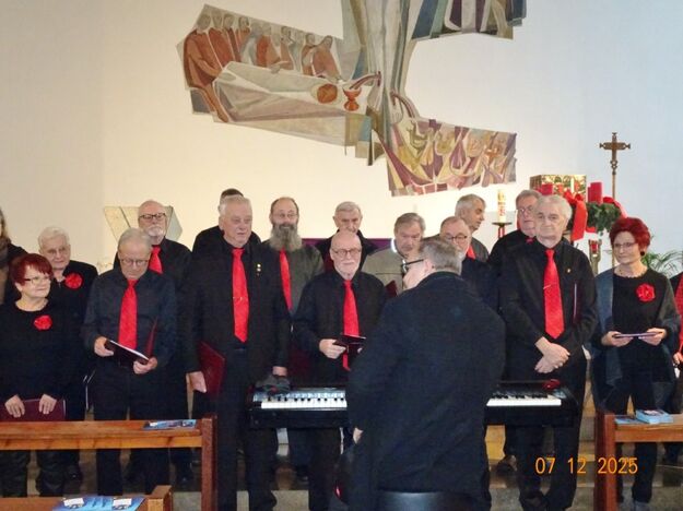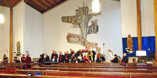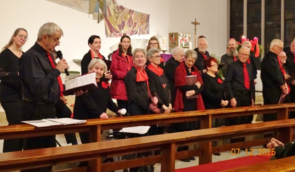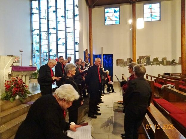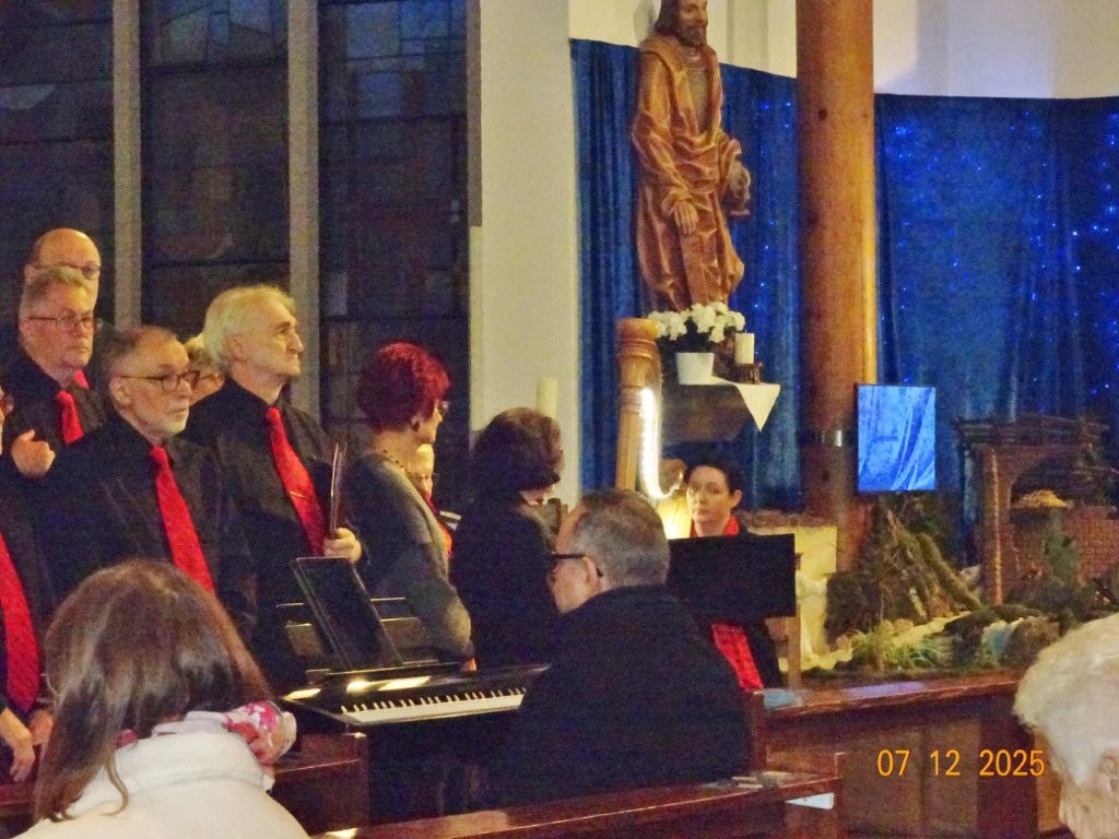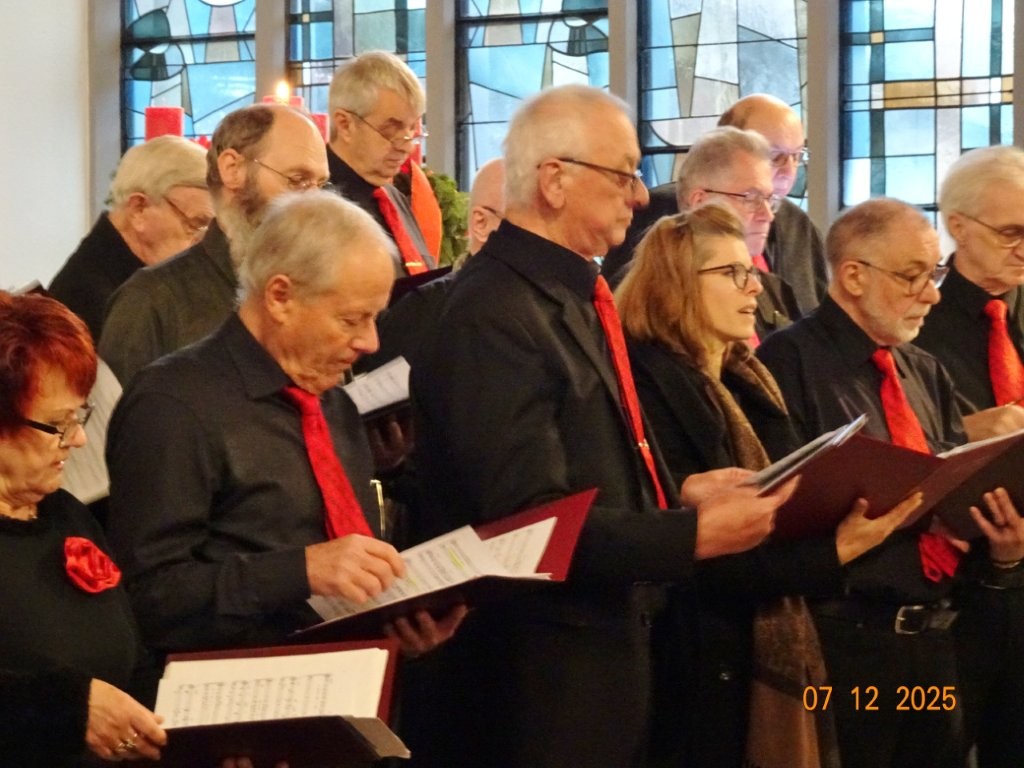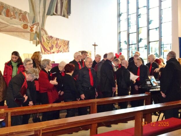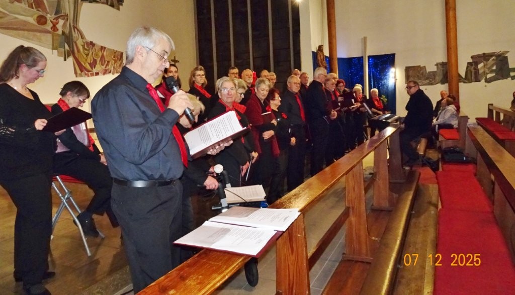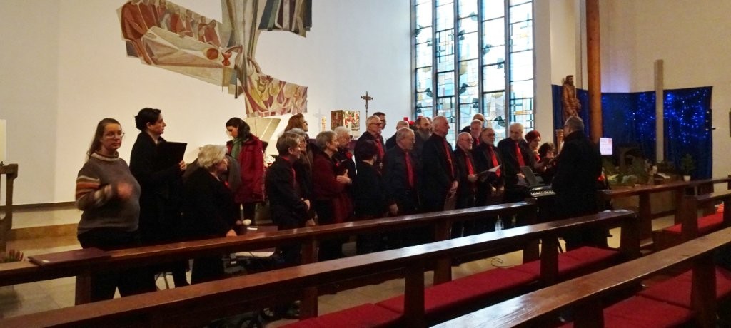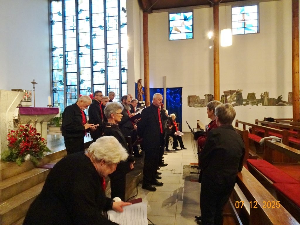 Sonntags am 7. Dezember traf sich unser Chor bereits um 15.15 Uhr in der katholischen Kirche zur Stellprobe und zum Einsingen vor unserem Konzert. Unser Dirigent Aldo war etwas angeschlagen und wir fröstelten alle ein wenig in der kühlen Kirche, vielleicht auch ein wenig vor Aufregung, ob wohl alles klappen würde und ob genügend Besucher kämen. Die Sorge war unbegründet, die Besucher kamen und offensichtlich gefiel auch unsere Liedauswahl. Sie bestand aus internationalen Weihnachtsliedern und stimmungsvollem Harfenspiel unserer Sängerin Silke Stober. Sie hatte zwei Stücke ausgesucht, die gut in die Vorweihnachtszeit passten – ein Klangerlebnis der besonderen Art. Bei unseren Liedern waren auch weltliche Songs dabei wie "Why we sing", bei der unsere junge Solistin Kristin, unser Tenor Harald und unser Bass Hartmut brillierten und auch "Cantar" von Jay Althouse, das die Freude am Singen bestätigte. Hanne Hallers "Vater unser" und Bernd Stallmanns "Vom Flügel eines Engels berührt" fügten sich gut in die vorweihnachtliche Stimmung ein.
