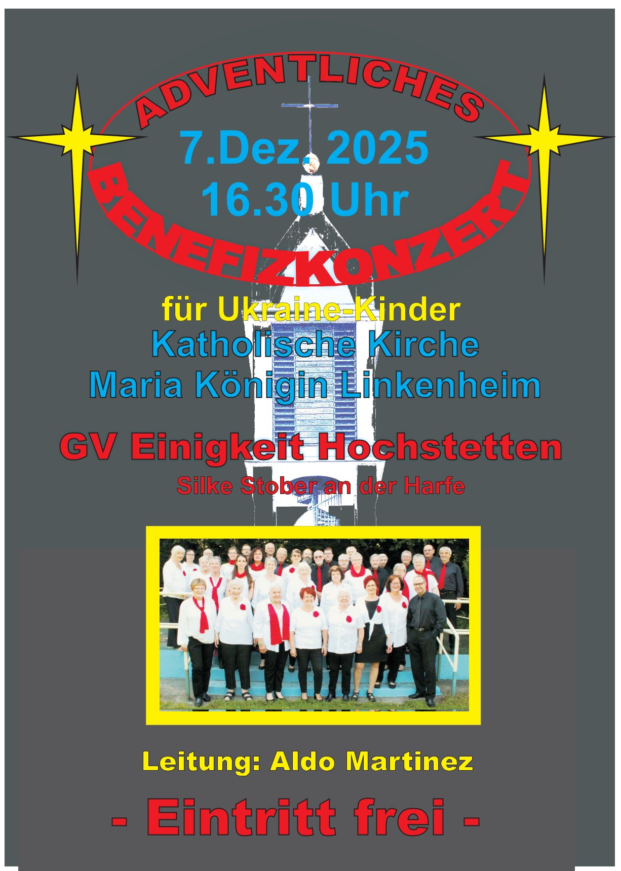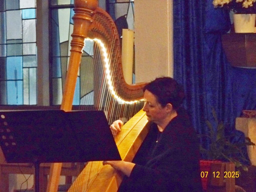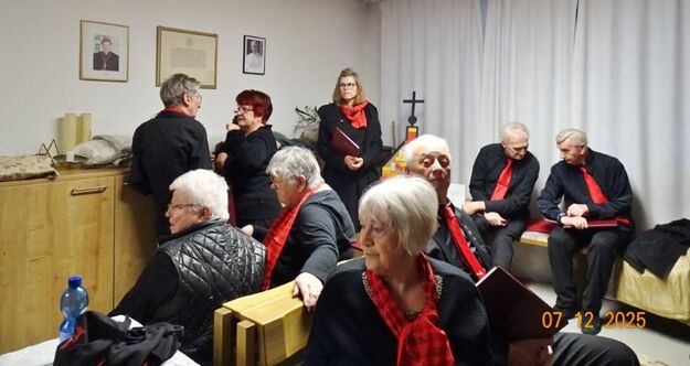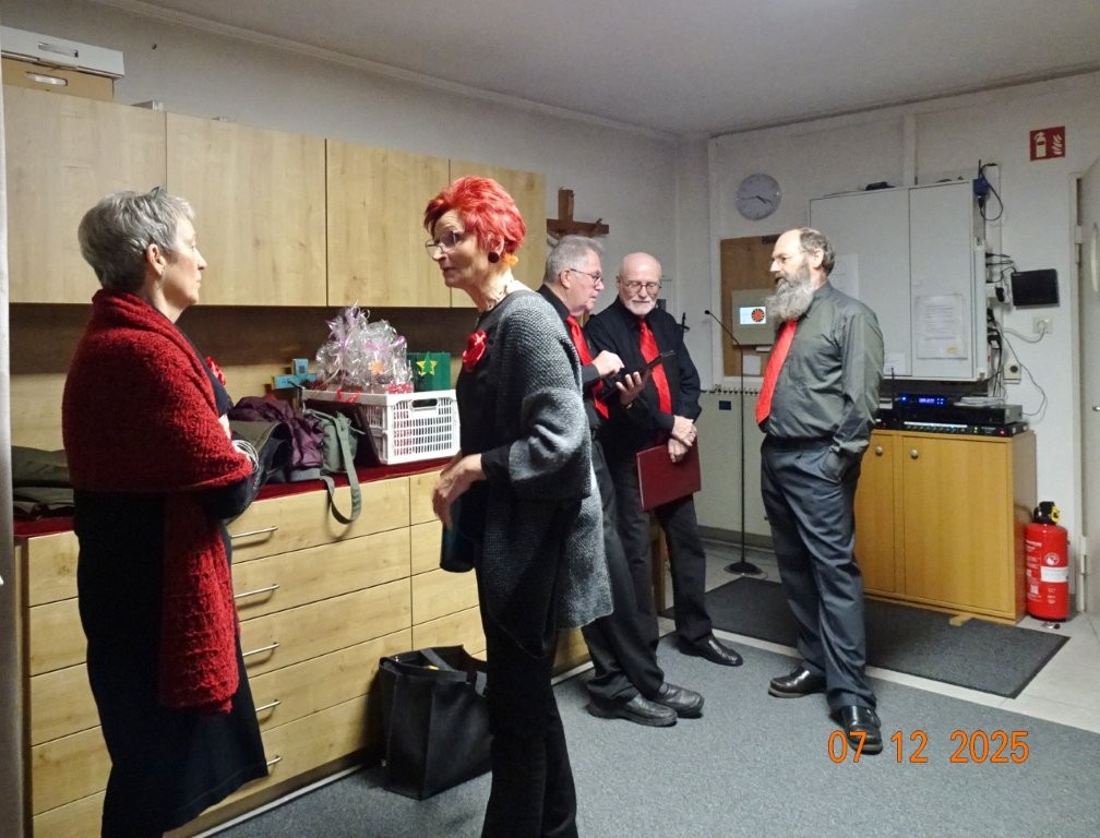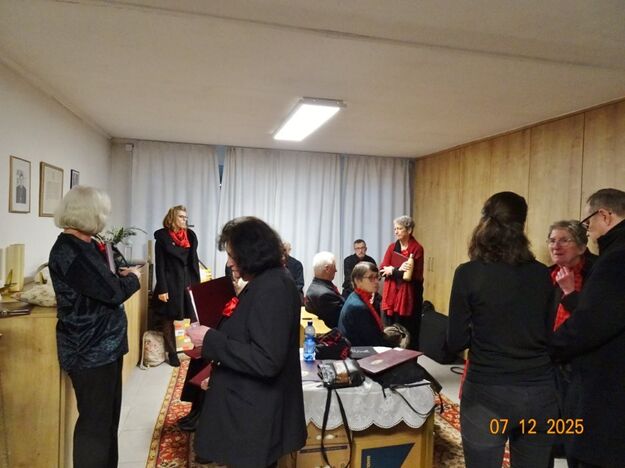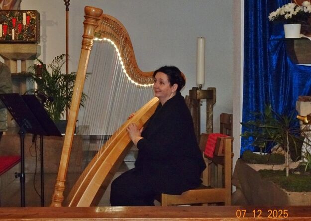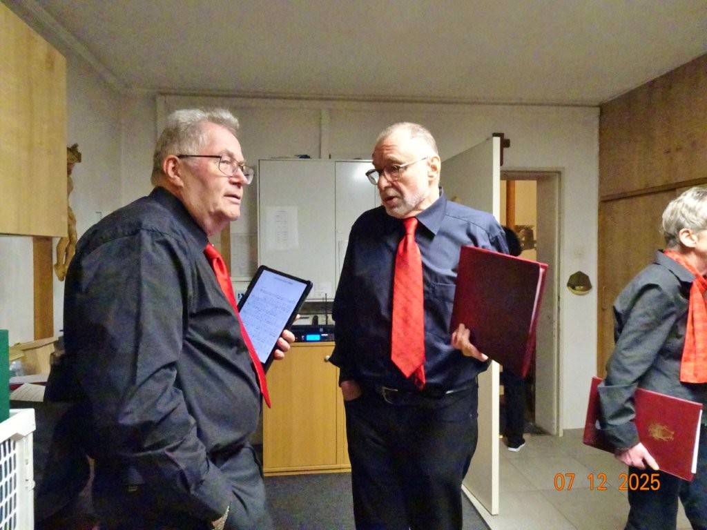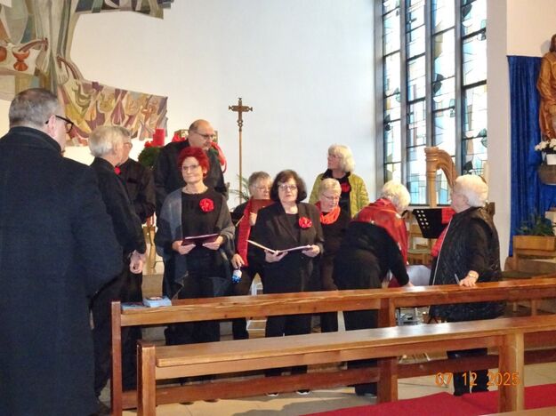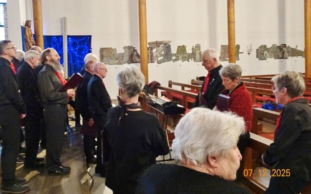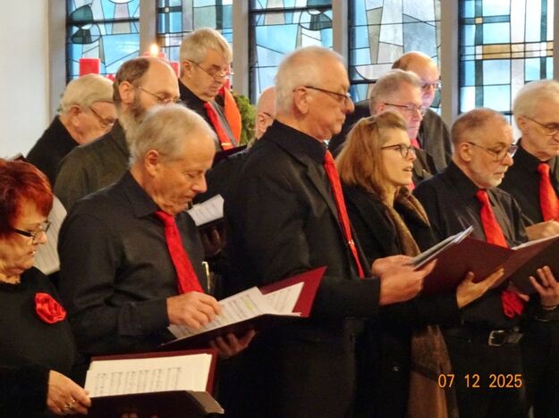 Sonntags am 7. Dezember traf sich unser Chor bereits um 15.15 Uhr in der katholischen Kirche zur Stellprobe und zum Einsingen vor unserem Konzert. Unser Dirigent Aldo war etwas angeschlagen und wir fröstelten alle ein wenig in der kühlen Kirche, vielleicht auch ein wenig vor Aufregung, ob wohl alles klappen würde und ob genügend Besucher kämen. Die Sorge war unbegründet, die Besucher kamen und offensichtlich gefiel auch unsere Liedauswahl. Sie bestand aus internationalen Weihnachtsliedern und stimmungsvollem Harfenspiel unserer Sängerin Silke Stober. Sie hatte zwei Stücke ausgesucht, die gut in die Vorweihnachtszeit passten – ein Klangerlebnis der besonderen Art. Bei unseren Liedern waren auch weltliche Songs dabei wie "Why we sing", bei der unsere junge Solistin Kristin, unser Tenor Harald und unser Bass Hartmut brillierten und auch "Cantar" von Jay Althouse, das die Freude am Singen bestätigte. Hanne Hallers "Vater unser" und Bernd Stallmanns "Vom Flügel eines Engels berührt" fügten sich gut in die vorweihnachtliche Stimmung ein.