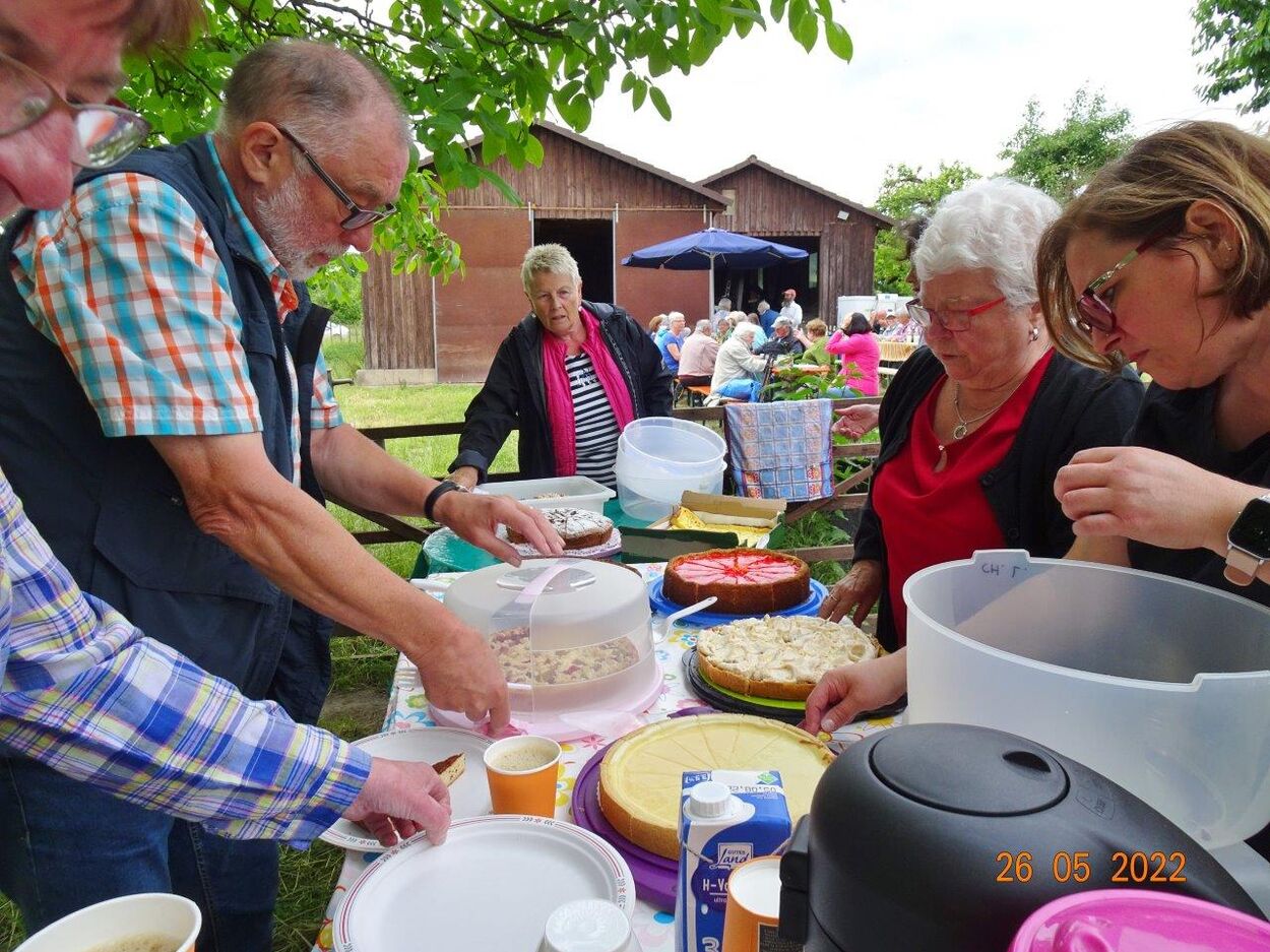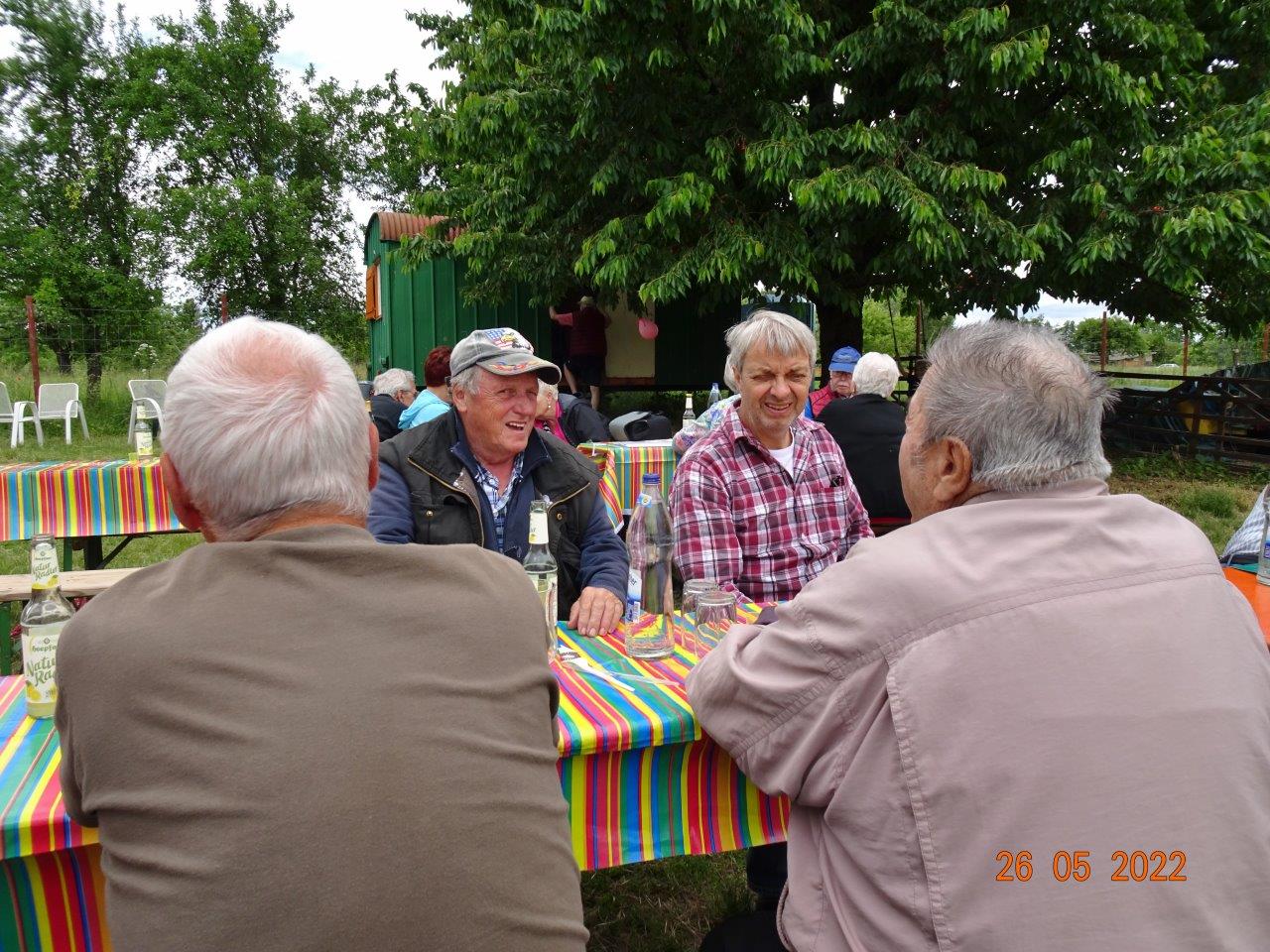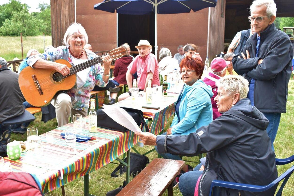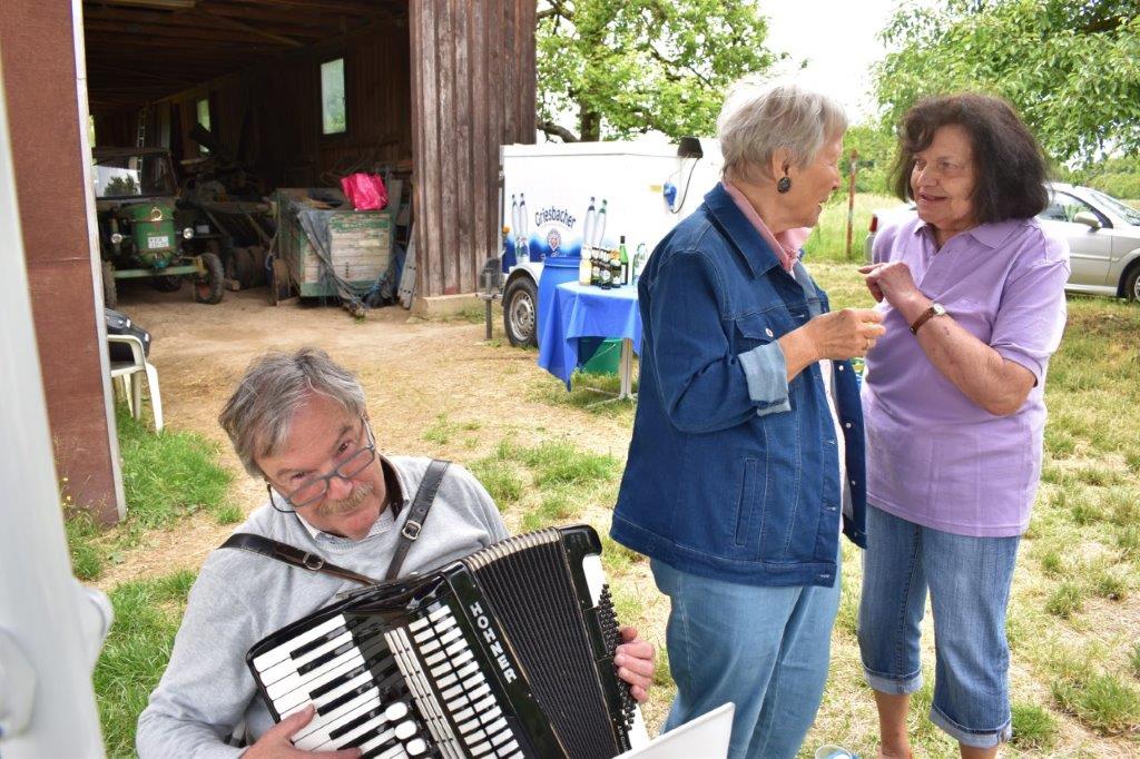 Klaus Eichsteller war mit seinem Akkordeon unermüdlich im Einsatz und Reinhilde Fürniß hatte ihre Gitarre und einige Lieder dabei, so konnten wir Manfred noch nachträglich zum 80. Geburtstag ein gebührendes Ständchen darbringen. Es ließ sich trefflich im Grünen sitzen und ab und an meldeten sich die Schafe mit Geblök, schließlich saßen wir ja auch auf deren Koppel. Auch ein herrlicher Tag geht einmal zu Ende und mit vereinten Kräften wurde zusammen geräumt – herzlichen Dank an alle Beteiligten und vor allem an unsere Gastgeber.