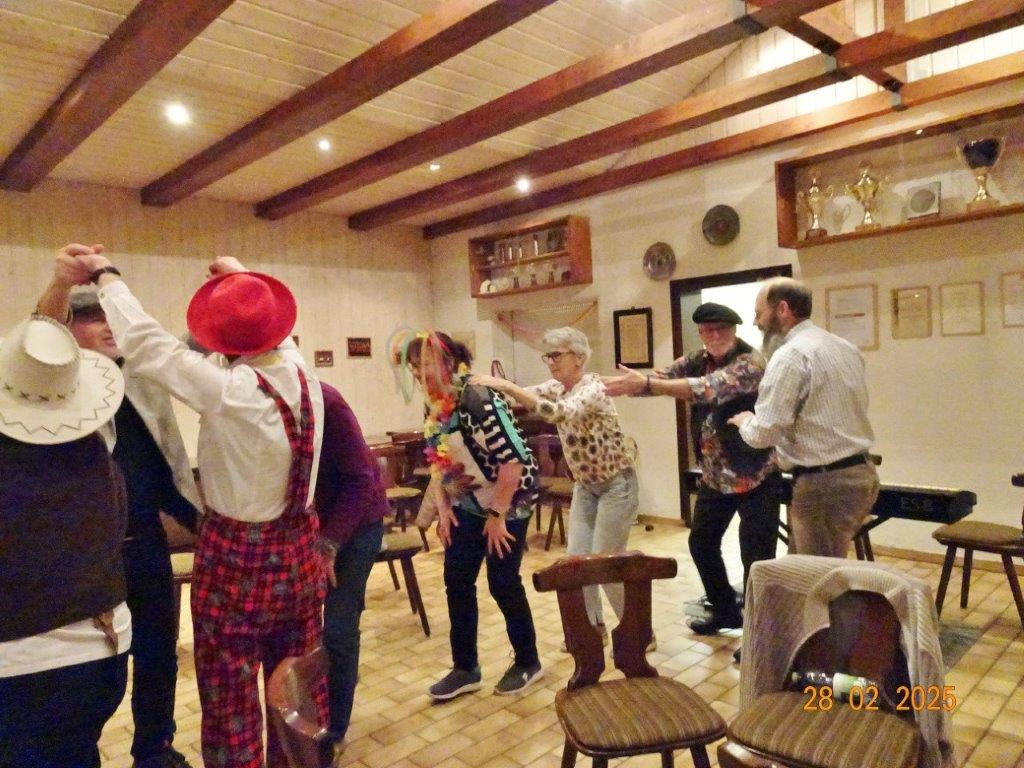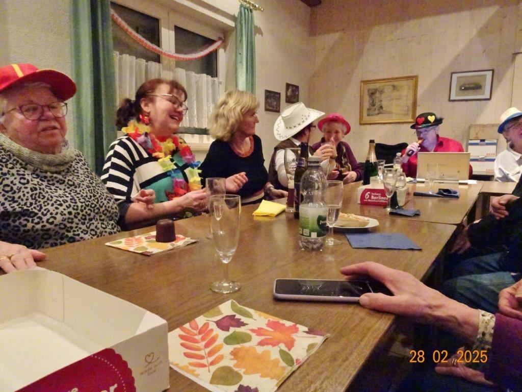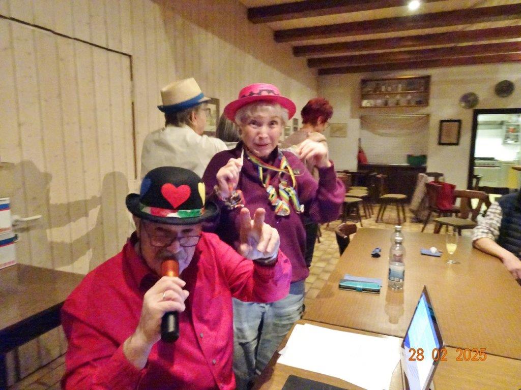 Die Faschingsdeko im Erlich passte für uns und einige Sängerinnen und Sänger waren gut behütet und zur 5. Jahreszeit gekleidet gekommen. Klaus Eichsteller sorgte für das entsprechende Programm mit Faschingsliedern und einer Büttenrede über einen „besonderen Kurgast“, danke Klaus. Wir freuten uns sehr, dass auch seine Frau Heidi mitgekommen war. So hatten wir eine schöne Stimmung und ließen den Abend angenehm ausklingen.