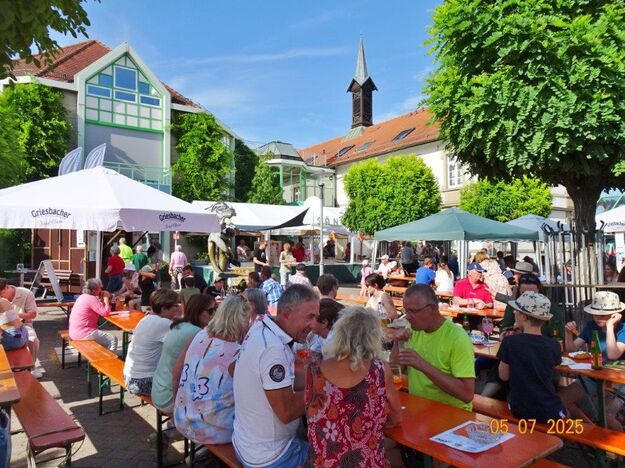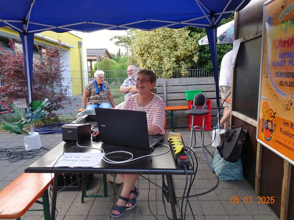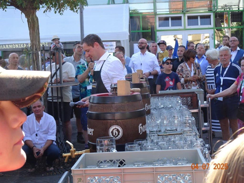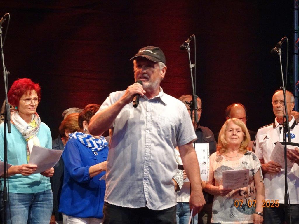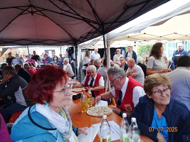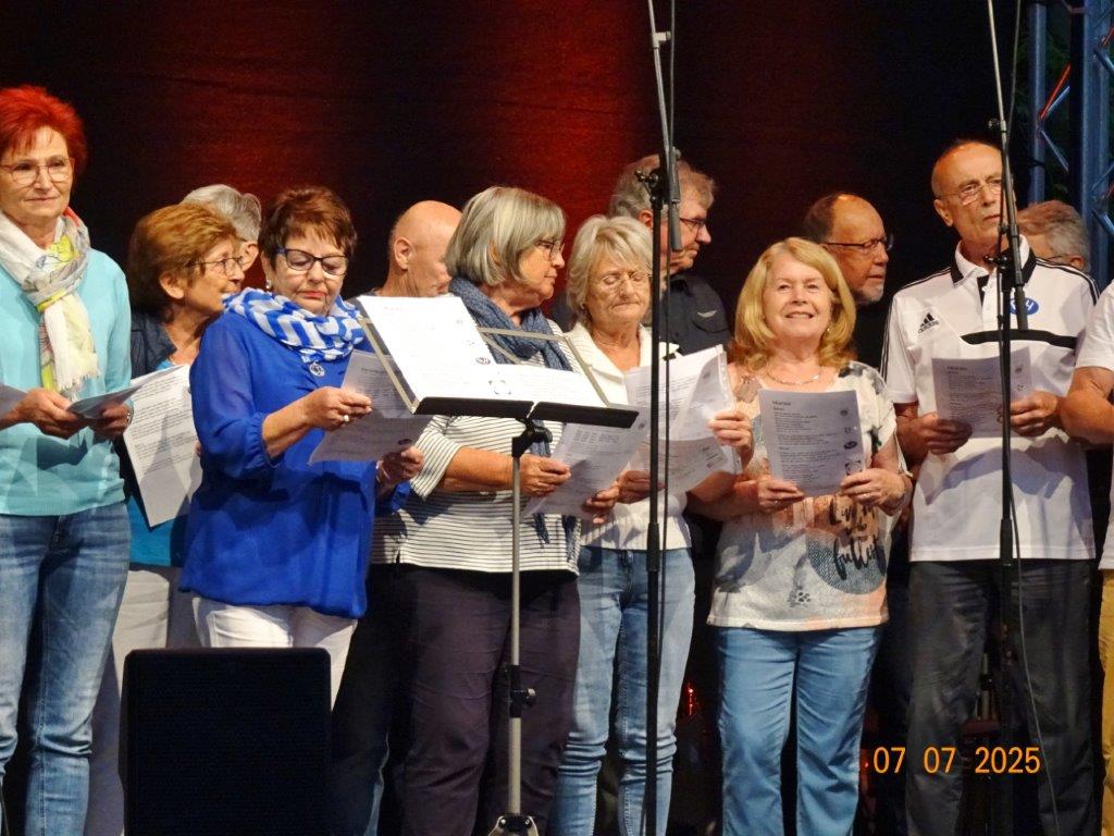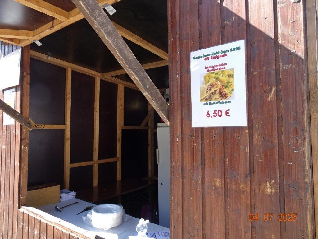 Unser Gemeindefusionsfest begann mit nahezu tropischen Temperaturen. Freitags, wenige Stunden vor Festbeginn, wurden noch fleißig unsere Hütten bestückt, nachdem Tage zuvor die Maultaschen-Produktion auf Hochtouren lief. Hier ein Danke an unsere Macher und Organisatoren Uschi und Rolf und ihre Mitstreiter. Gleichzeitig auch ein ganz herzliches Dankeschön an unseren Sponsor GLOBUS-Wiesental für die Spende. Natürlich auch danke an all unsere aktiven und passiven Mitglieder, die über die Festtage einen großartigen Dienst leisteten und unserem 1. Vorsitzenden Klaus Reinhardt, der immer rundum für Nachschub sorgte, mithilfe unseres 2. Vorsitzenden Markus Ksienzyk. Nur mit solcher Unterstützung kann das Ganze funktionieren! Um 18.00 Uhr erfolgte mit dem traditionellen Fassanstich durch unseren BGM Michael Möslang und der Begrüßung der Delegationen der Partnerschaftskommunen die feierliche Eröffnung des Festes. Und da war viel geboten, mit 3 Bühnen und vielen tollen Bands und anderen Unterhaltungsangeboten, von den Vereinen, Schulen und Ständen, die kulinarisch verwöhnten, Schaustellern und auch die Security und andere Dienste, die hier Bereitschaft hatten, nicht zu vergessen! Kurz, es war rundum für alles bestens gesorgt, um auf dem Festgelände schöne Stunden zu verbringen. Sonntags waren kühlere Temperaturen angesagt, eine richtige Wohltat nach den zwei ersten heißen Festtagen. Die von uns eingeladenen Chöre Da Capo aus Graben und der JCK vom KIT Karlsruhe waren pünktlich vor Ort, um bei unserem Bruderverein Sängerbund Linkenheim, der befreundete Chöre geladen hatte, aufzutreten. Beide Chöre sangen unter neuer Leitung und begeisterten mit modernem Liedgut das Publikum, wobei der JCK größenmäßig und stimmgewaltig beeindruckte und Lust auf sein Sommerkonzert machte. Die Stimmung vor Ort war gut und auch die Nachricht, dass gegen 18.00 Uhr unsere Maultaschen ausverkauft waren, ließ Freude aufkommen. Schade für die, die keine mehr bekamen, aber für uns das Zeichen, dass sie geschmeckt haben, wie wir auch immer wieder bestätigt bekamen. Fazit: Die Maultaschen könnten in unser Festprogramm aufgenommen werden – schaun wir mal. Der Sängermax und unsere Weinschorle waren auch der Renner, so hat sich die ganze Arbeit und Mühe gelohnt und den Verein zusammen geschweißt.