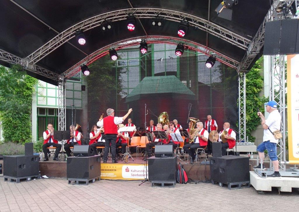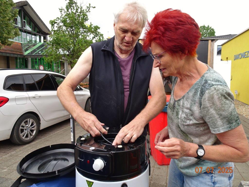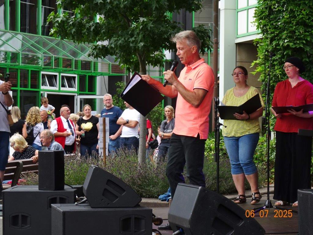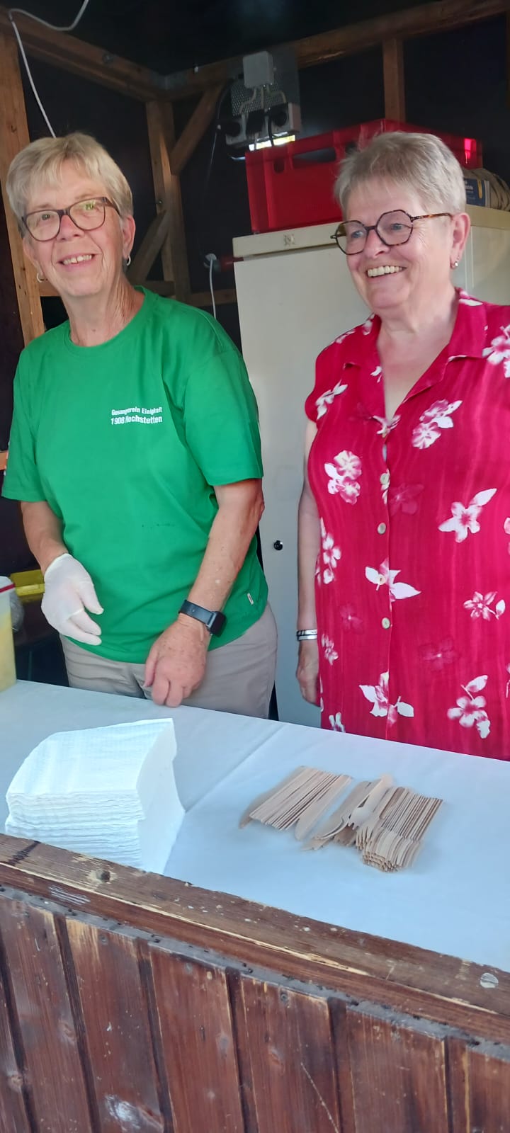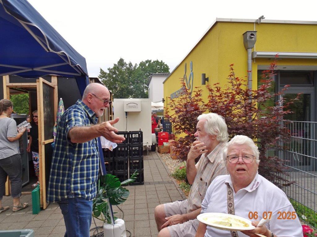 Unser Gemeindefusionsfest begann mit nahezu tropischen Temperaturen. Freitags, wenige Stunden vor Festbeginn, wurden noch fleißig unsere Hütten bestückt, nachdem Tage zuvor die Maultaschen-Produktion auf Hochtouren lief. Hier ein Danke an unsere Macher und Organisatoren Uschi und Rolf und ihre Mitstreiter. Gleichzeitig auch ein ganz herzliches Dankeschön an unseren Sponsor GLOBUS-Wiesental für die Spende. Natürlich auch danke an all unsere aktiven und passiven Mitglieder, die über die Festtage einen großartigen Dienst leisteten und unserem 1. Vorsitzenden Klaus Reinhardt, der immer rundum für Nachschub sorgte, mithilfe unseres 2. Vorsitzenden Markus Ksienzyk. Nur mit solcher Unterstützung kann das Ganze funktionieren! Um 18.00 Uhr erfolgte mit dem traditionellen Fassanstich durch unseren BGM Michael Möslang und der Begrüßung der Delegationen der Partnerschaftskommunen die feierliche Eröffnung des Festes. Und da war viel geboten, mit 3 Bühnen und vielen tollen Bands und anderen Unterhaltungsangeboten, von den Vereinen, Schulen und Ständen, die kulinarisch verwöhnten, Schaustellern und auch die Security und andere Dienste, die hier Bereitschaft hatten, nicht zu vergessen! Kurz, es war rundum für alles bestens gesorgt, um auf dem Festgelände schöne Stunden zu verbringen. Sonntags waren kühlere Temperaturen angesagt, eine richtige Wohltat nach den zwei ersten heißen Festtagen. Die von uns eingeladenen Chöre Da Capo aus Graben und der JCK vom KIT Karlsruhe waren pünktlich vor Ort, um bei unserem Bruderverein Sängerbund Linkenheim, der befreundete Chöre geladen hatte, aufzutreten. Beide Chöre sangen unter neuer Leitung und begeisterten mit modernem Liedgut das Publikum, wobei der JCK größenmäßig und stimmgewaltig beeindruckte und Lust auf sein Sommerkonzert machte. Die Stimmung vor Ort war gut und auch die Nachricht, dass gegen 18.00 Uhr unsere Maultaschen ausverkauft waren, ließ Freude aufkommen. Schade für die, die keine mehr bekamen, aber für uns das Zeichen, dass sie geschmeckt haben, wie wir auch immer wieder bestätigt bekamen. Fazit: Die Maultaschen könnten in unser Festprogramm aufgenommen werden – schaun wir mal. Der Sängermax und unsere Weinschorle waren auch der Renner, so hat sich die ganze Arbeit und Mühe gelohnt und den Verein zusammen geschweißt.