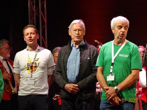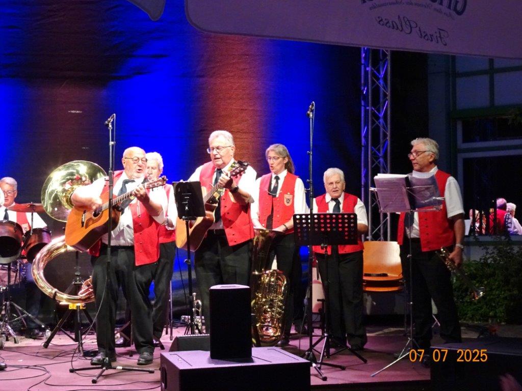 Zum Abschluss des Bunten Abends übernahm dann wieder Uwe Dürr den Dirigentenstab beim Musikzug, denn das obligatorische Badnerlied durfte nicht fehlen. Dazu wurde BGM Michael Möslang auf die Bühne gerufen, er wiederum rief nach Alt-Bürgermeister Waldemar Schütz, der mit ihm die Hymne anstimmte. Die Festgäste hatten sich alle zum mitsingen erhoben und so fand unser schöner Bunter Abend sein Ende. Ein Danke an unseren Vorstand Klaus und ein großer Dank an unsere Gemeinde, dass wir Teil des Programms sein durften und an alle, die dieses Fest mit gestemmt haben. Inzwischen hatte es kräftig abgekühlt und die Gäste verließen den Platz und gingen haam, oder hoom? Auf jeden Fall ins Warme.