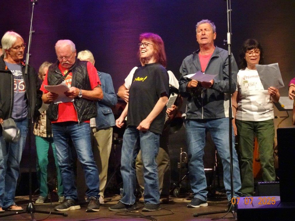 Am Festmontag waren etliche Helferinnen und Helfer gekommen, um schon morgens unsere Hütten zu räumen und alles wieder zurück zu bringen, denn wir hatten uns bereits montags vom Festbetrieb ausgeklinkt. Danke auch an dieses Team. Abends war unser Bunter Abend angesagt, wie er sonst im Festzelt im Erlich stattfindet. Man hatte sich für Open Air entschieden und das Wetter hielt glücklicherweise über die Veranstaltung. Klaus Reinhardt übernahm die Moderation und kündigte die einzelnen Gruppen an. Der Abend wurde natürlich, schon obligatorisch, vom Musikzug der FFW Li-Ho eröffnet, der die Stimmung ordentlich anheizte. Es folgte die Gemeinde-Verwaltung mit BGM Möslang, der lobende Worte zum Fusionsfest mit den ganzen Vorbereitungen fand und allen Beteiligten, die über den langen Zeitraum mitgemacht, durchgehalten und zum Gelingen beigetragen haben, herzlich dankte. Sein Verwaltungschor hatte wieder bekannte Lieder auf das Rathausgeschehen umgeschrieben, wobei auch die Gemeinde-Fusion Thema war. So auch nachfolgend bei einem Stammtischgespräch, das Klaus König als Hochstetter mit dem Linkenheimer Jürgen Müller führte. Köstlich, wie diese beiden die „Heirat“ der Schnecken und Affen vorbrachten. Vor allen Dingen auch die Sprachunterschiede in den zwei Ortsteilen, einer eher „o-lastig“, der andere mehr mit „a“. Als nächstes trug der Chor der Fußballer und der Gymnastikdamen bekannte Lieder vor und das „Alte Haus von Rocky Docky“ wurde passend für Li-Ho umgeschrieben. Dafür wurde jeder vom Chor von Hans Fürniß mit einem gekühlten Piccolo belohnt – Überraschung! Danach hielten die uns treuen Prismaten Einzug, die die Stimmung noch mehr anhoben und sich mit „Meiner kleinen Welt“ in Li-Ho geborgen fühlten. Der Musikzug der FFW zeigte seine stimmlichen Qualitäten unter anderem beim Erlich-Lied und Reiseplänen nach Marokko. Ein riesiges Dankeschön an alle Gruppen - Ihr ward Spitze! Zur anschließenden Siegerehrung rief Klaus Reinhardt von jeder Gruppe einen Vertreter auf die Bühne, um ihnen eine kleine Anerkennung zu überreichen. Natürlich waren alle Sieger, keine Frage.