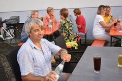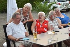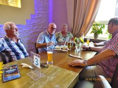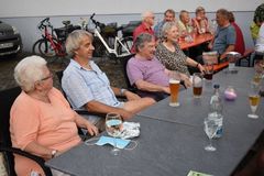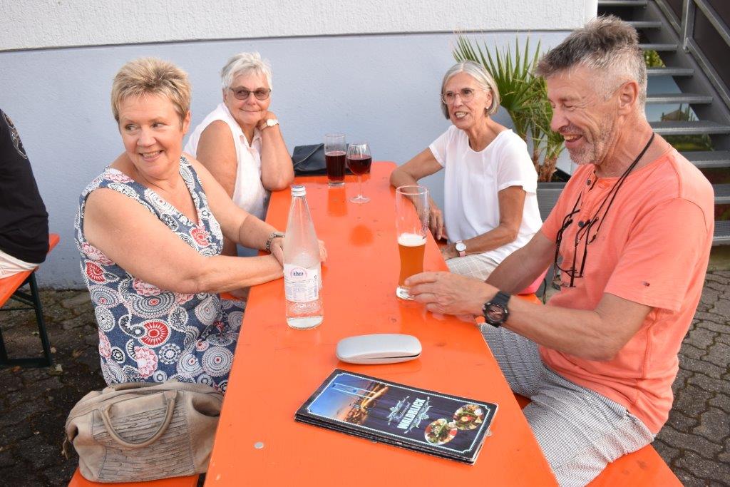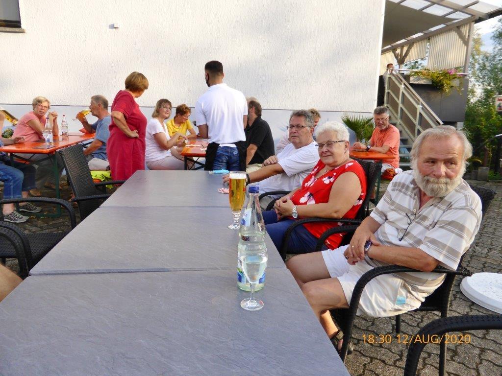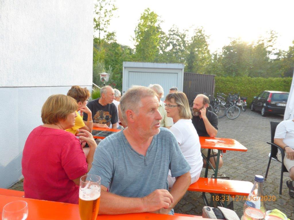 Das war die Frage bei unserem ersten Radeltreff in den Ferien. Nach so langer Trockenheit war natürlich Regen im wahrsten Sinne des Wortes heiß begehrt. So hat sich unser Oberradelführer Rainer richtig entschieden: Radeln fällt aus, Regen marsch!! Ein schöner Gewitterregen fiel herab, aber nach 18.00 Uhr, pünktlich zum Einkehrschwung um 19.00 Uhr zeigte sich das Wetter wieder freundlich. Zuerst saßen nur die Mutigen im Freien, aber später folgten die anderen, die im Lokal Platz genommen hatten, gerne nach draußen. Die Wirtsleute vom Waldblick hatten sich sehr viel Mühe gegeben, uns für ein paar Stunden mit Speis und Trank und freundlichem Service zu verwöhnen.