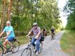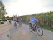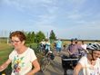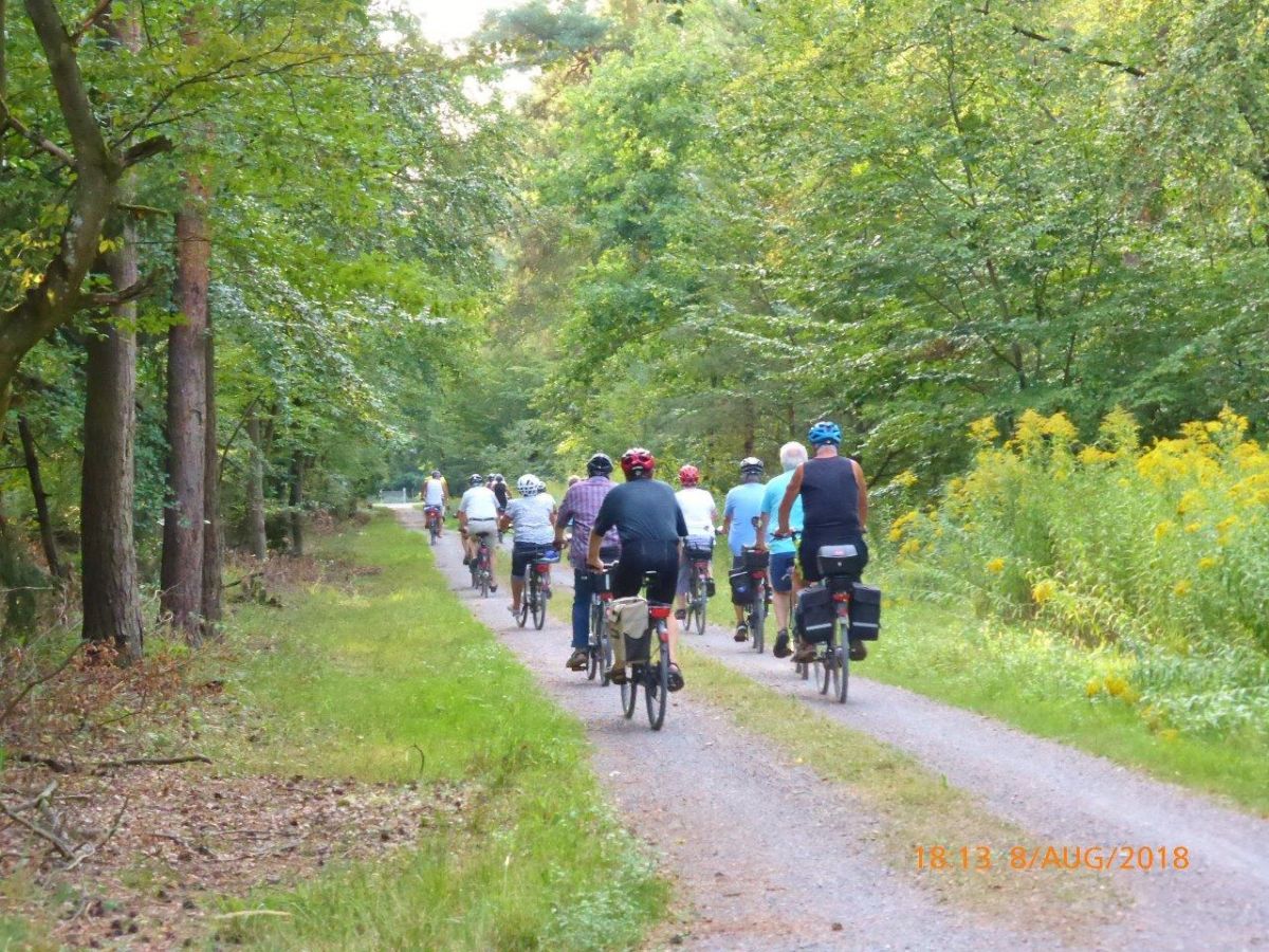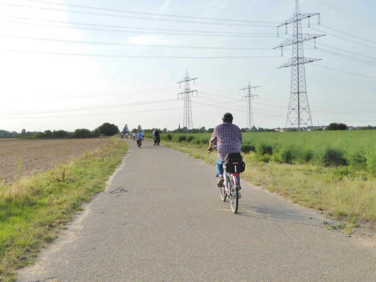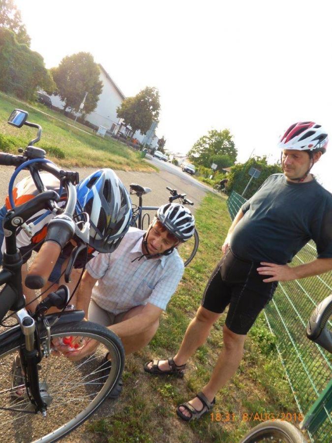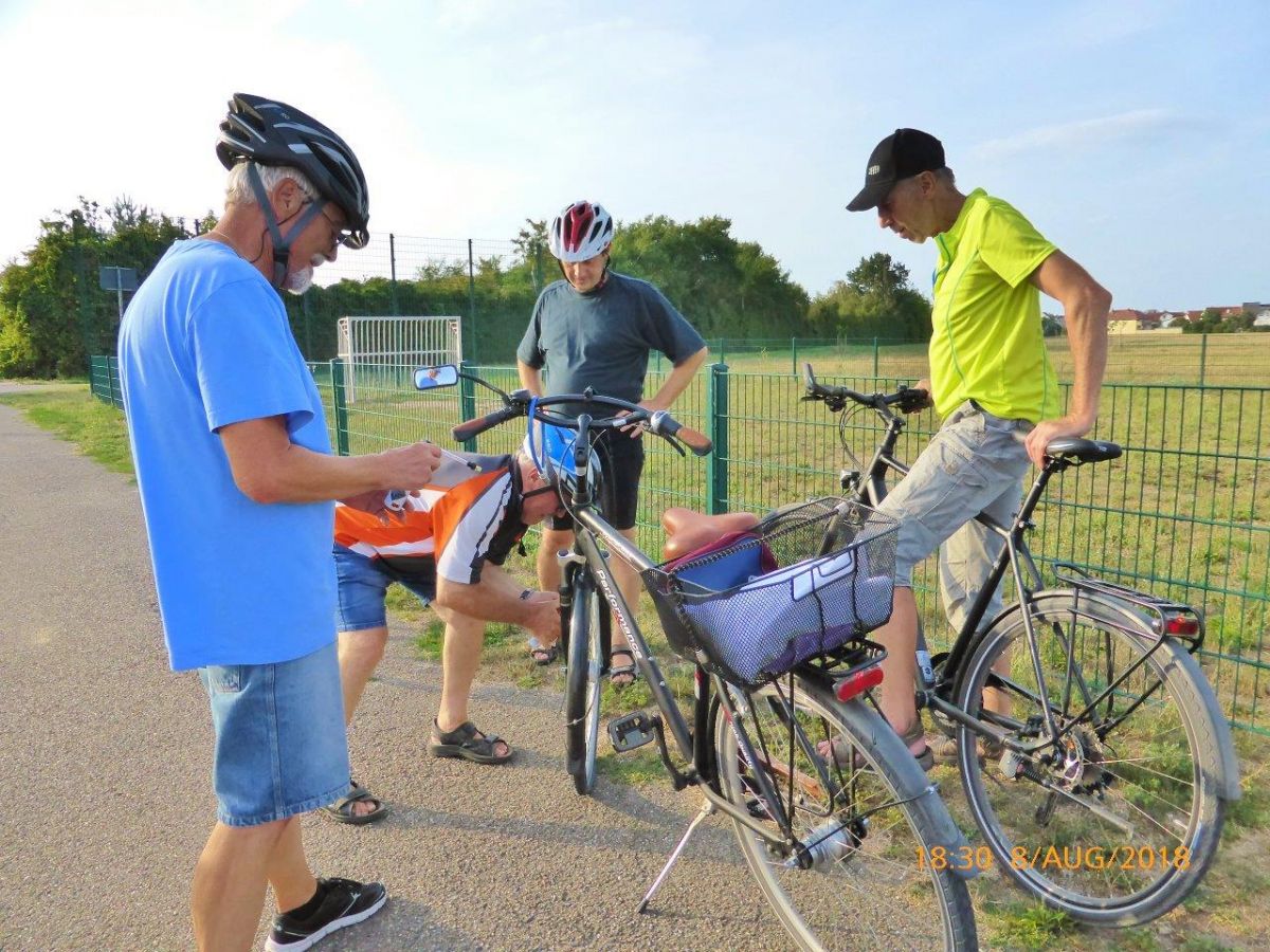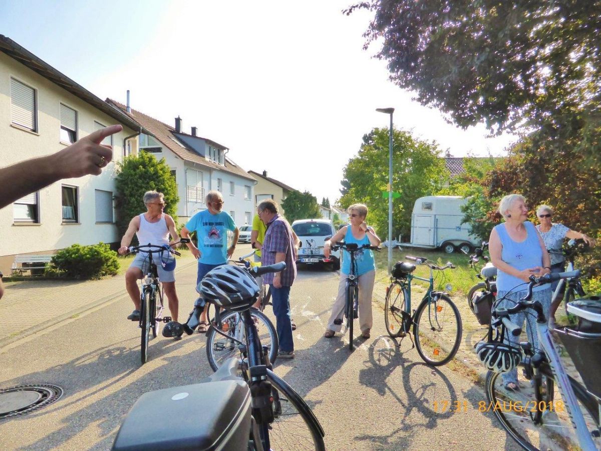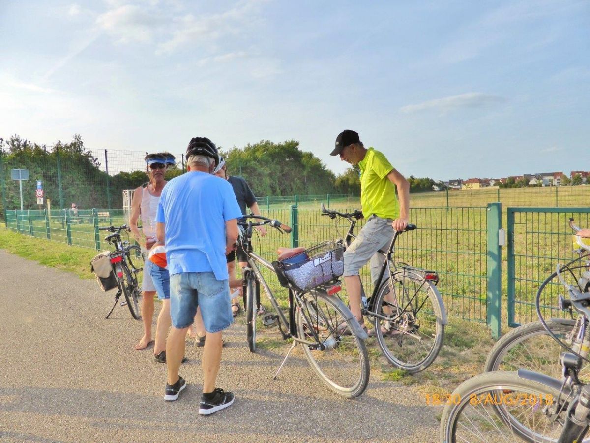 fand wieder eine gute Resonanz. Ungefähr 20 Radlerinnen und Radler trotzten der Hitze und sammelten sich Punkt 18.00 Uhr am Startpunkt. Wie versprochen ging die Tour überwiegend durch den Wald, Richtung Hirschgraben nach Friedrichstal. Der Bahn entlang folgten wir auf die andere Waldseite und radelten in weitem Bogen über den Blankenlocher Weg wieder nach Linkenheim. Kurz vor Ortseingang schlug der Pannenteufel zu und plättete Wolfgang Königs Vorderreifen so gründlich, dass Rainer Ritz ein Ersatzfahrrad anbot. Ein Glück war Rainer´s Garage nicht weit, so konnte die Fahrt bald fortgesetzt werden. Während der ganzen Aktion konnte endlich eine Trinkpause und ein Fotoshooting wahrgenommen werden, zieht es die Radler doch immer schnell zur Einkehr, da kommt man kaum zum Zug.