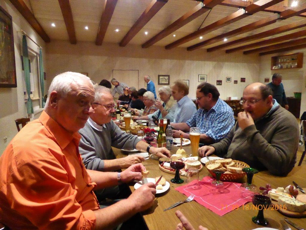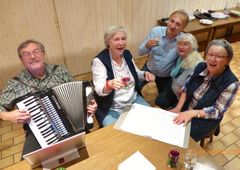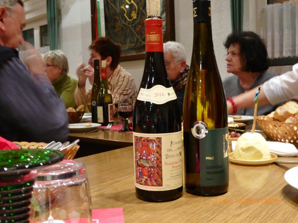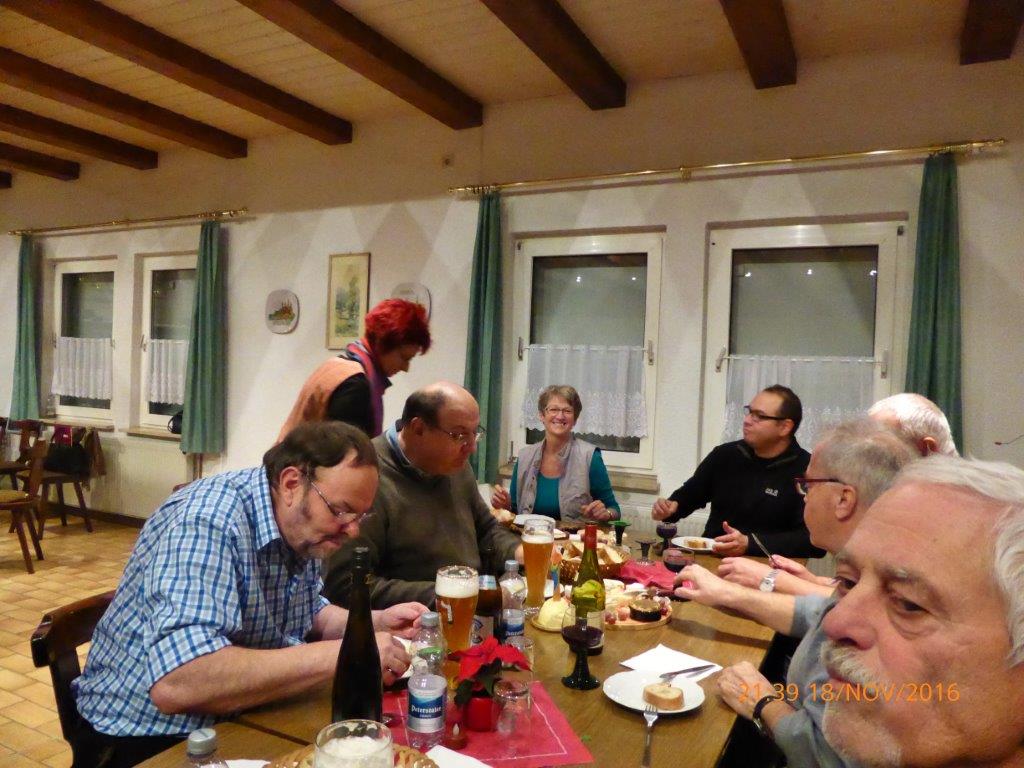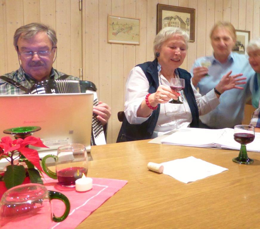Während der Singstunde hatte man schon einen verlockenden Duft in der Nase. Das kam daher, dass sich Rosi und Henry etwas Tolles für uns ausgedacht hatten. Sie wollten mit uns ihren 150. Geburtstag feiern, dazu hatten sie wunderbaren Käse, Baguettes und exzellenten Wein für uns mitgebracht. Mit Begeisterung wurde getafelt und spätestens mit Heidi und Klaus Eichstellers musikalischer Einlage französischer Chansons, konnte man das „Savoir-Vivre“ spüren. Das war mal wieder ein gemütlicher Abend – herzlichen Dank euch für diesen kulinarischen und akustischen Schmaus.