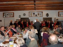 Am 27. Februar feierten auch zwei Mitglieder einen runden Geburtstag. Renate und Mircea Lupoian hatten beide das 60. Lebensjahr vollendet und zur Feier von zusammen 120 Jahren Lebenserfahrung den gemischten Chor in den Nebenraum der Turnhallengaststätte in Hochstetten eingeladen. Mit Vizechorleiterin Reinhilde Fürniß sangen wir sechs Lieder als Geburtstagsständchen, Renate hatte sich Lieder aus ihrer aktiven Zeit gewünscht, darunter das anspruchsvolle „Landsknechtsständchen“ von Orlando di Lasso. Zwischen den Liedvorträgen gratulierte unser Vorsitzender Klaus Reinhardt, er betonte dabei die Hilfsbereitschaft von Renate und Michel bei Sängerfesten und sonstigen Aktivitäten. Danach konnte man sich am Büffet bedienen und nach Herzenslust schlemmen. Wir bedanken uns bei Renate und Michel ganz herzlich für die Bewirtung und wünschen den Beiden alles Liebe und Gute.