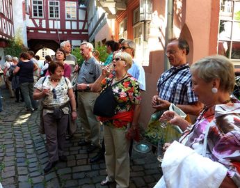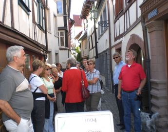Am 10.9. um 8.00 Uhr ging‘s los. Wir fuhren in aller Gemütsruhe, wir hatten es ja nicht weit, mit dem Bus und bestem Wetter über den Rhein. Auf einem Parkplatz kurz vor Neustadt machten wir die obligatorische Frühstückspause. Alle blickten voll Sorge gen Himmel. Der Wetterbericht hatte uns Sonnenschein und 27 Grad versprochen - aber es herrschte Nebel. Voll Optimismus setzten wir unsere Fahrt nach Neustadt fort wo wir uns am Bahnhofsplatz mit zwei Damen vom Touristikbüro trafen. In zwei Gruppen aufgeteilt wurden wir durch Neustadt geführt. Die Sonne setzte sich durch und vertrieb die Nebelschwaden. Alle waren überrascht, wie nett und anmutig sich die Altstadt präsentierte. Kleine urige Gasthäuser in liebevoll restaurierten Fachwerkhäusern luden in den vielen Gassen und Winkeln zum verweilen ein wo wir zum Ende der Stadtführung zwei Sorten Wein probieren durften. In dieser weinseligen und gut gelaunten Runde stimmte unsere Vizedirigentin Reinhilde Fürniss auch prompt zwei passende Lieder an. Das „Rheinweinlied“ und „Nun leb wohl Du kleine Gasse“ sangen alle mit Begeisterung.