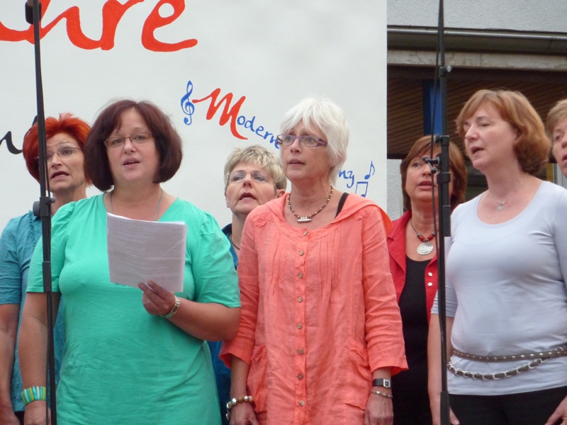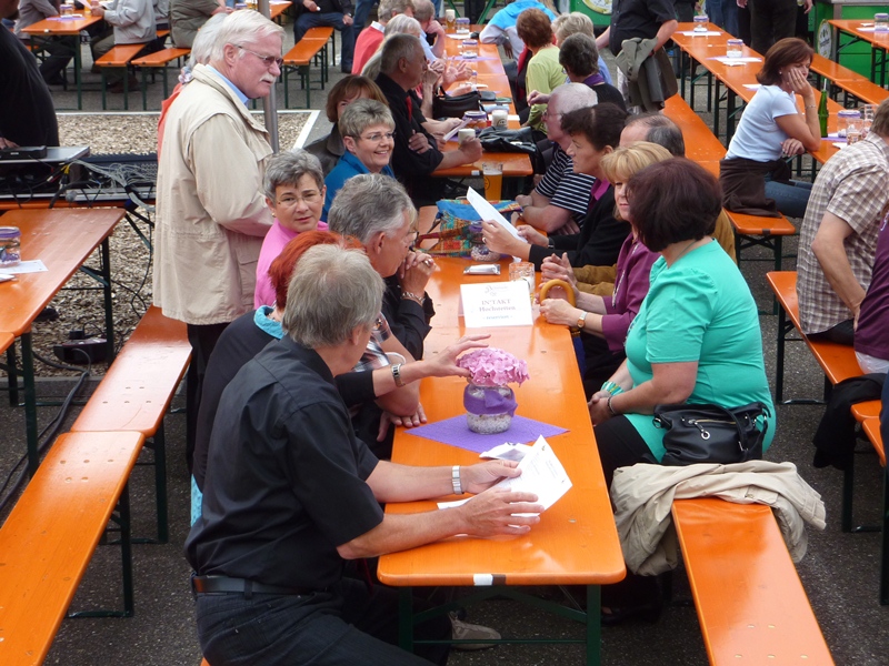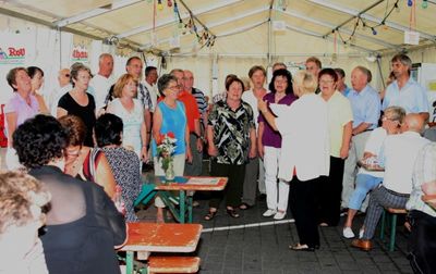 Der Wettergott meinte es am Sonntag, den 10. Juli, gar nicht gut mit den Vereinen auf dem Linkenheimer Dorffest. Unser traditioneller Chor hatte sich gegen 15 Uhr beim Stand des Sängerbundes Linkenheim verabredet. Der Junge Chor mit Jutta Braun-Wingert hatte gerade noch unter freiem Himmel singen können, danach fing es leicht an zu regnen und wir suchten im gut besetzten Zelt Platz.