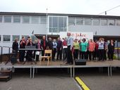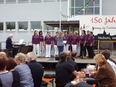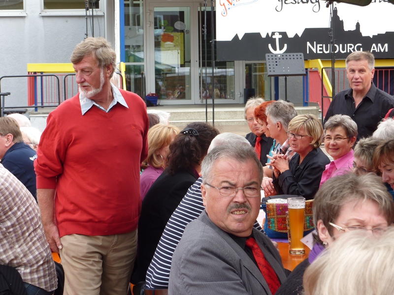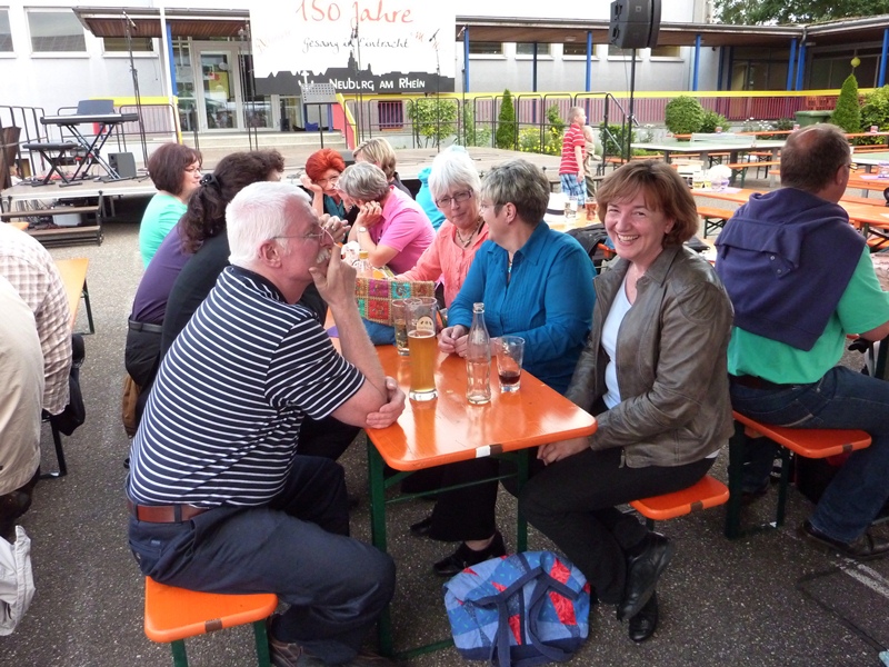 Am 25. Juni feierte der Gesangverein Eintracht Neuburg am Rhein sein 150-jähriges Bestehen. Sein Chor Modern Harmony mit dem Dirigenten Uli Kofler besuchten letztes Jahr unser Sängerfest, deshalb waren wir zum Jubiläum herzlich eingeladen. Um 17.30 Uhr stiegen wir, die Chorgruppe „Intakt“, in den von uns bestellten Reisebus, der uns ganz ohne Stress über die Rheinbrücke nach Neuburg brachte. Ein kleiner Fußmarsch führte uns zum Festplatz auf dem Schulhof von Neuburg. Locker und zuversichtlich, wie die Pfälzer sind, hatten sie im Freien eine Bühne aufgebaut. Sie hatten Glück, die zahlreichen Wolken regneten sich nicht aus. Zum Empfang gab es ein Fass Freibier.