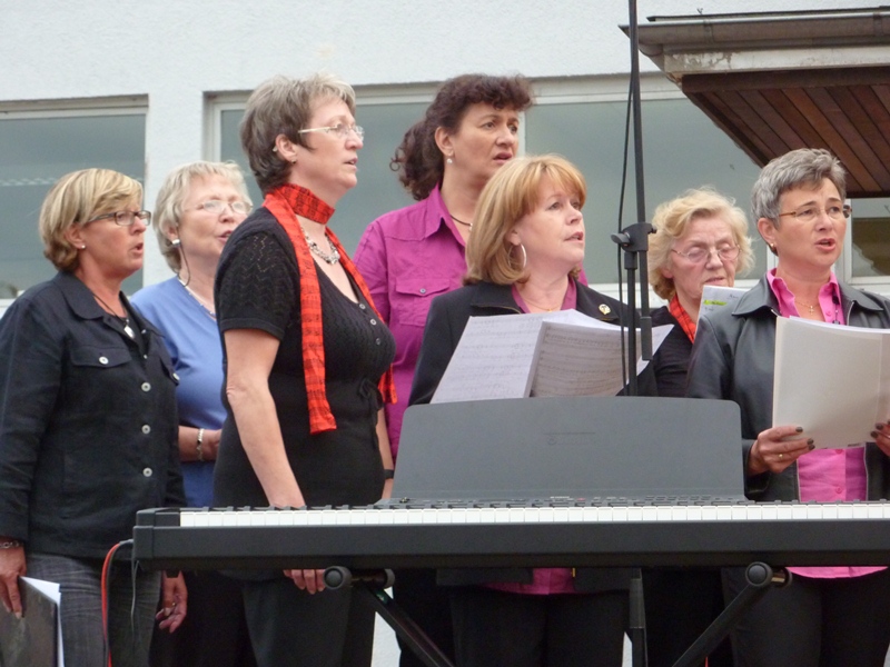 Während der Liedvorträge durch die Chöre des Gastgebers mit ihrem Dirigenten Thomas Kästner öffnete der Himmel seine Schleusen und ein richtiger Wolkenbruch prasselte auf das Zelt, unter den Tischen und Bänken floss das Wasser hindurch. Die schwungvollen Lieder unserer Linkenheimer Sangesfreunde ließen jedoch keine Schlechtwetter-Stimmung aufkommen. Um den Umsatz anzukurbeln brachten wir mit Vizedirigentin Reinhilde Fürniß drei Trinklieder zum Vortrag, „Tourdion“, „In Vino veritas“ und das „Rheinweinlied“. Mit dem vierten Lied versuchten wir die Sonne hervorzulocken, es nützte zwar nichts, aber „Samba, Samba“ aus Brasilien kam beim Publikum gut an.