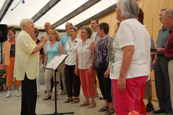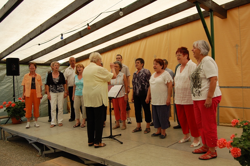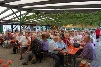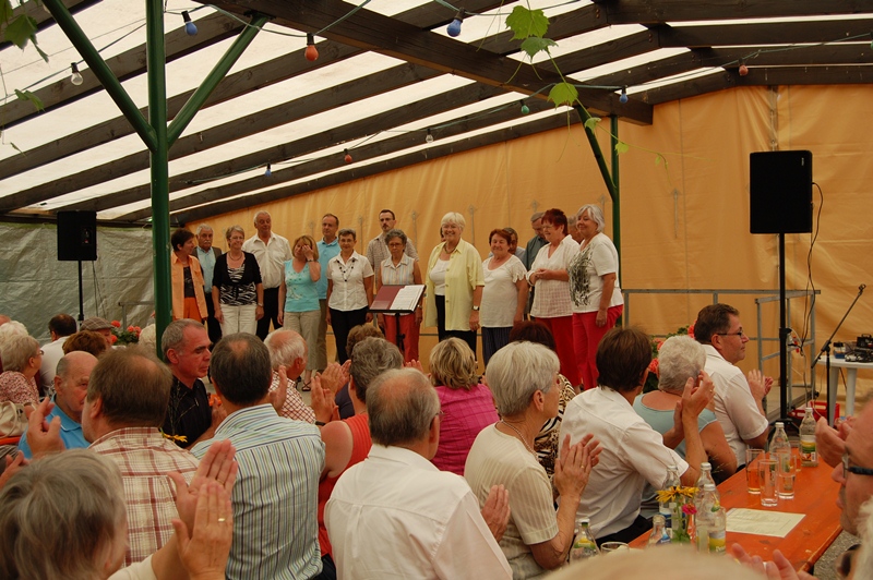 Am Montagabend trafen sich die Sängerinnen und Sänger im Festzelt des Fußballvereins Hochstetten. Diese Verbundenheit mit dem Fußballverein pflegen wir schon viele Jahre, zudem sind einige Sängerinnen aktive Mitglieder der Gymnastikgruppe des FVH. Vizedirigent Eberhard Halter dirigierte zuerst die Liedvorträge des traditionellen Chores, ein Silcherlied, ein schwungvolles Trinklied und den immer wieder gern gehörten „Hahn von Onkel Giacometo“. Es war ein schöner Sommerabend und das Festzelt war gut gefüllt, deshalb hatten wir eine erfreulich zahlreiche Zuhörerschar. Später unterhielt noch die Chorgruppe Intakt die Gäste mit drei internationalen Ohrwürmern.