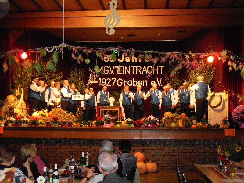 Am Samstag, den 6. Oktober, feierte der MGV Eintracht Graben sein Weinlesefest in der Festhalle in Graben und hatte unseren traditionellen Chor dazu eingeladen. Chorleiter Hans Vogt griff auf die bewährte Mischung aus besinnlichen und schwungvollen Liedern zurück. Ein anwesender Chor aus Österreich freute sich über die heimatlichen Klänge des Liedes „Aufm Berg bin i gern“ mit seinem schönen Altsolo. Zum Motto des Abends passte gut „In Vino Veritas“ mit den Solisten Klaus Reinhardt und Rainer Ritz.