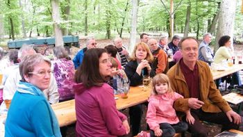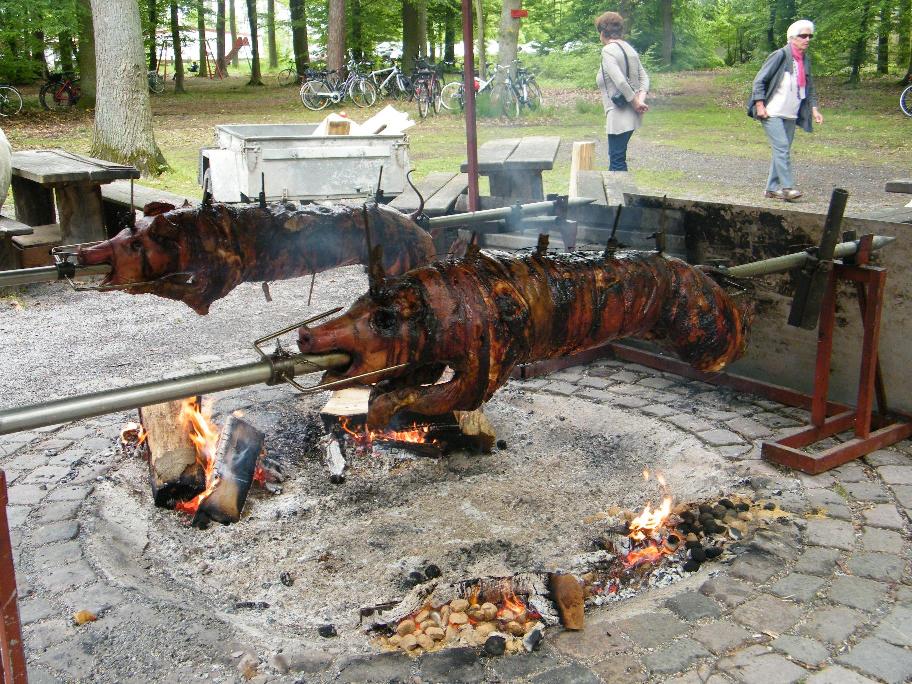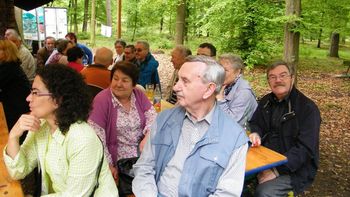 Seit Jahrzehnten steht an Christi Himmelfahrt ein Auftritt bei der Vatertagsfete des Liederkranz Graben in unserem Terminkalender. Bei der Grillhütte im Grabener Wald werden jedes Jahr zwölf Stunden lang zwei knusprige Schweine gegrillt, eine Spezialität die viele Besucher anzieht. Um die Mittagszeit trafen sich befreundete Chöre zum zwanglosen Auftritt, unser Traditionschor mit Vizedirigentin Reinhilde Fürniß sang vier schwungvolle Lieder für die zahlreichen Gäste. Als Gastgeschenk bekam unser Vorsitzender Klaus Reinhardt eine geschnitzte Skulptur überreicht. Danach konnte man sich die angebotenen Spezialitäten schmecken lassen.