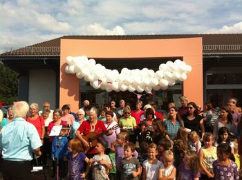 Dirigent Hans Vogt begrüßte mit launigen Worten das Publikum, ermunterte zum Mitsingen und teilte die Gruppen für den Kanon „Froh zu sein, bedarf es wenig“ ein. Sicher geleitet klappte der Kanon auch bestens und erklang über den ganzen Parkplatz. Durch den vollen Klang ermuntert, sang das Publikum auch die „Ode an die Freude“ und „Die Gedanken sind frei“ gerne mit. Mit Gitarrenbegleitung durch Vizedirigentin Reinhilde Fürniß und Unterstützung des Chores präsentierten die Kinder „Einfach spitze, dass du da bist“, die Freude am Singen war zu hören und zu sehen. Zum Abschluss und passend zum strahlend blauen Himmel brachte der Chor das brasilianische Lied „Tanze Samba“ zum Vortrag.