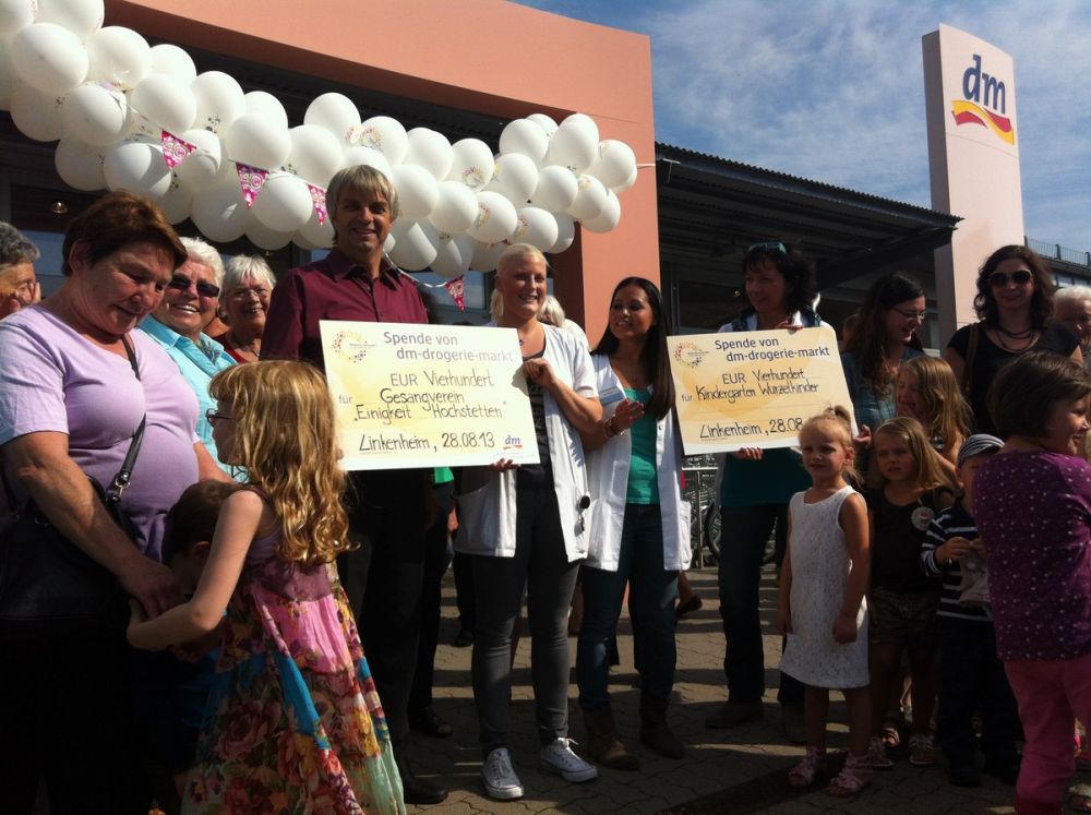 Am 28. August feierte die dm Drogeriemarktkette ihr 40-jähriges Bestehen mit einer Mitsingaktion vor vielen Filialen. Bei herrlichem Sommerwetter fand sich unser Chor, bestehend aus Aktiven des traditionellen Chores und der Chorgruppe Intakt, zusammen mit Erzieherinnen und Kindern des Kindergartens „Wurzelkinder“ vor der Filiale in Linkenheim ein. Viele Zuhörer die Bescheid wussten, hatten sich schon mit Textblättern ausgestattet und warteten gespannt auf den Auftritt. Ahnungslose Kunden blieben verblüfft stehen als auf einmal voluminös das afrikanische Lied „Siyahamba“ erklang.