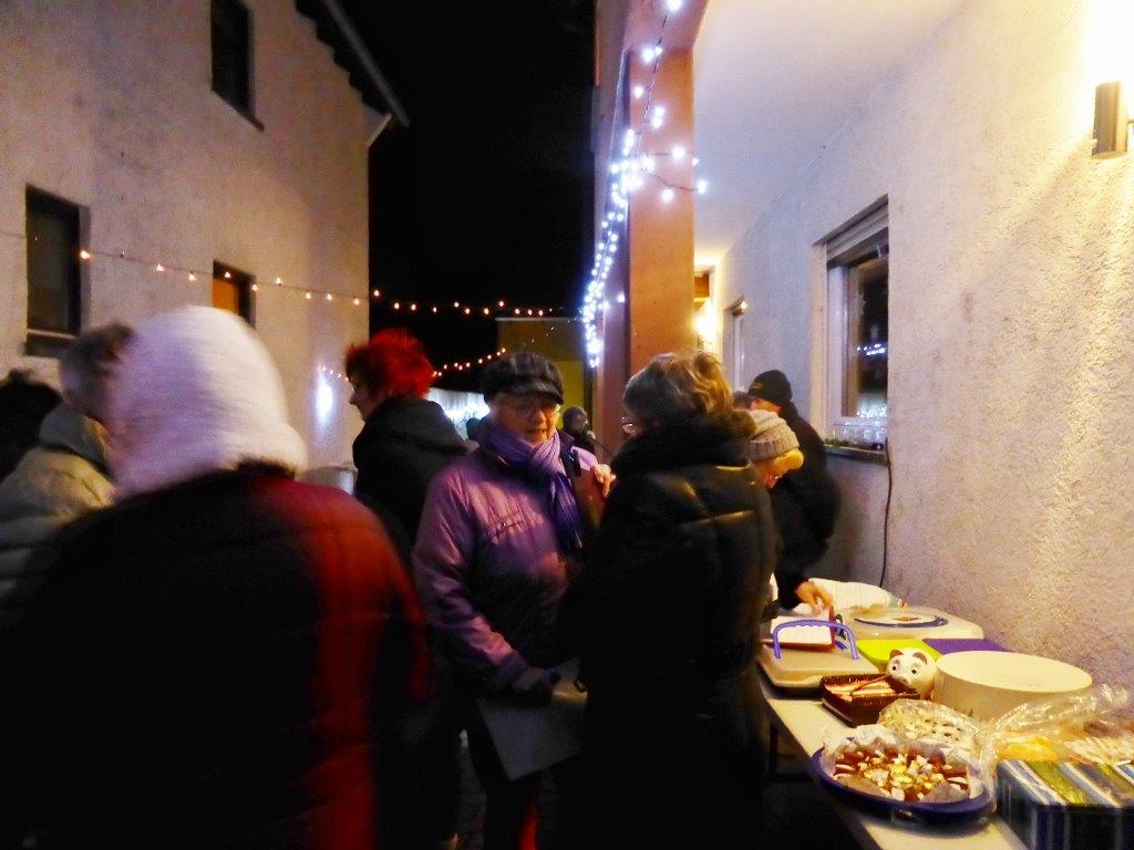 Unser Chor brachte mit unserem Dirigent Aldo Martinez vier schöne Weihnachtslieder dar und Reinhilde Fürniß dirigierte den Andachtsjodler zur Freude aller. Christa Jung-Wittiger las eine Geschichte vor, die ganz aktuelle Bedeutung hat. Dann durften die Besucher gemeinsam mit uns drei Weihnachtslieder singen und dann mit köstlichem Gebäck, Glühwein und Kinderpunsch die Stimmung noch nachwirken lassen. Die Spende dieses Abends geht an den Kindergarten Wurzelkinder - vielen Dank an alle Spender, der Fam. Dürr für ihren Einsatz mit Hof und Fenster und allen fleißigen Bäckerinnen, Helferinnen und Helfern - das hat mit euch ganz toll geklappt!