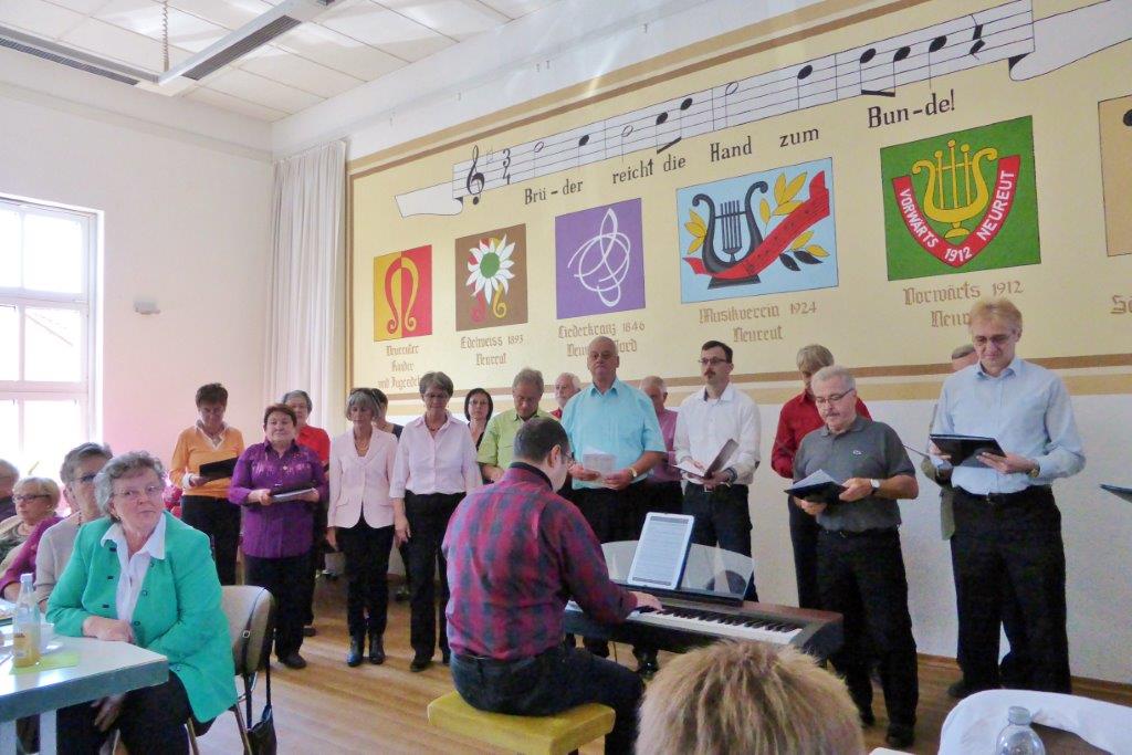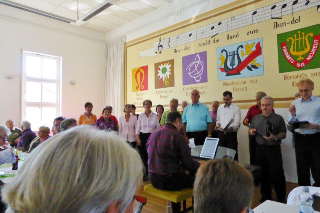So ging es nahtlos über zum Nachmittag beim Edelweiß Neureut. Der erste Vorsitzende Klaus Döring begrüßte uns sehr herzlich und wir durften das Nachmittagsprogramm beim Herbst- und Weinfest eröffnen. Wir überzeugten mit unseren drei Liedbeiträgen und wurden nach einer Zugabe mit viel Applaus bedacht. Unser Dirigent war mit uns sehr zufrieden, wie auch mit seinen weiteren Chören. Mit abwechslungsreichem Chorgesang war es kurzweilig und die Zeit verging im Flug. Beim guten Speisenangebot des GV Edelweiß und leckerem Kuchen konnte jeder etwas Passendes finden. So gestärkt traten wir, und auch die sportlichen Radler unter uns, bei herrlichem Festwetter wieder den Heimweg an - ein gelungener Sonntag.