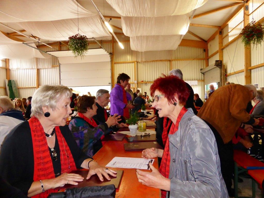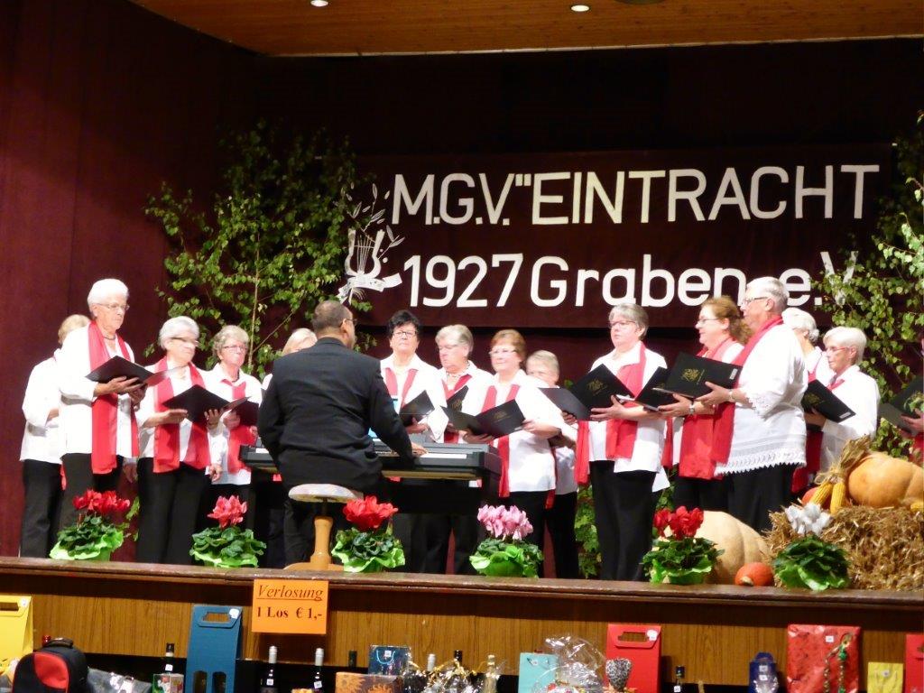 Am Samstag 03.10. waren wir zum Weinlesefest bei der Eintracht Graben eingeladen. In der gut besuchten Festhalle konnten wir unseren Chor nach der Pause präsentieren. Zuvor hatten wir uns eingesungen und von Aldo Martinez noch den letzten Feinschliff für unseren Auftritt bekommen. Dieser ist uns mit unseren drei modernen Liedern auch absolut gelungen und als wir den obligatorischen neuen Wein gereicht bekamen, stimmte unser Chor "Griechischer Wein" an und der Funke sprang auf´s Publikum über. Mit abwechslungsreichen Vorträgen der anderen Vereine und guter Verköstigung konnte man in Graben sehr gut verweilen. Bei der Verlosung hatte Fortuna für einige aus unserem Chor noch Überraschungen parat, so dass es ganz lustig zuging. Zu vorgerückter Stunde begaben wir uns zufrieden auf den Heimweg.