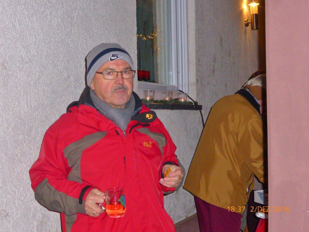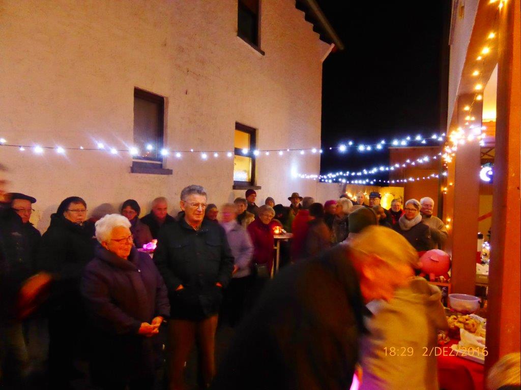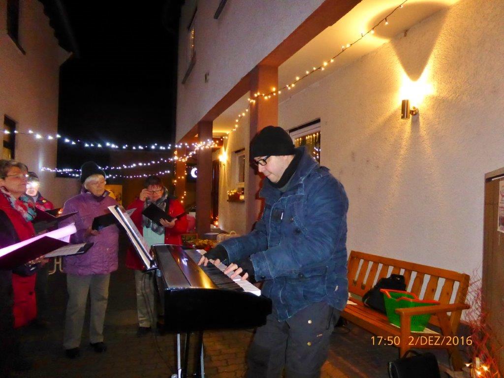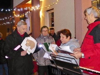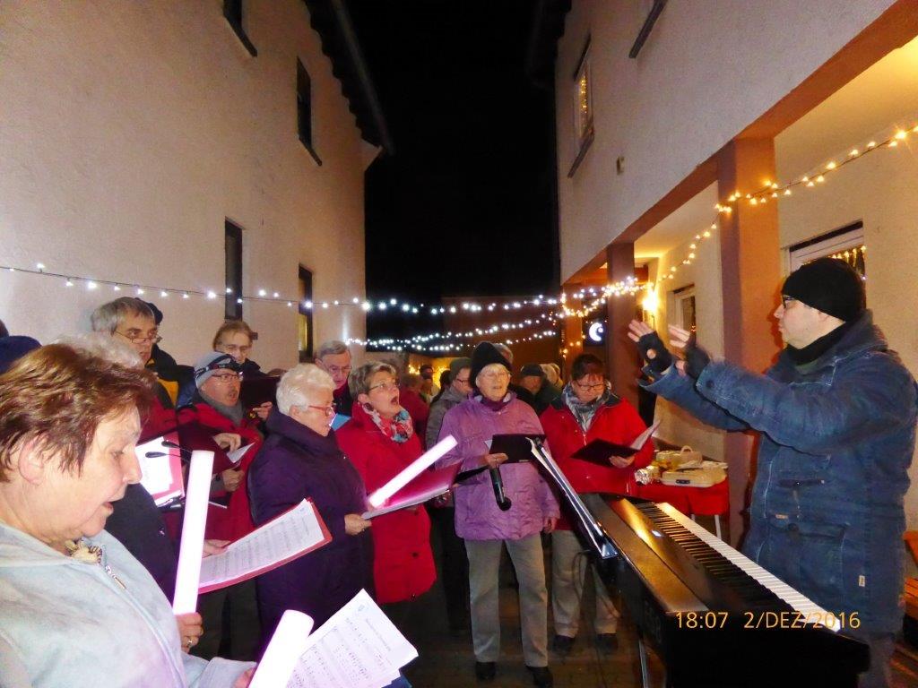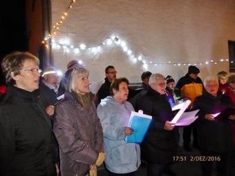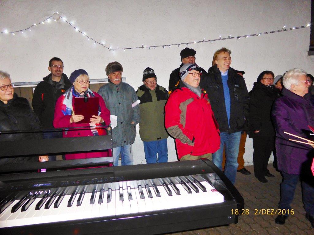 Am 2.12. beteiligte sich unser Chor am Adventsfenster und im Lichter geschmückten Hof von Hannelore und Harald Dürr trafen pünktlich um 18.00 Uhr die ersten Besucher ein. Mit unserem Dirigenten Aldo Martinez sangen wir vier Lieder und dann gemeinsam mit allen Anwesenden weitere Weihnachtslieder. Christa Jung-Wittiger hatte eine schöne Tiergeschichte parat, die sie mit lustigen Zeichnungen mit Hilfe ihres Mannes Wilfried Jung plastisch vortrug. Dann durfte das schön dekorierte Adventsfenster von Hannelore bewundert werden, bevor der Abend mit Glühwein, Punsch und verschiedenem Gebäck eine schöne Fortsetzung fand. Danke an alle, die wieder zum Gelingen dieses Abends beigetragen haben, unseren Besuchern und Familie Dürr, die uns wieder dankenswerter Weise ihren Hof zur Verfügung gestellt hatte.