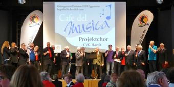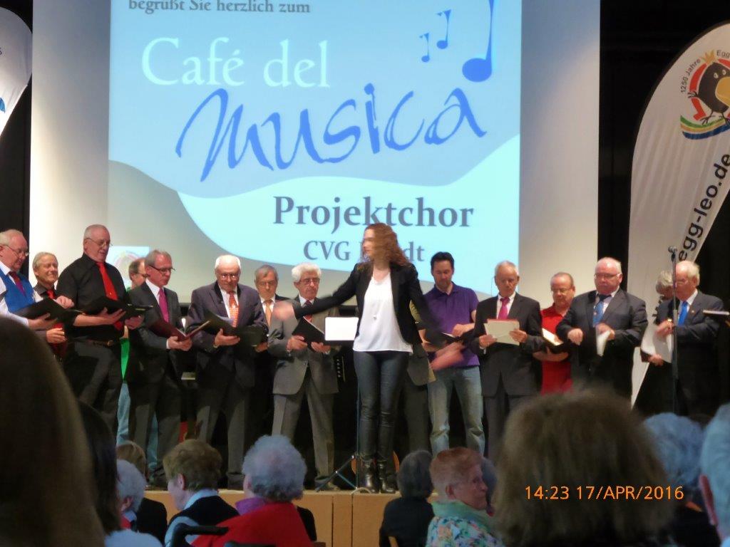 Am Sonntagnachmittag waren unsere Sänger Klaus Reinhardt, Harald Dürr und Peter Huck mit dem Projektchor der CVG-Hardt unter der Leitung von Sarah Maria Bahr beim „Café del Musica“ aktiv. Sie versteht es die Sänger zu motivieren und zu enormen gesanglichen Leistungen zu bringen, geht dabei neue Wege, eine Frau, die diesbezüglich mit ihrer Arbeit überzeugt. Ein schöner Nachmittag mit unterhaltsamem Programm und angenehmer „Café-Atmosphäre“.