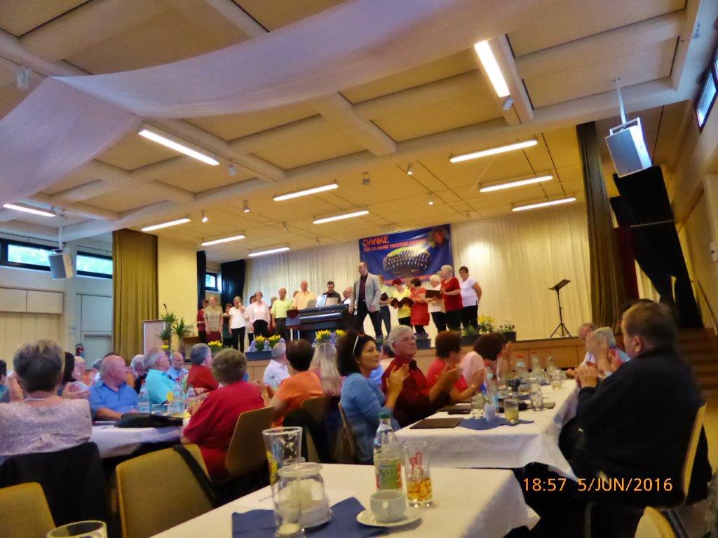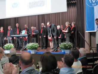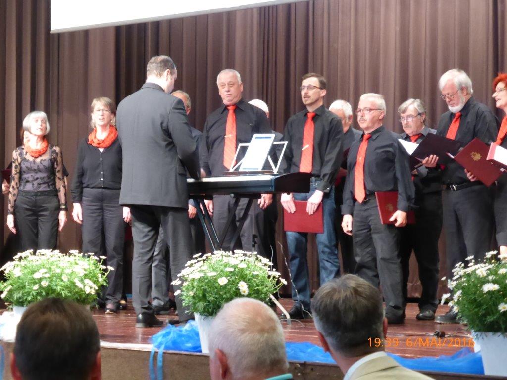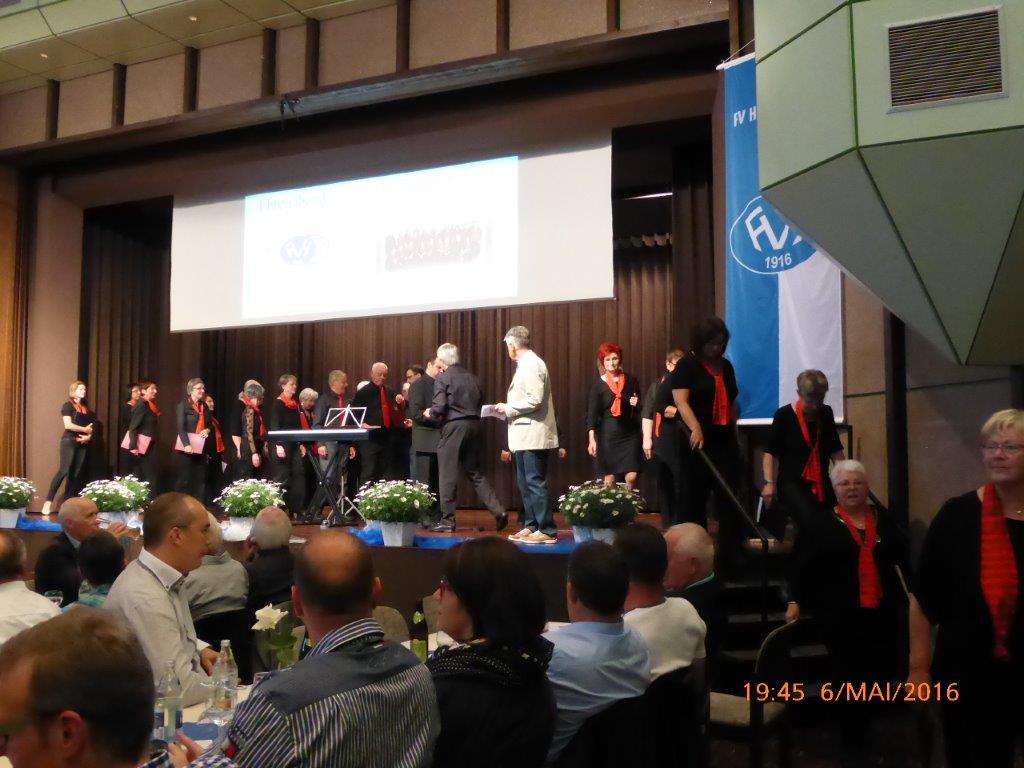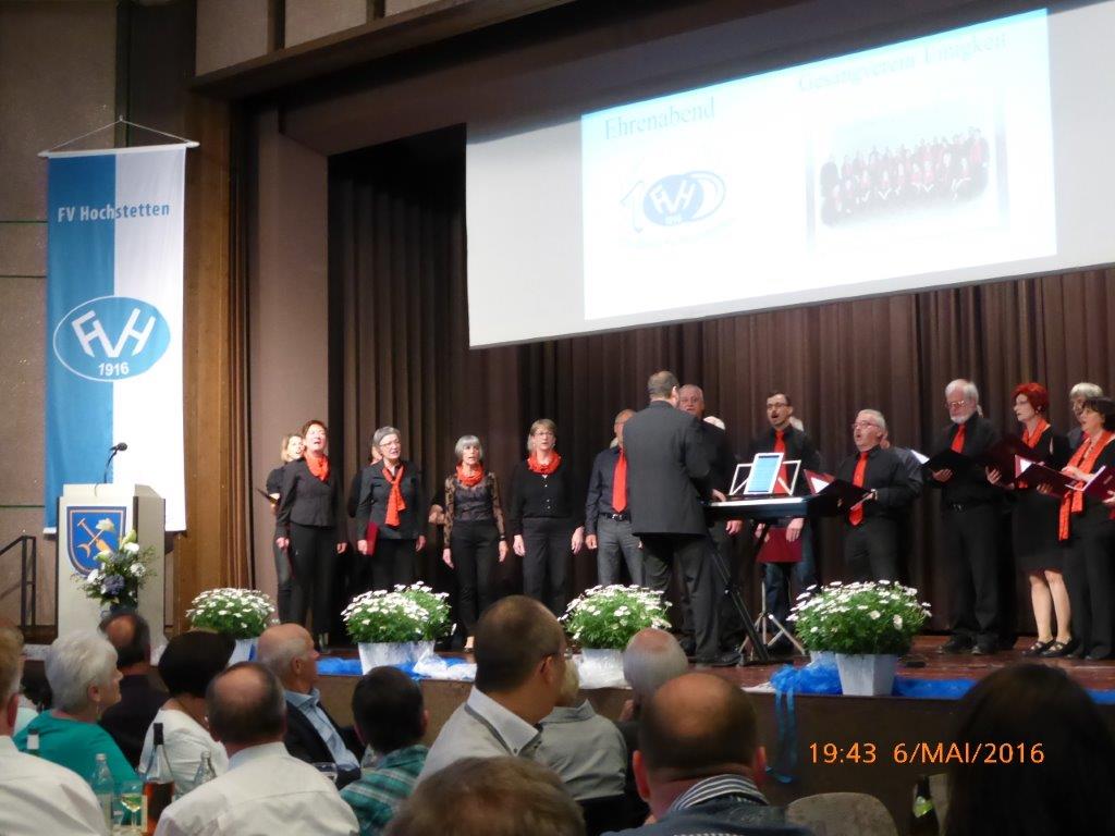 Am Freitag 06.05. fanden wir uns pünktlich um 18.30 Uhr im Bürgerhaus zum Einsingen ein. Wir waren zum Ehrenabend „100 Jahre FVH“ eingeladen, um das Programm mitzugestalten. Es war viel Interessantes über die Historie des Fußballs und der Entstehung des Fußballvereins Hochstetten zu erfahren. Unser Chor lockerte die beiden Programmteile mit weit bekannten Schlagern auf, was man an der Begeisterung und Beteiligung des Publikums ablesen konnte. Auch andere Formationen und Abordnungen stellten sich gekonnt vor.