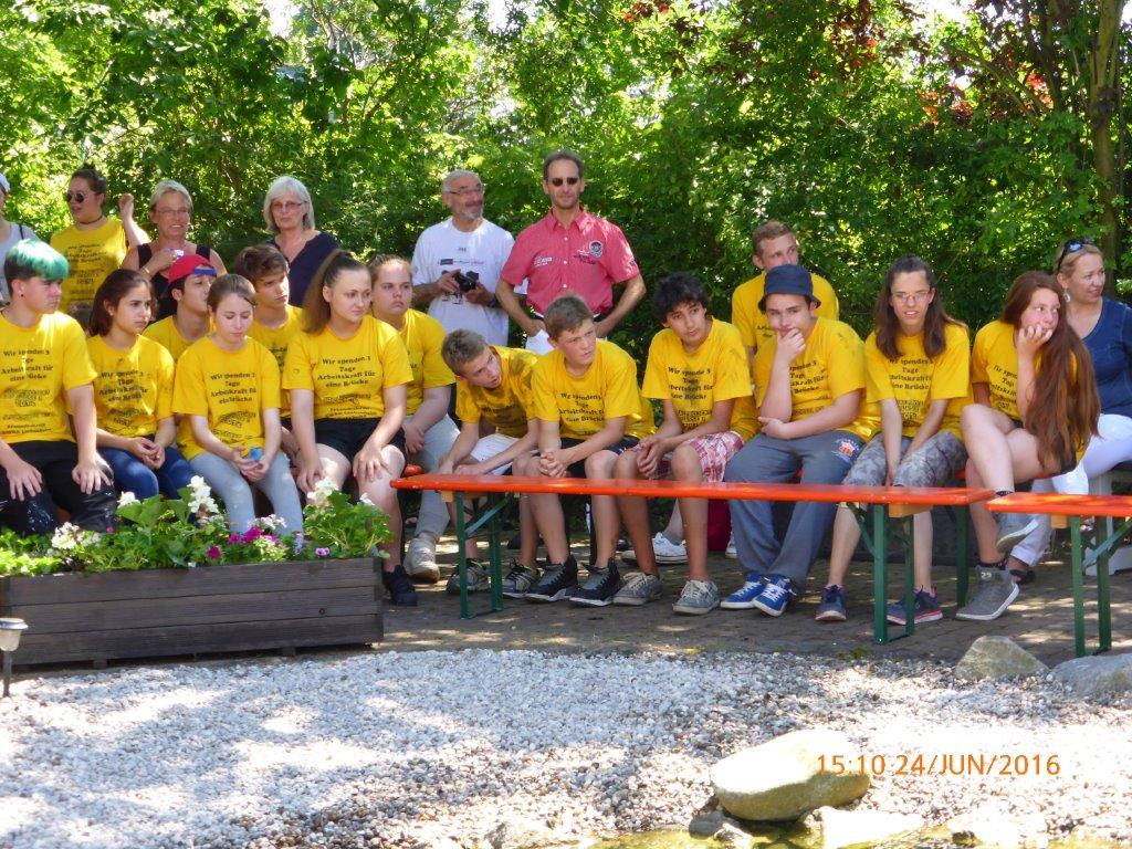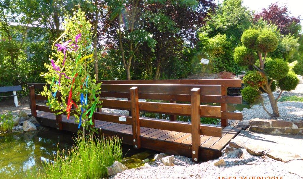 Voller Engagement hatten Werkrealschüler mit Hilfe einer Zimmerei in einer 72-Stunden Aktion eine Holzbrücke für den Teich des Seniorenheims gebaut – eine tolle Leistung, gut gemacht. Die Klassenlehrerinnen begleiteten ihre Schützlinge souverän bei diesem Projekt, und die Schirmherrin Frau Dr. Müller-Reinartz hatte zur Freude der „kleinen und großen“ Eisfans einen Eiswagen aufs Gelände bestellt. Nach den Reden und Dankesworten sämtlicher Initiatoren wurde die Brücke eingeweiht. Waldemar Schütz war sichtlich gerührt und bedankte sich bei allen Verantwortlichen und bei unserem Chor für den überraschenden und gelungenen Auftritt. Auch wir hatten unsere Freude dabei zu sein und bedanken uns ebenso, für die Gastfreundschaft mit Eis und erfrischenden Getränken.
