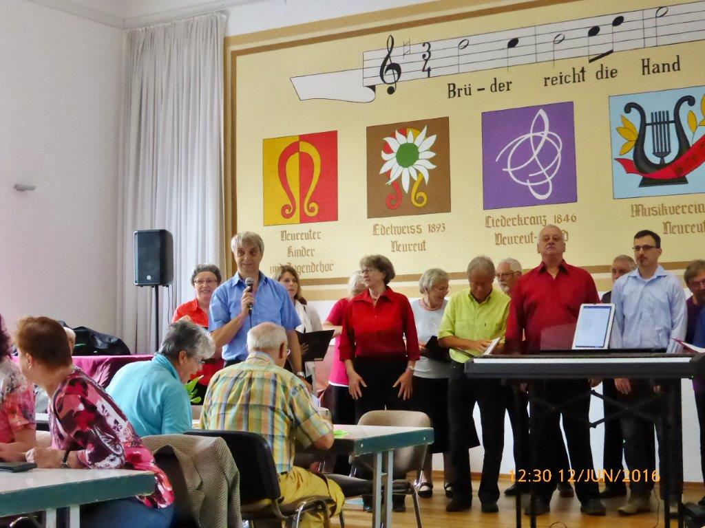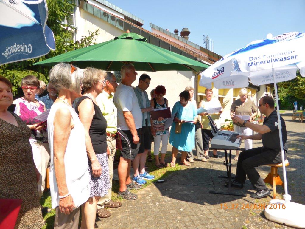 mit diesem Lied und zwei anderen umrahmte unser Chor am vergangenen Freitag die Einweihung der Waldemar-Schütz-Brücke im Altenheim der Geschwister-Nees-Stiftung. Trotz schwüler Hitze hatten sich genügend Sängerinnen und Sänger eingefunden und auch unserem Dirigenten Aldo Martinez war es möglich zu kommen um uns am Klavier zu begleiten.