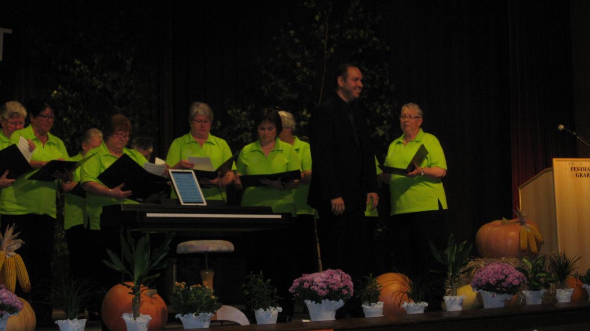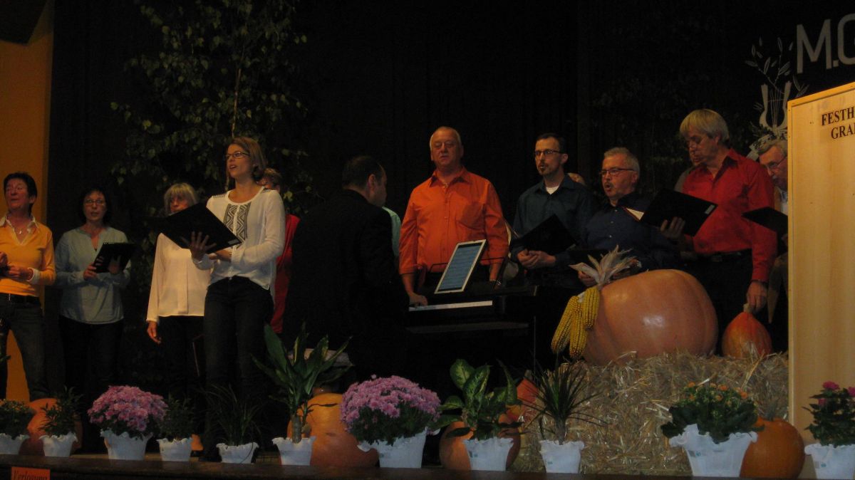 Am Samstag 08.10. hatten wir unseren ersten Auftritt in der laufenden Herbstsession (noch drei weitere Auftritte folgen) beim Weinlesefest der Eintracht Graben. Da einige von uns zum gleichzeitig stattfindenden Konzert des Sängerbundes Linkenheim wollten, durften wir als erster von insgesamt sieben Chören unsere Vorträge darbieten. Gut eingesungen brachten wir unsere Lieder: Welche Farbe hat die Welt, Schau auf die Welt, Only You und Goodnight, well it´s time to go in (O-Ton Aldo Martinez) hervorragender Qualität rüber, was uns auch der Beifall des Publikums bestätigte. Dabei hatten wir auch eine Premiere. Unsere jüngste Sängerin Kristin Günther bot ihre erste Solopartie. Bei dem Lied "Goodnight, well it´s time to go" sang sie erstmals die Solopassagen vor Publikum und das alles ohne spürbares Lampenfieber und in hervorragender und überzeugender Art und Weise - die Zuhörer waren begeistert.
