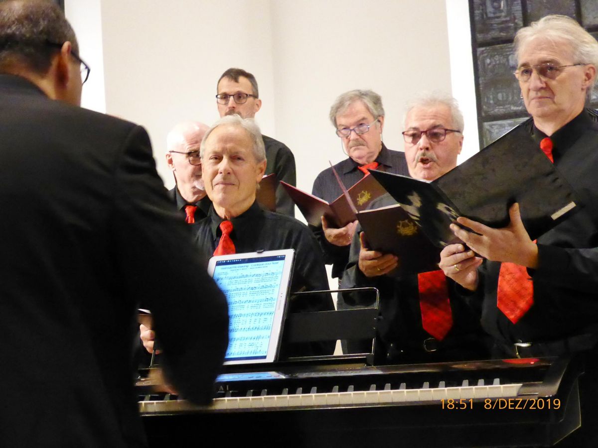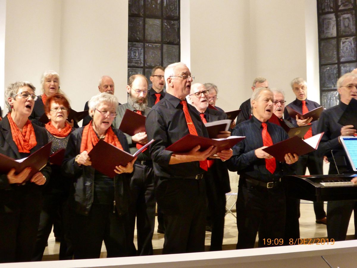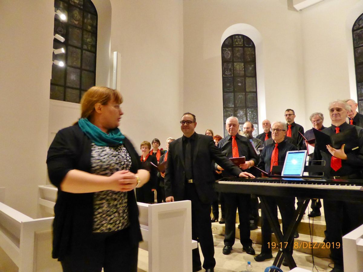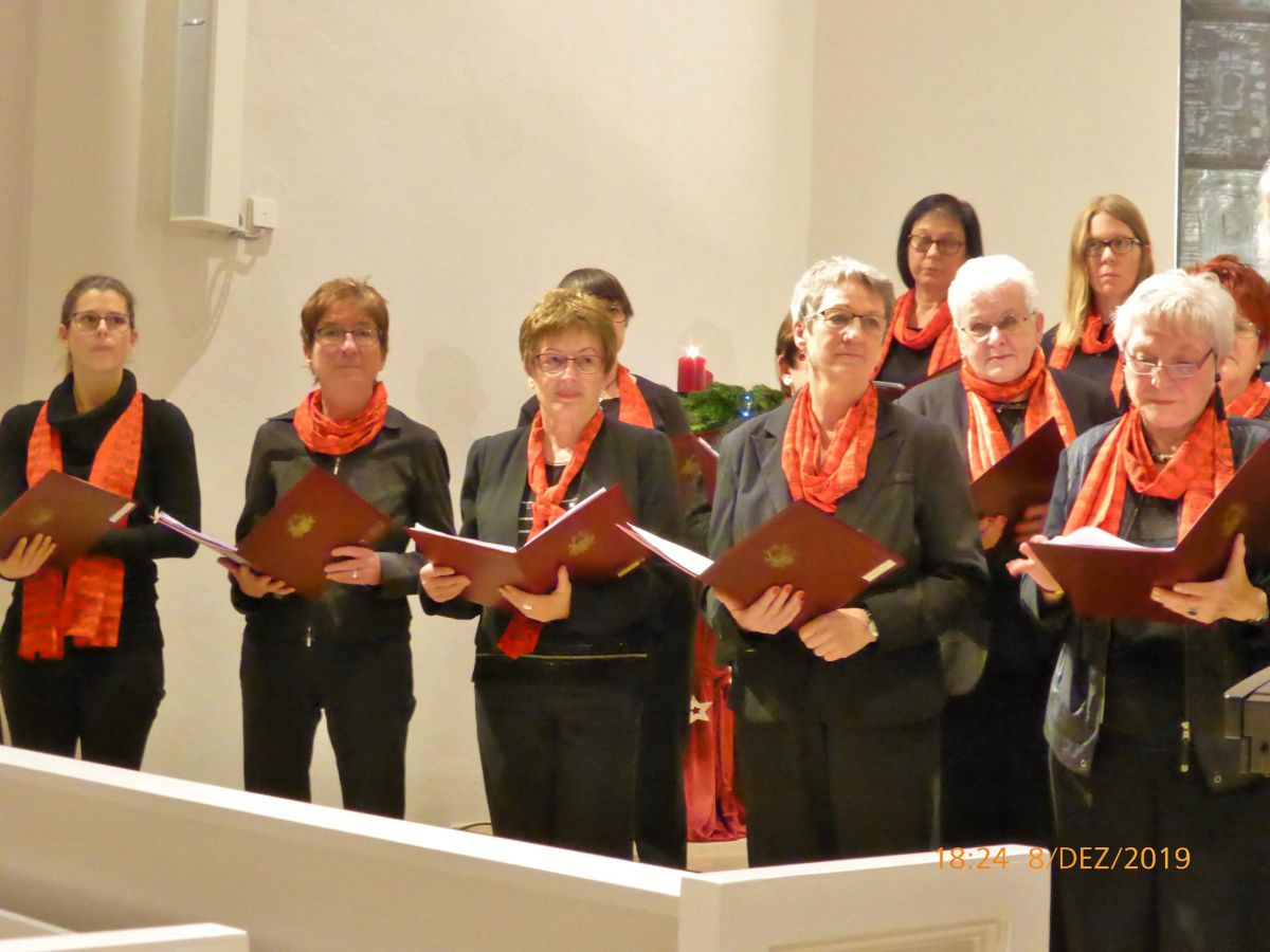 Am Sonntag, 08.12. trafen wir uns um 15.30 Uhr in der wunderschön renovierten Evangelischen Kirche in Hochstetten zur Stellprobe und zum Einsingen. Vor dem Konzert gab es noch eine Erfrischung im evangelischen Gemeindehaus und pünktlich um 17.00 Uhr begann unser Auftritt in der gut besuchten Kirche. Pfarrerin Frau Gholamvisy begrüßte alle Anwesenden herzlich und kündigte auch die jeweiligen Lieder mit ein paar passenden Sätzen an. Es war eine bunte Mischung aus zwölf deutschen und internationalen Liedern, alten und modernen Melodien, die sicher vielen bekannt waren. Dabei waren „Weihnachtszeit, Kinderzeit“, das „Trommellied“, „The first Nowel“, „Feliz Navidad“ und „Calypso Gloria“. Unsere Solistinnen Heidi Winter und Kristin Günter beeindruckten mit „Have yourself a merry little Christmas“ und „Still, still, still“ und Rainer Ritz hatte den Solopart beim „Weihnachts-Gesang – Cantique pour Noel“, alles sehr gut vorgetragen – bravo! Viel zu schnell war das Konzert vorüber, wie auch Pfarrerin Gholamvisy bemerkte. Sie überreichte unserem Dirigenten Aldo Martinez ein kleines Präsent und bedankte sich beim Chor für diesen schönen Auftritt. Statt Eintritt wurde eine Spende zu Gunsten der Kirchenrenovierung erbeten, dafür haben wir uns gerne eingesetzt. Wir bedanken uns auch bei Frau Gholamvisy und bei allen Besuchern unseres Benefizkonzerts, es war uns eine Freude hier aufzutreten.
