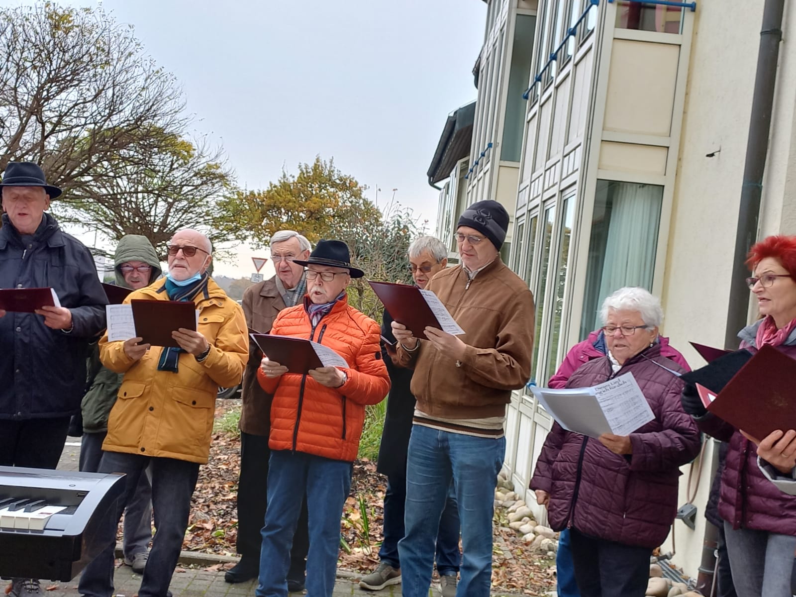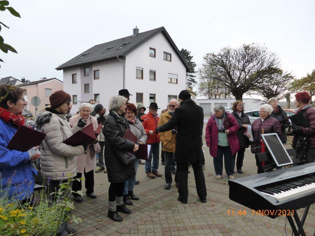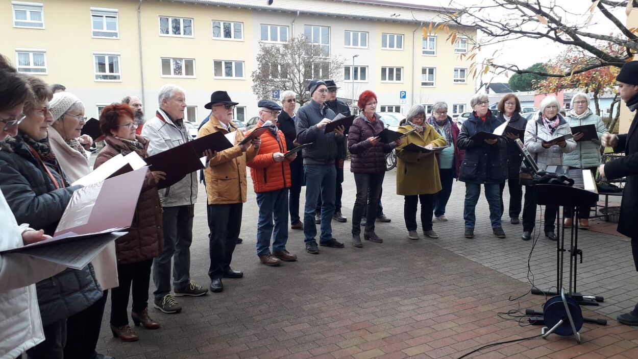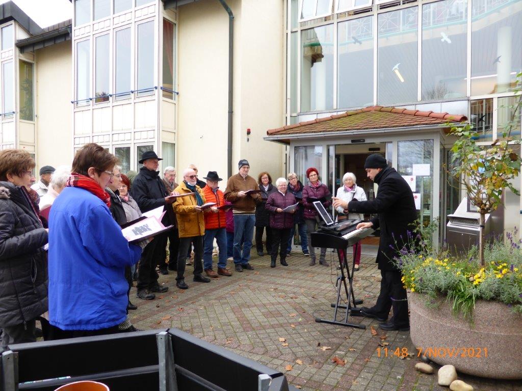 Pünktlich trafen die Sängerinnen und Sänger am Sonntag 07.11. vor dem Altenheim ein. Es war geplant, dass wir einmal vor dem Heim und einmal auf der Rückseite des Hauses singen würden, damit uns möglichst viele Bewohner zuhören konnten. Corona bedingt durften wir das Haus nicht betreten, aber ein Auftritt sollte trotzdem möglich sein. Das Ganze war natürlich auch wetterabhängig, aber wir hatten Glück, es gab keinen Regen, nur Kälte. Wir haben deshalb ganz schön gebibbert, vielleicht manche auch etwas vor Aufregung, war es doch unser erster Auftritt nach langer Zeit. Katja Schwarz begrüßte uns im Namen des Hauses und gab uns das Zeichen zum Beginn, nachdem die Bewohner entsprechend zum Zuhören positioniert waren.