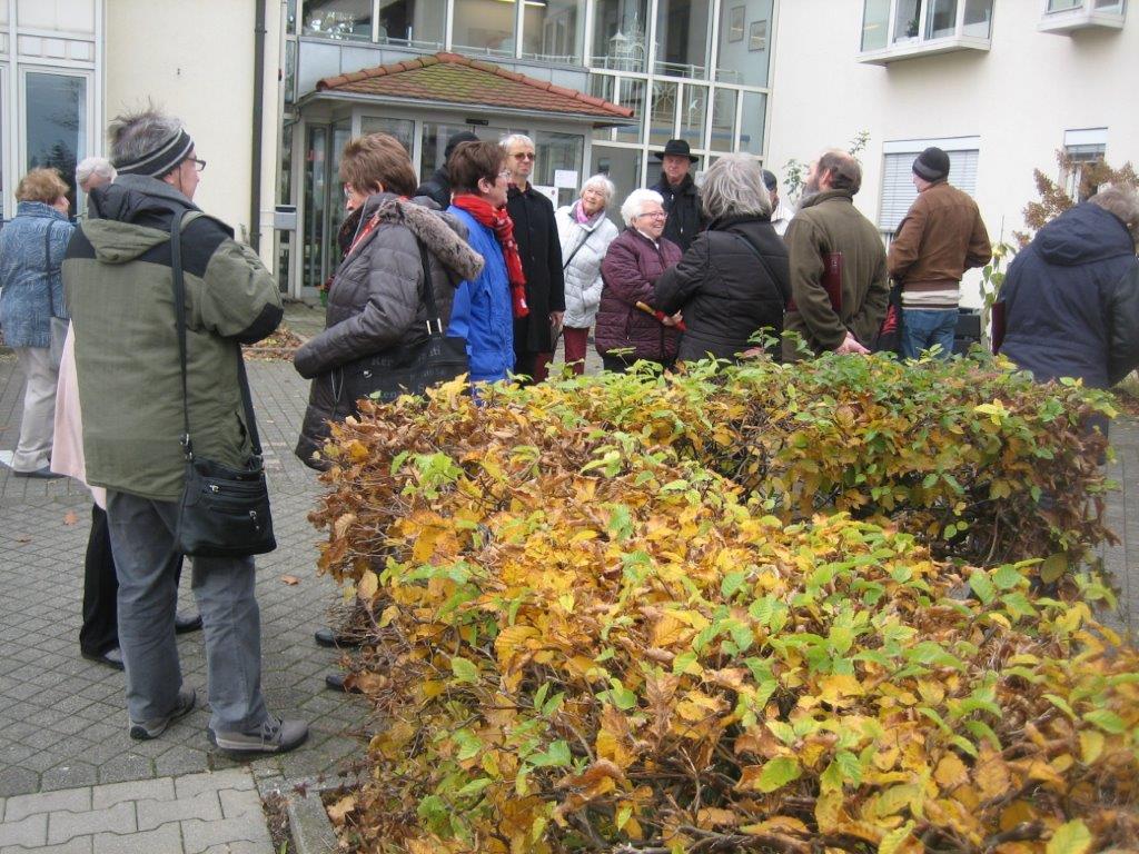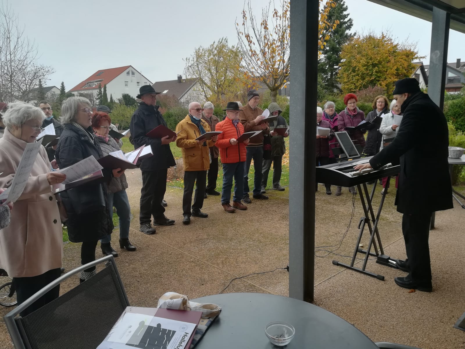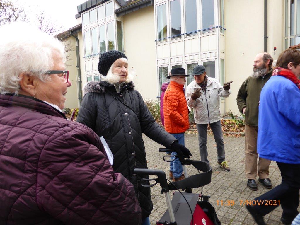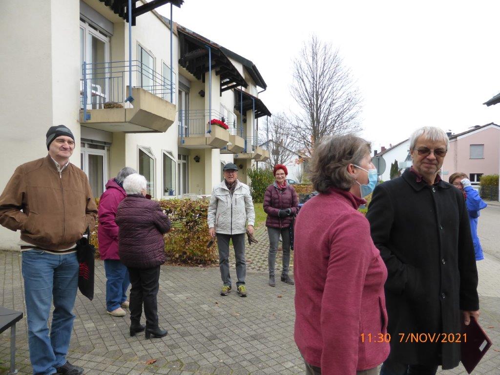 Pünktlich trafen die Sängerinnen und Sänger am Sonntag 07.11. vor dem Altenheim ein. Es war geplant, dass wir einmal vor dem Heim und einmal auf der Rückseite des Hauses singen würden, damit uns möglichst viele Bewohner zuhören konnten. Corona bedingt durften wir das Haus nicht betreten, aber ein Auftritt sollte trotzdem möglich sein. Das Ganze war natürlich auch wetterabhängig, aber wir hatten Glück, es gab keinen Regen, nur Kälte. Wir haben deshalb ganz schön gebibbert, vielleicht manche auch etwas vor Aufregung, war es doch unser erster Auftritt nach langer Zeit. Katja Schwarz begrüßte uns im Namen des Hauses und gab uns das Zeichen zum Beginn, nachdem die Bewohner entsprechend zum Zuhören positioniert waren.