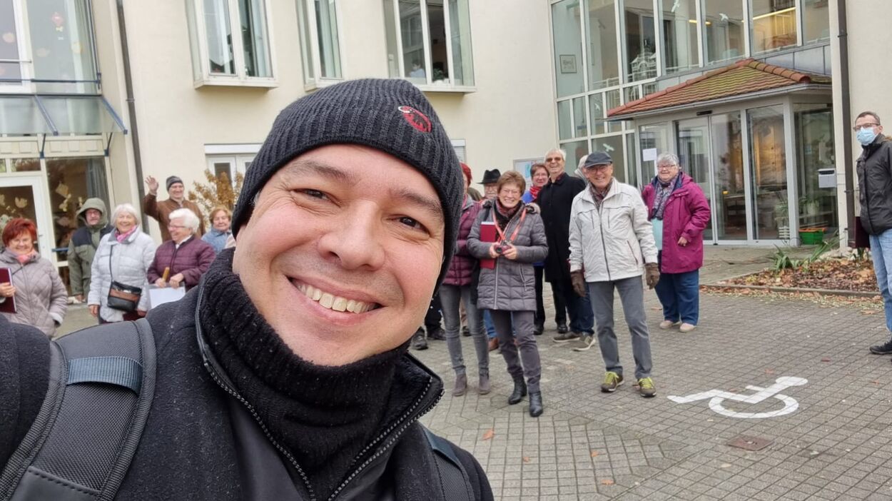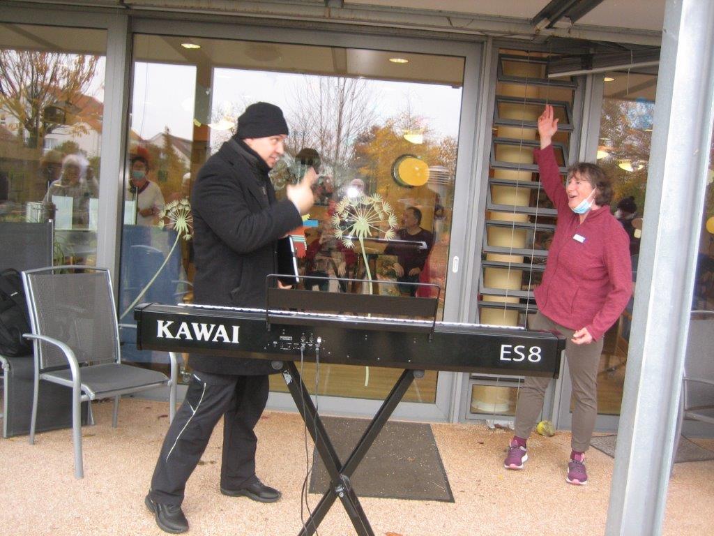 Mit Freude sangen wir unsere vier Lieder, die wir freitags in der Singstunde noch einmal intensiv geübt hatten und als Zugabe hatten wir noch das Hallelujah von Leonard Cohen dabei. Wir haben alles auf jeden Fall gut umgesetzt und unser Dirigent Aldo Martinez, der uns auf dem Klavier begleitete, war sehr zufrieden mit uns. So war die Freude beiderseits, einmal für die Bewohner und einmal für uns. Katja Schwarz hatte uns beim letzten Lied begleitet, als begeisterte Sängerin war das ein Muss und sie bedankte sich herzlich für unseren Auftritt. Bringt das doch auch etwas Abwechslung für die Heimbewohner in dieser anstrengenden Pandemiezeit.