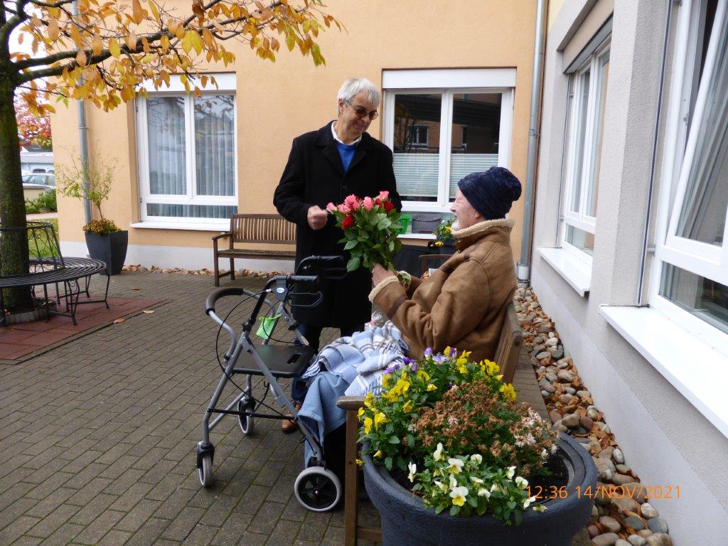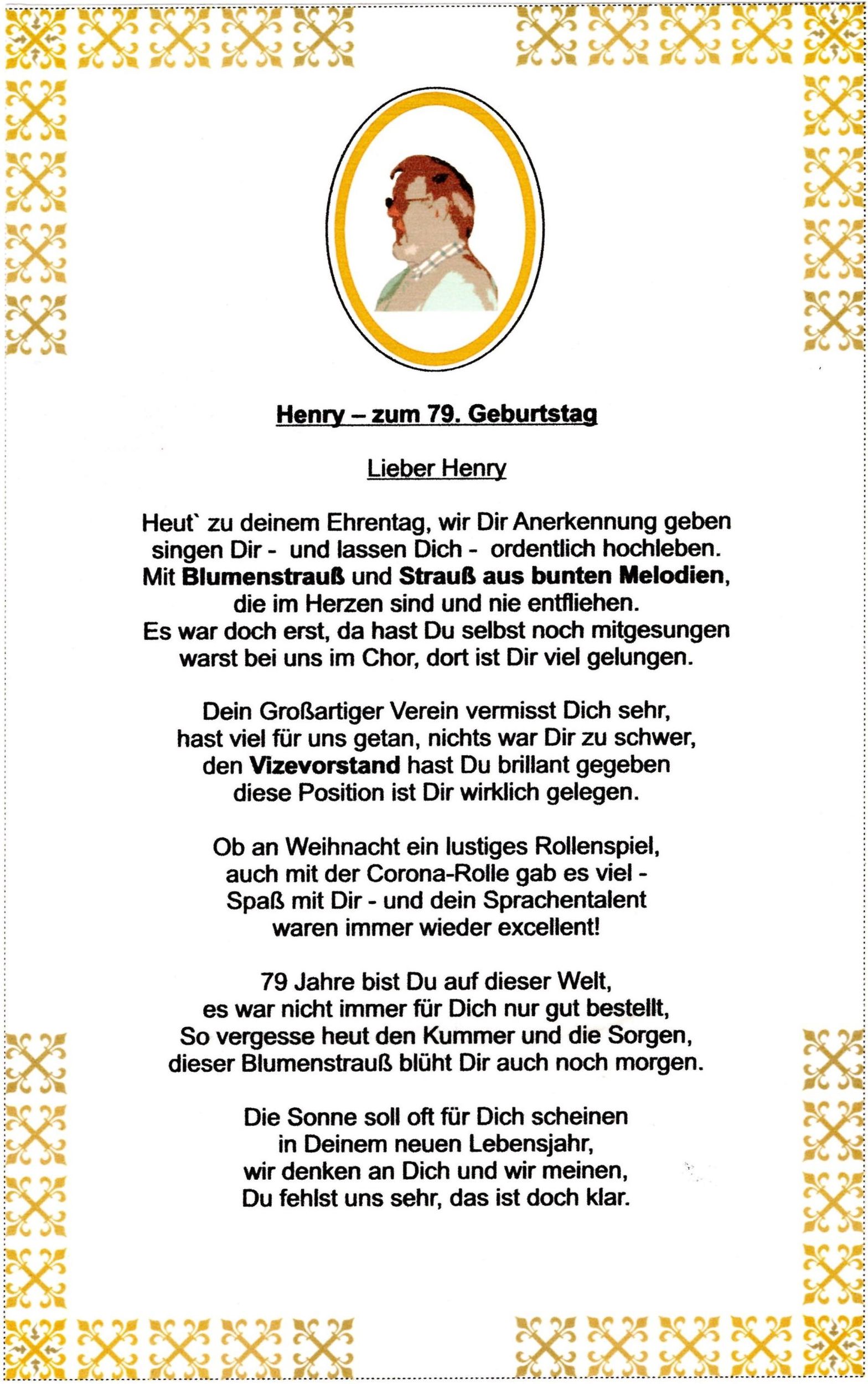 stand dann am Sonntag an. Pünktlich trafen die Sängerinnen und Sänger vor dem AWO-Seniorenzentrum Hardtwald in Eggenstein ein. Rosi war bereits bei Henry vor Ort und brachte den Jubilar vor das Heim, da wir, Corona bedingt, nicht ins Haus durften. Er nahm dort auf einer Bank Platz und wurde von unserem Vorstand Klaus Reinhardt begrüßt und beglückwünscht, bevor wir, in Begleitung unseres Dirigenten Aldo Martinez, mit dem Geburtstagslied den Melodienstrauß für Henry eröffneten. Es waren neue Lieder, aber auch Lieder dabei, die Henry noch mit uns gelernt hat und er freute und bedankte sich bei uns. Klaus Eichsteller las Henry noch ein treffendes Gedicht vor, mit vielen herzlichen Wünschen von seinem „Großartigen Verein“, wie Henry den Chor der Einigkeit immer nannte. Dabei hat auch er selbst immer Großartiges für unseren Verein geleistet, als 2. Vorstand, nichts war ihm da zuviel und er war großzügig und auch immer für jeden Spaß zu haben. Rosi hatte noch Rosen besorgt und jede Sängerin durfte Henry mit einer Rose gratulieren. So bekam er einen Melodienstrauß und einen Rosenstrauß verehrt, mit ganz herzlichen Wünschen von uns allen, auch von denen, die nicht dabei sein konnten. Es war auch anderen Bewohnern möglich unsere Lieder zu hören, was allen sichtlich Freude machte und auch berührte. Ein Dank war uns gewiss und die Freude war ganz unsererseits. Vielleicht lässt sich so ein Auftritt nochmal wiederholen, wir sind gern dabei.
