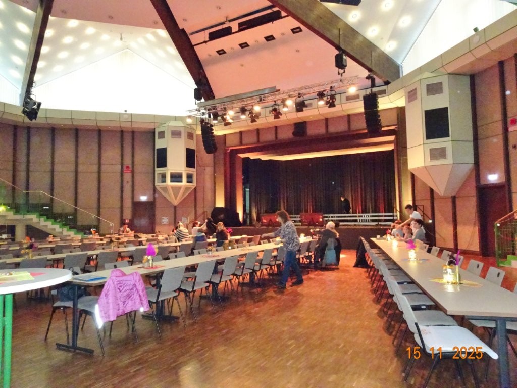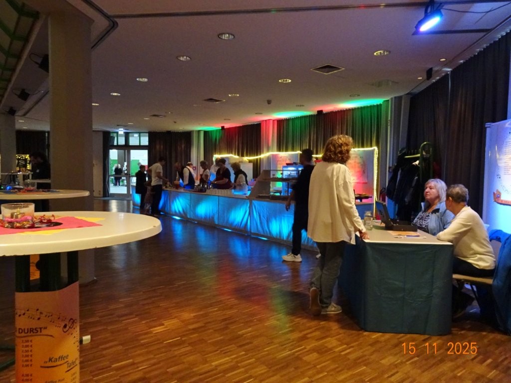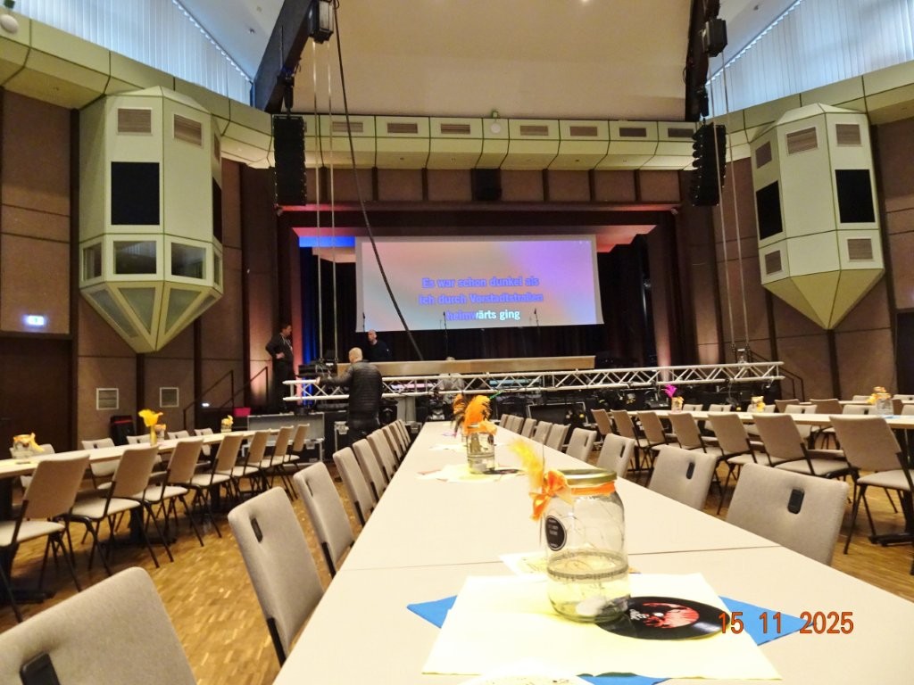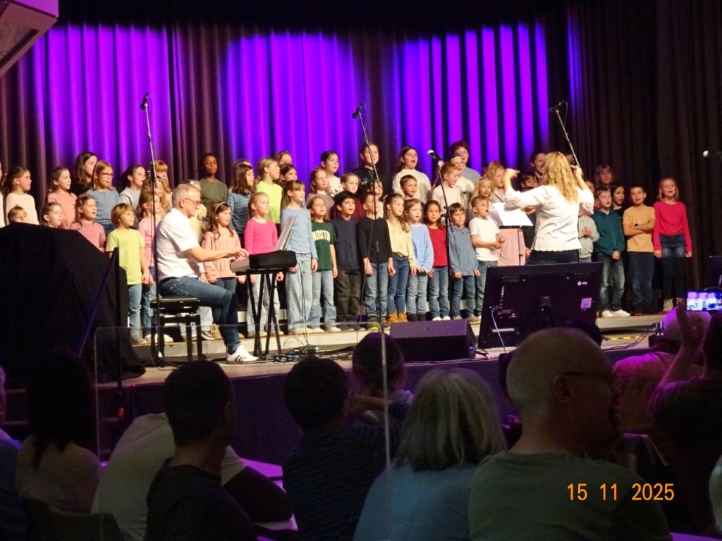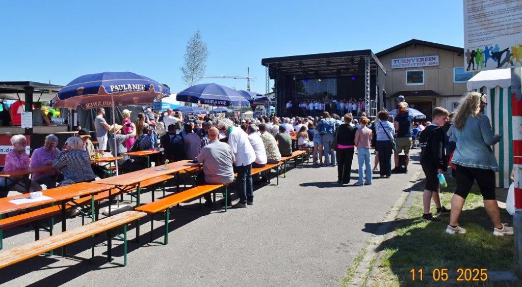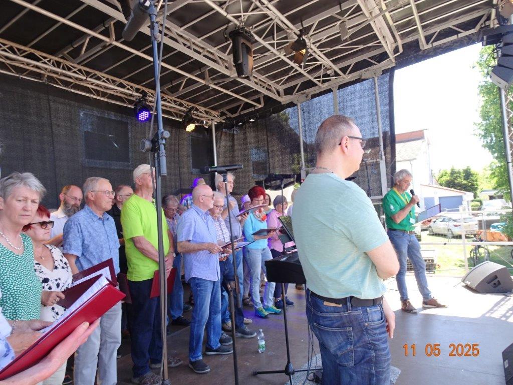 Im Vorfeld wurde fleißig geprobt, auch für ein gemeinsames Lied mit unserem Bruderverein GV-Sängerbund Linkenheim - der Miteinandertag konnte kommen. Die teilnehmenden Vereine hatten sich ins Zeug gelegt, um ein schönes Event zu bieten, voran der GV Sängerbund, der zum Miteinander geladen hatte. Freitags und samstags wurde im Bürgerhaus fleißig gewerkelt, um alles einladend zu richten. Samstags füllte sich die Kuchentheke mit leckeren Kuchen und Torten und in der Küche wurden Brötchen und Wurstsalat gerichtet, um für das leibliche Wohl der Anwesenden zu sorgen. Ab 15.00 Uhr bot die KuGel ein Programm für Kids und ab 15.30 Uhr war dann der Grundschulchor Hochstetten mit seiner Chorleiterin Frau Bamberger auf der Bühne. Sie verstand es meisterhaft, die 60 Kinder bei den Liedvorträgen zu führen und deren Begeisterung war förmlich zu spüren – bravo! Gegen 18.00 Uhr waren dann unsere zwei Vereine mit insgesamt vier Chören zu hören. Der Frauenchor des Sängerbund startete, gefolgt vom Männerchor, die sich mit modernen, überwiegend englischen Songs bestens präsentierten. Danach folgte unser Chor mit Grönemeyers „Mambo“, „Ein Lied kann eine Brücke sein“ und dann das Fusionslied zu unserem Gemeinde-Jubiläum mit dem eigens umgedichteten Text von „Solang man Träume noch leben kann“. Der Neutralität halber hat hier unser Grabener Sänger Klaus Eichsteller gedichtet – vielen Dank Klaus!