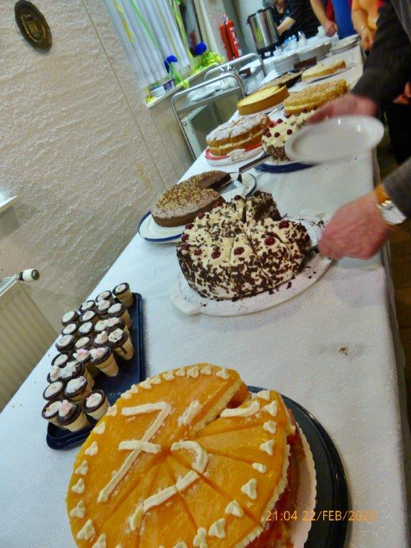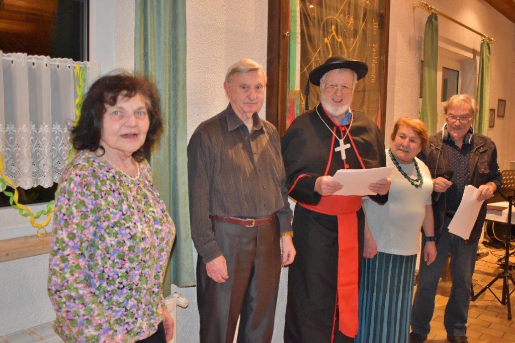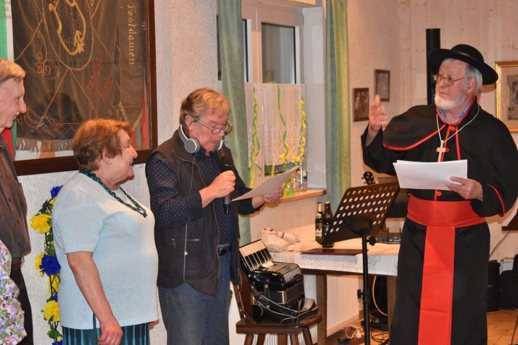 Rainer Ritz brachte für Christa Lang ein Solo: „Es löscht das Meer die Sonne aus“. Berührend vorgetragen und mit viel Beifall belohnt! Später kam noch ein Abgesandter aus Rom, der vom Vatikan die besten Glückwünsche und ein Geschenk überbrachte. Unübertrefflich unser Henry Delincée in prächtiger Robe und bestem Italienisch und Klaus Eichsteller als Dolmetscher daneben. Die Gäste hatten unbändigen Spaß an dem Sketch, der mit dem Refrain „Time to say goodbye“, von allen gesungen, endete. Vielen Dank ihr Beiden. Inzwischen war das Kuchenbuffet eröffnet, ein Kompliment an die Bäckerinnen für die feinen Backwerke!
