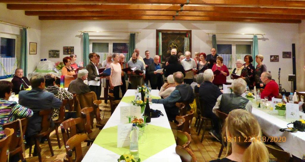 Am Samstag 22.02. waren wir zu einer besonderen Geburtstagsfeier eingeladen. Christa Lang, Christa Jung-Wittiger und ihr Mann Wilfried feierten ein gemeinsames Geburtstagsfest - zusammen kommen sie auf 232 Jahre. Die Geburtstagswunschlieder mussten wir a capella singen, da unser Dirigent leider verhindert war. Diesen Part übernahm Heidi Winter, die dafür kurzfristig eine andere Feier verließ um uns zu dirigieren – vielen Dank Heidi.