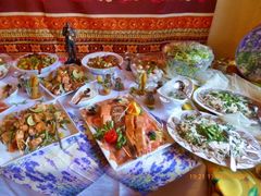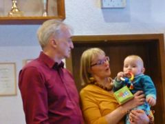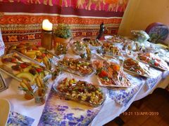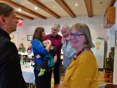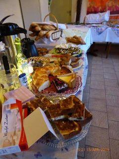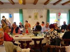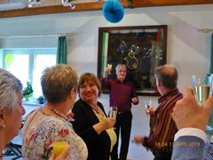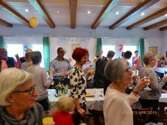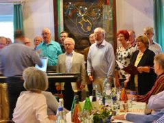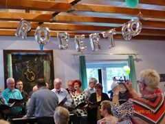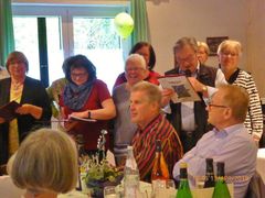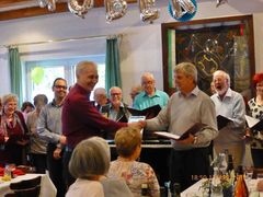 Robert hieß seine Gäste willkommen und als am frühen Abend die ganze Gesellschaft komplett war, wurde mit Sekt auf den Jubilar angestoßen und unser Chor stellte sich auf, um für Robert zu singen. Mit viel Gefühl wurden das Hallelujah, Weit weit weg, You raise me up und Welch ein Geschenk ist ein Lied vorgetragen. Das Sängerheim war erfüllt von dem überwältigenden Klang und so freuten sich die Zuhörer auf eine Zugabe, die wir mit Eres tu perfekt darboten. Klaus Eichsteller verlas ein selbstverfasstes Gedicht für Robert und unser Vorstand Klaus Reinhard überreichte dem Jubilar mit Glückwünschen das Geschenk des Vereins. Robert bedankte sich herzlich für alles und erklärte dann das Mediterrane Buffet für eröffnet. Da konnte man nur staunen: eine Vielfalt an Vor- und Hauptspeisen, da war für jeden Geschmack etwas dabei und man konnte nach Herzenslust schlemmen. Das I-Tüpfelchen waren dann noch verschiedene Desserts - ein Gedicht.