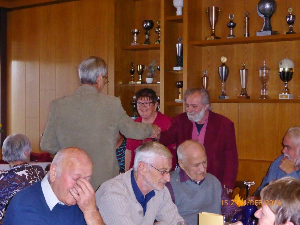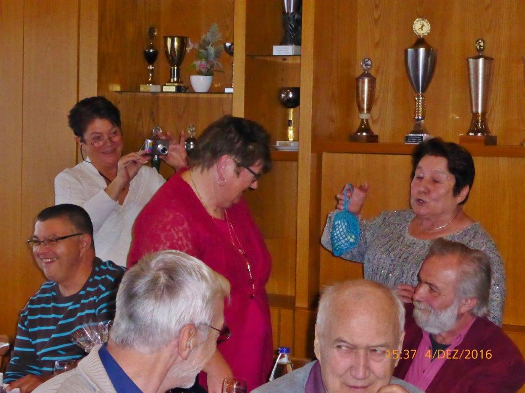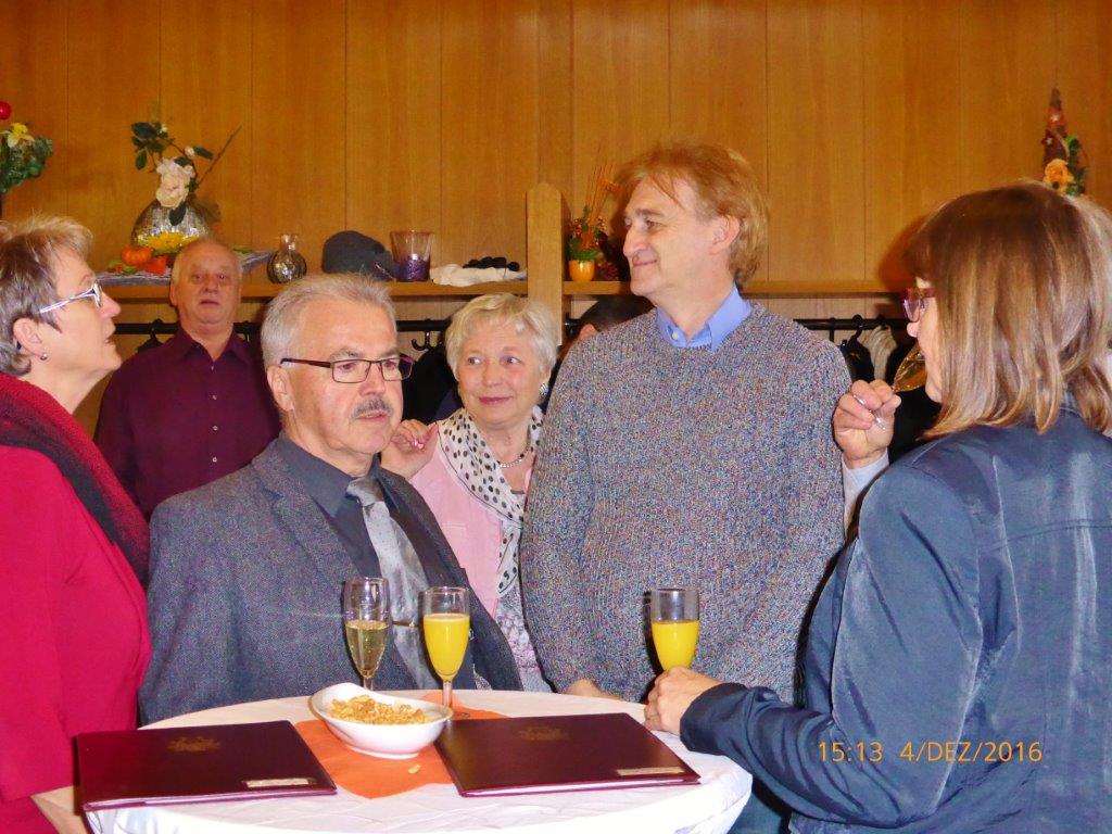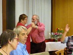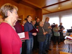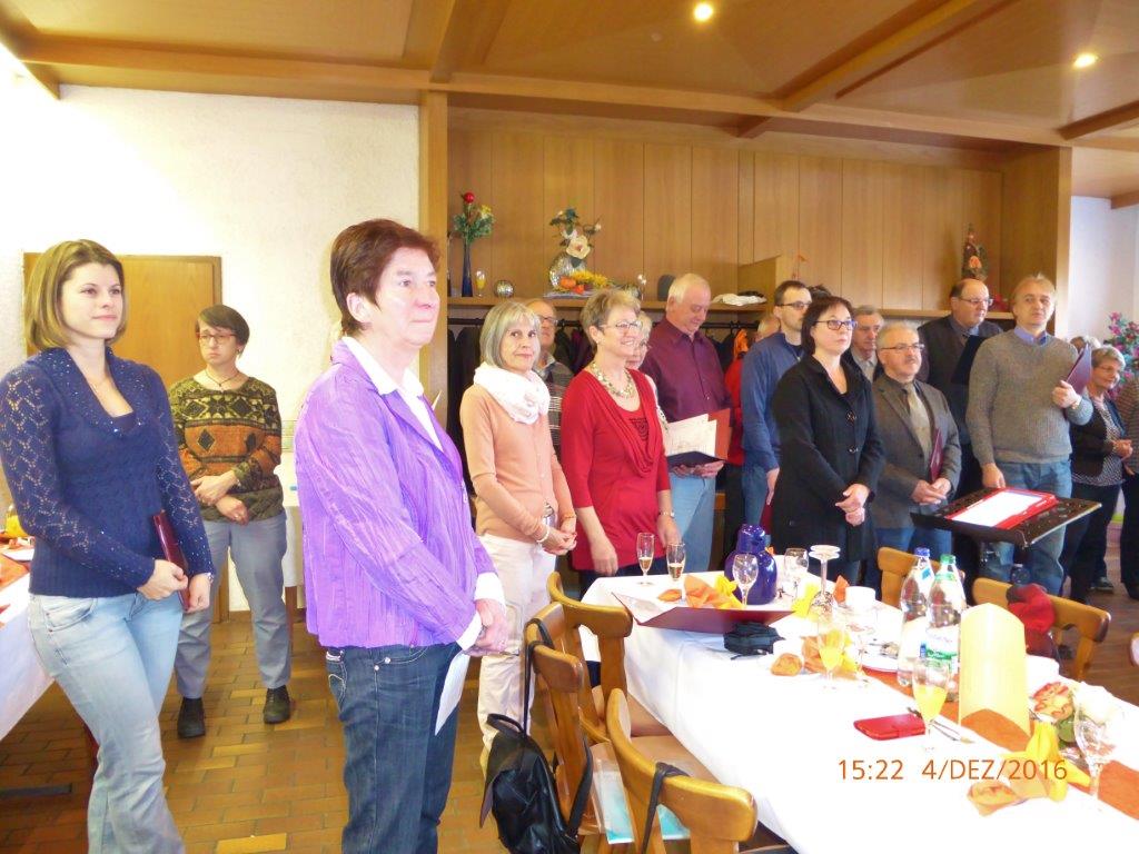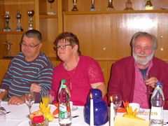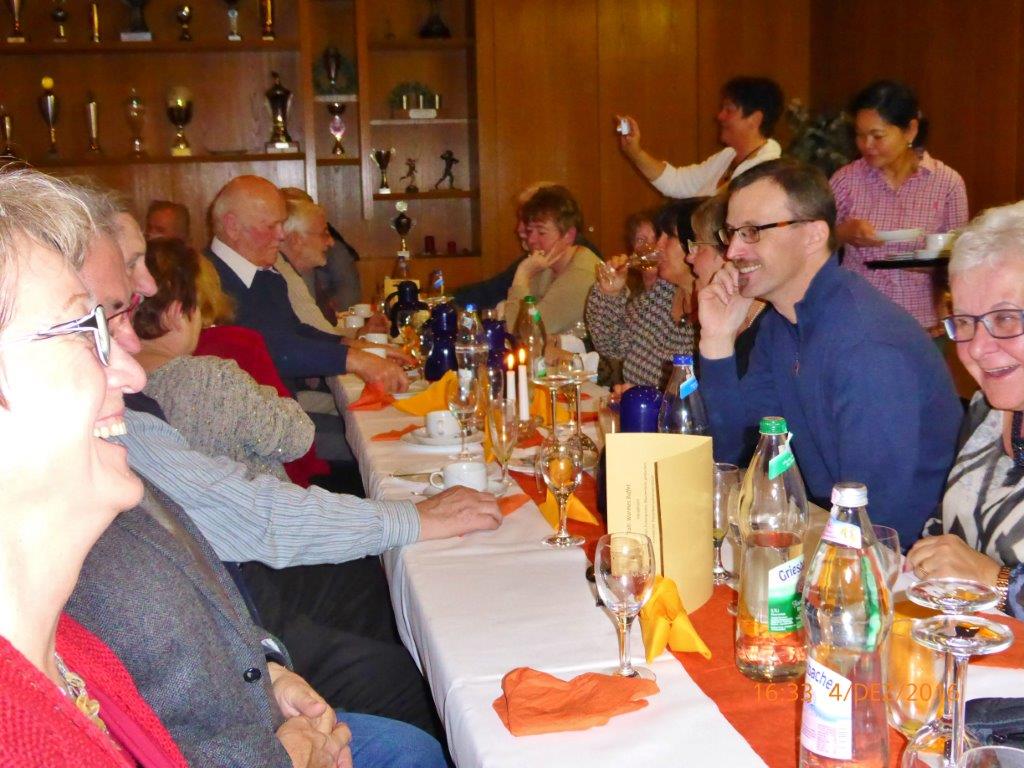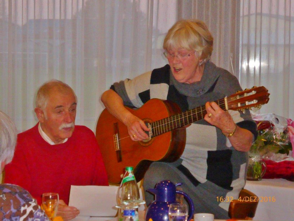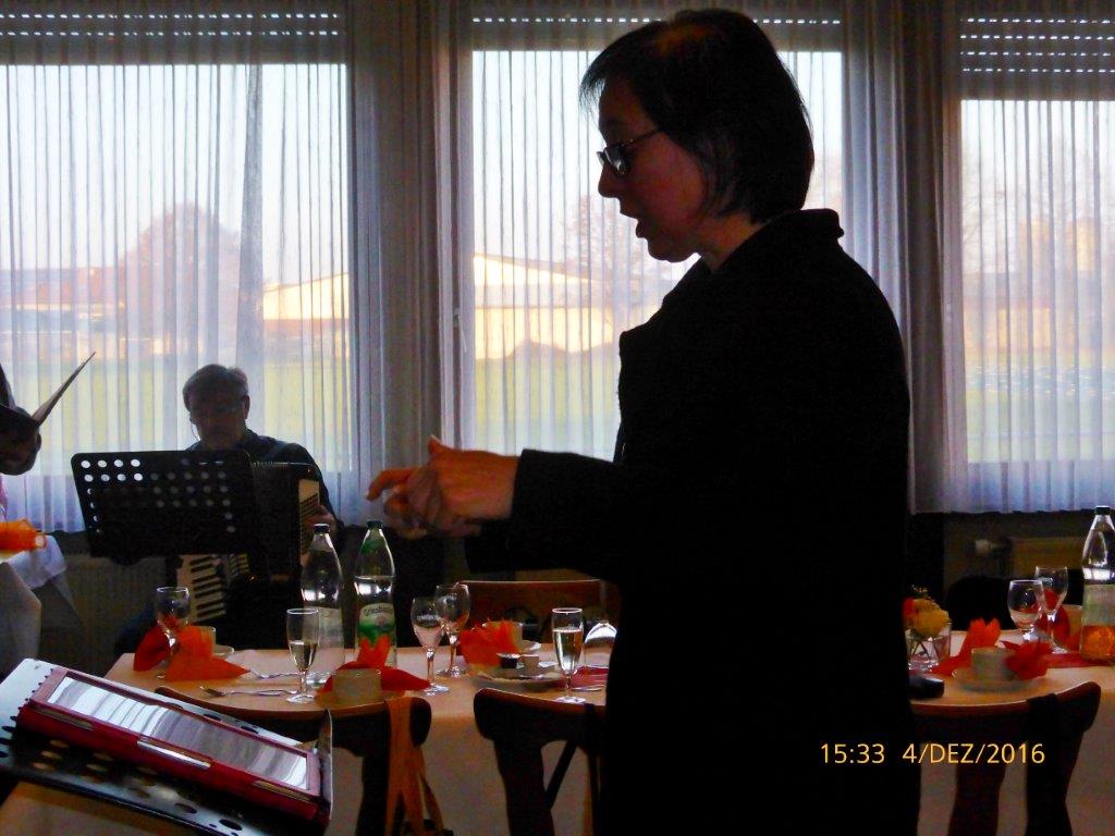 Am Sonntag 04.12. wurde die „gute Seele“ unseres Vereins, Brigitte Lang 70 Jahre alt und wollte das mit „ihrem Verein“ feiern. Einige Tage zuvor hatten sie und ihr Mann Günter auch noch Goldene Hochzeit und somit einen weiteren Feiergrund. Um 15.00 Uhr traf die Sängerschar im Turnhallenresaurant ein. Erstmalig unter dem Dirigat unserer Sängerin Heidi Winter und mit Akkordeonbegleitung unseres Sängers Klaus Eichsteller, sangen wir die Wunschlieder für das Jubelpaar. Unser Dirigent Aldo Martinez war leider verhindert, aber er wurde durch Heidi und Klaus sehr gut vertreten und Brigitte bedankte sich begeistert bei uns. Wir durften uns mit leckerem Kuchen und Kaffee stärken und am Abend gab es ein reichhaltiges feines Buffet. Reinhilde und Lothar Fürniß sangen mit uns ein Potpourri aus alten Zeiten und als Klaus Eichsteller aufspielte, wurde sogar getanzt. Hannelore Dürr und Dieter Setzchen nahmen in einem lustigen Sketch bei Brigitte den TÜV ab und schmückten Brigitte mit einem passenden Oldtimer-Kennzeichen. Es war ein fröhliches, gelungenes Fest und hier ein herzlicher Dank an Brigitte und Günter, dass sie uns so verwöhnt haben und an alle Akteure des Festes.