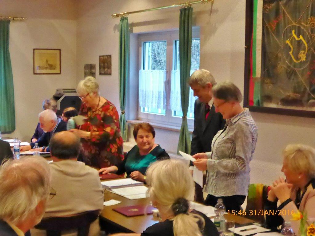 Reinhilde Fürniß verlas im Anschluss gefällig ihren Kassenbericht. Es ist immer interessant was an Einnahmen und Ausgaben so anfällt. Den Kassenprüfbericht trug Christa Lang vor, die zuvor, zusammen mit dem Ortskartellvorsitzenden Reinhard Raetsch, die Kassenprüfung vorgenommen hatte. Klaus König war wieder zur Stelle, um die Entlastung der Hauptkassiererin und des Vorstandes in gekonnter Manier zu übernehmen. Klaus Reinhardt richtete Dankesworte an die Vorstandsmitglieder für die gute Zusammenarbeit und dann die Bitte an Klaus König, dass er wieder das Amt des Wahlleiters übernehmen möchte, was dieser gerne für uns tat.